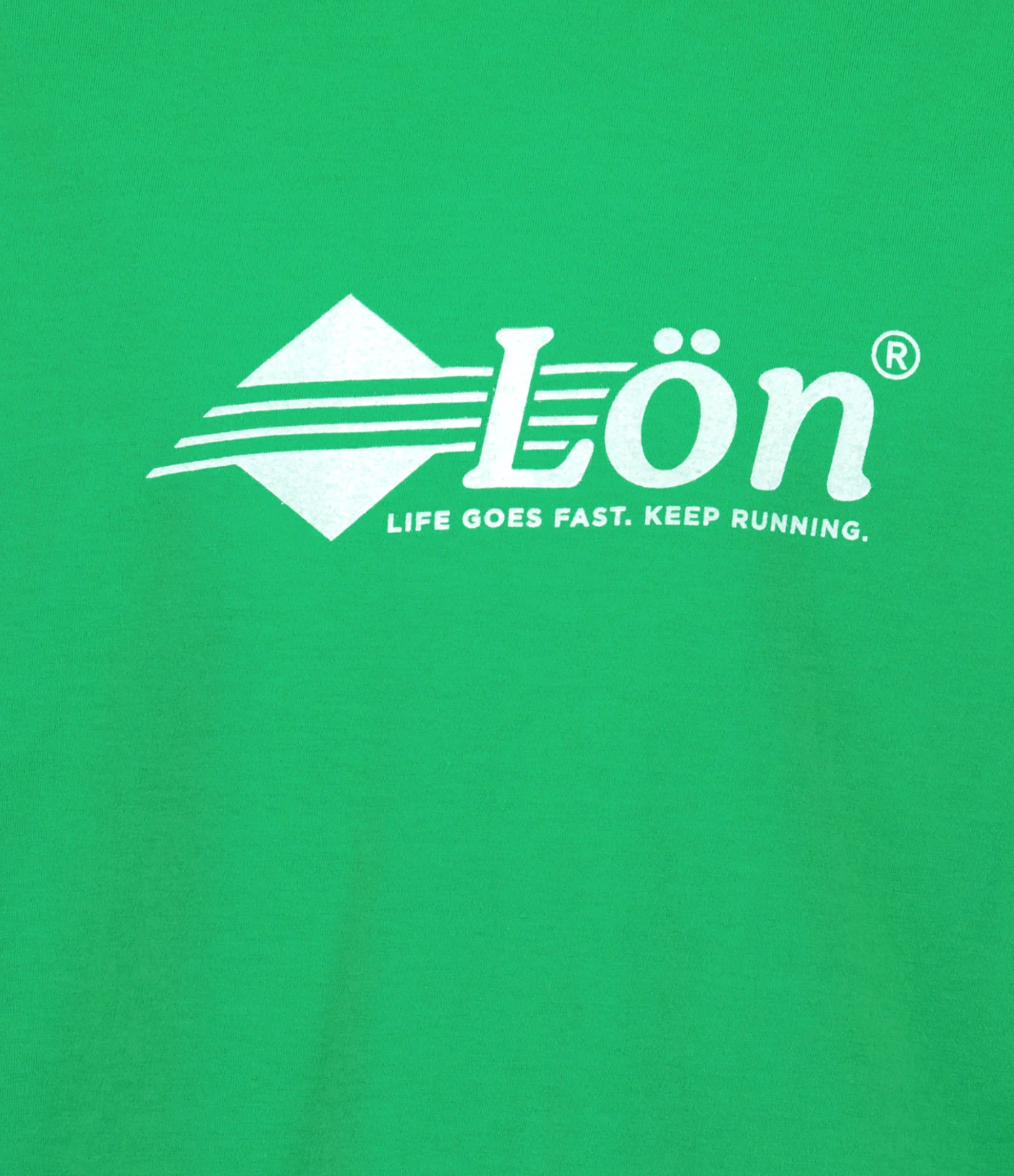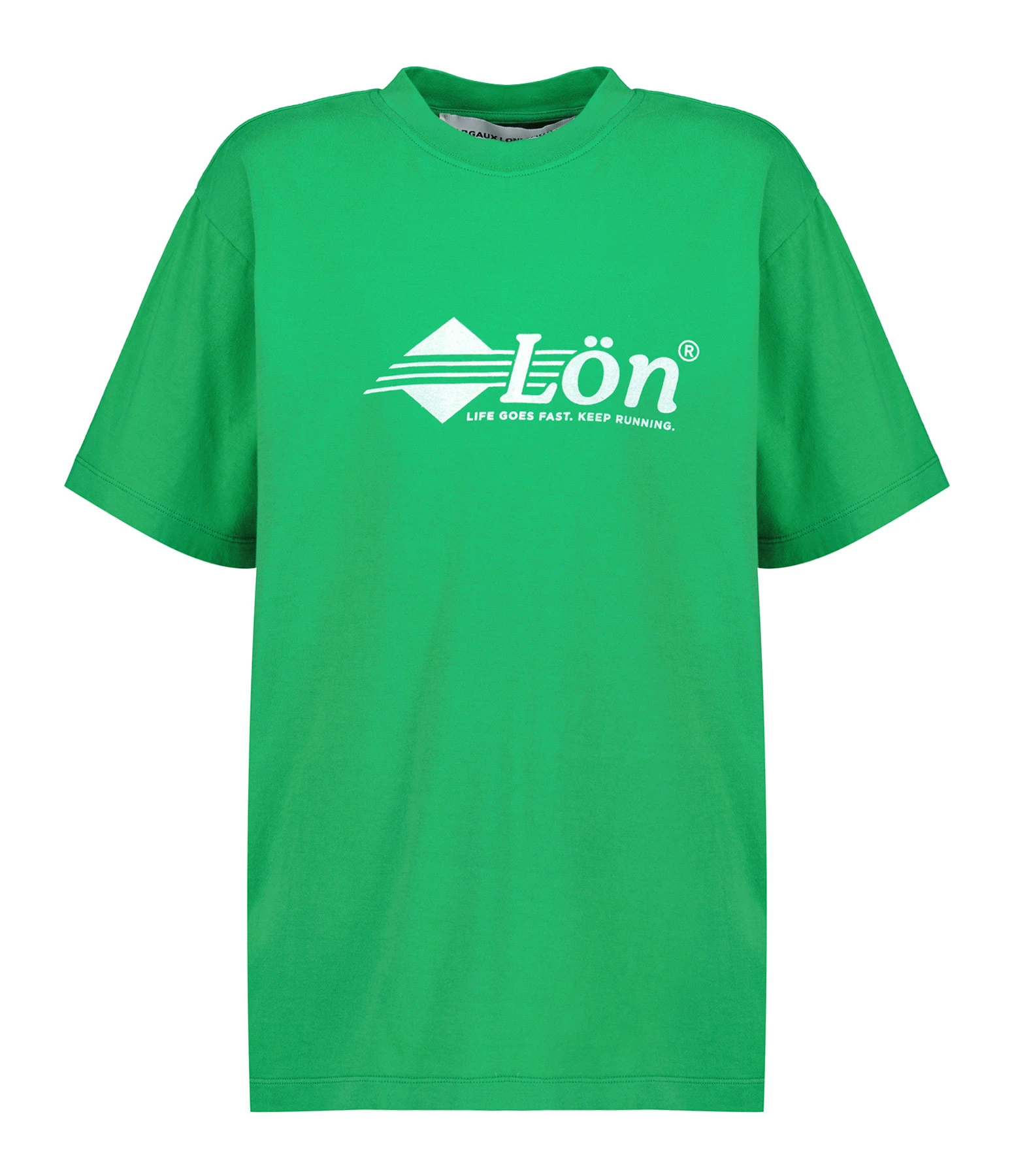 Tee-shirt en coton vert avec logo sérigraphié en blanc sur le devant. Manches courtes. Col rond. Coupe droite. Base droite.