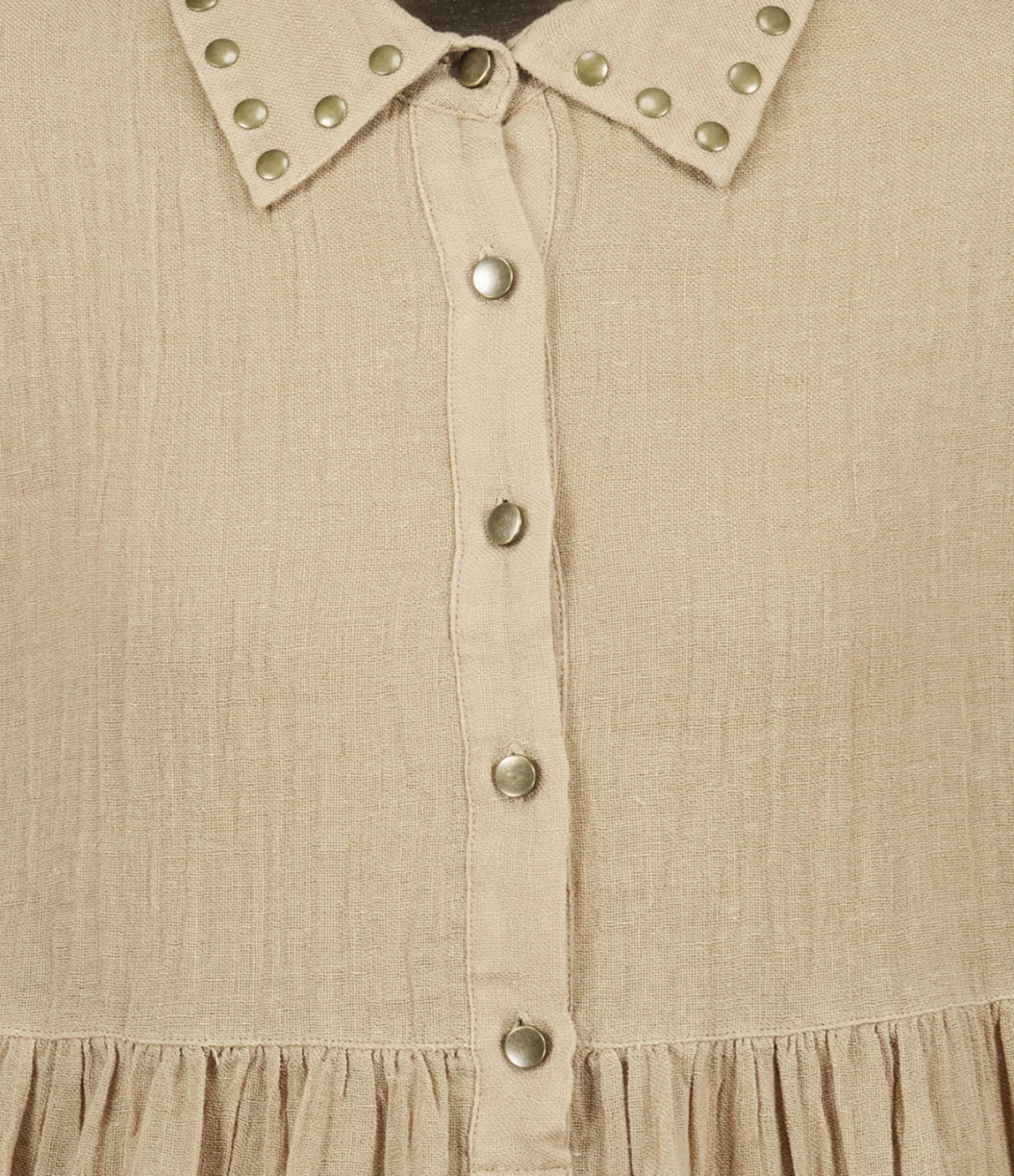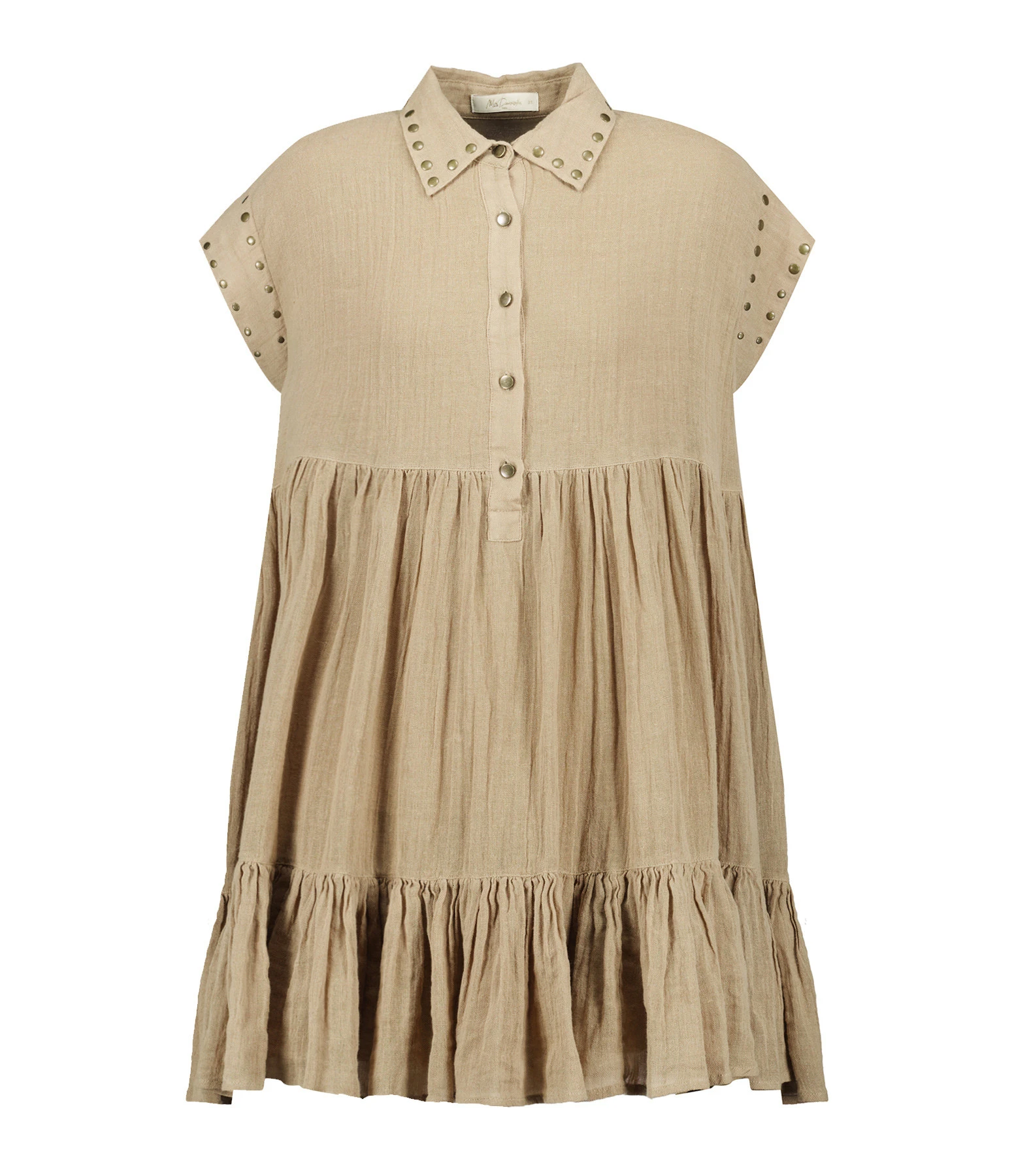 Robe marron à volants sur le bas. Col chemisier clouté. Fermeture par boutons sur le devant. Manches courtes cloutées aux bords. Coupe évasée. Base volantée. Doublée.
