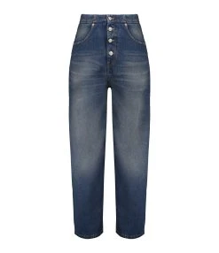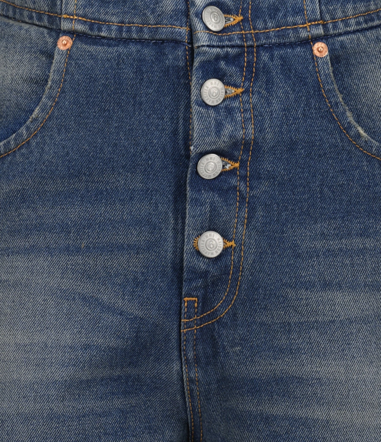 Pantalon en denim de coton bleu délavé dans le dos. Braguette boutonnée avec boutons métalliques argentés. Deux poches italiennes. Deux poches plaquées dans le dos. Coupe boyfriend. Base droite. Effet usé.