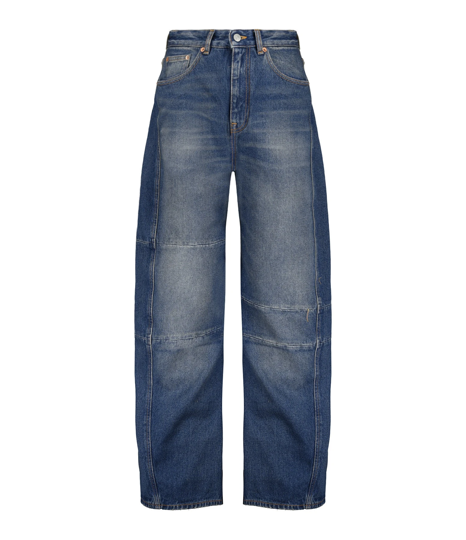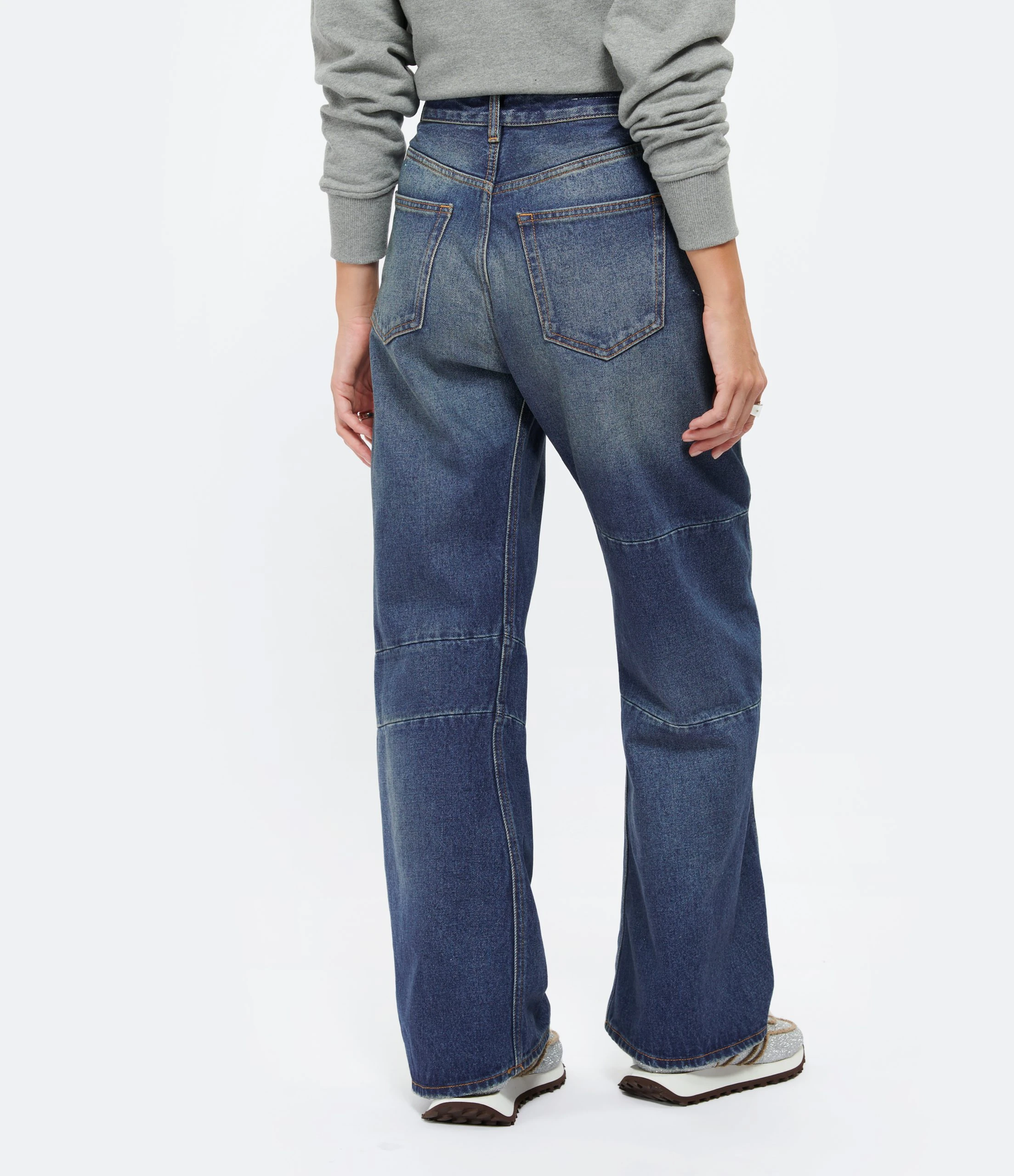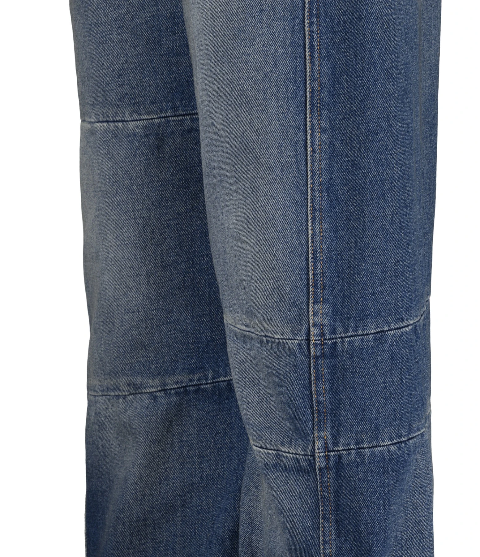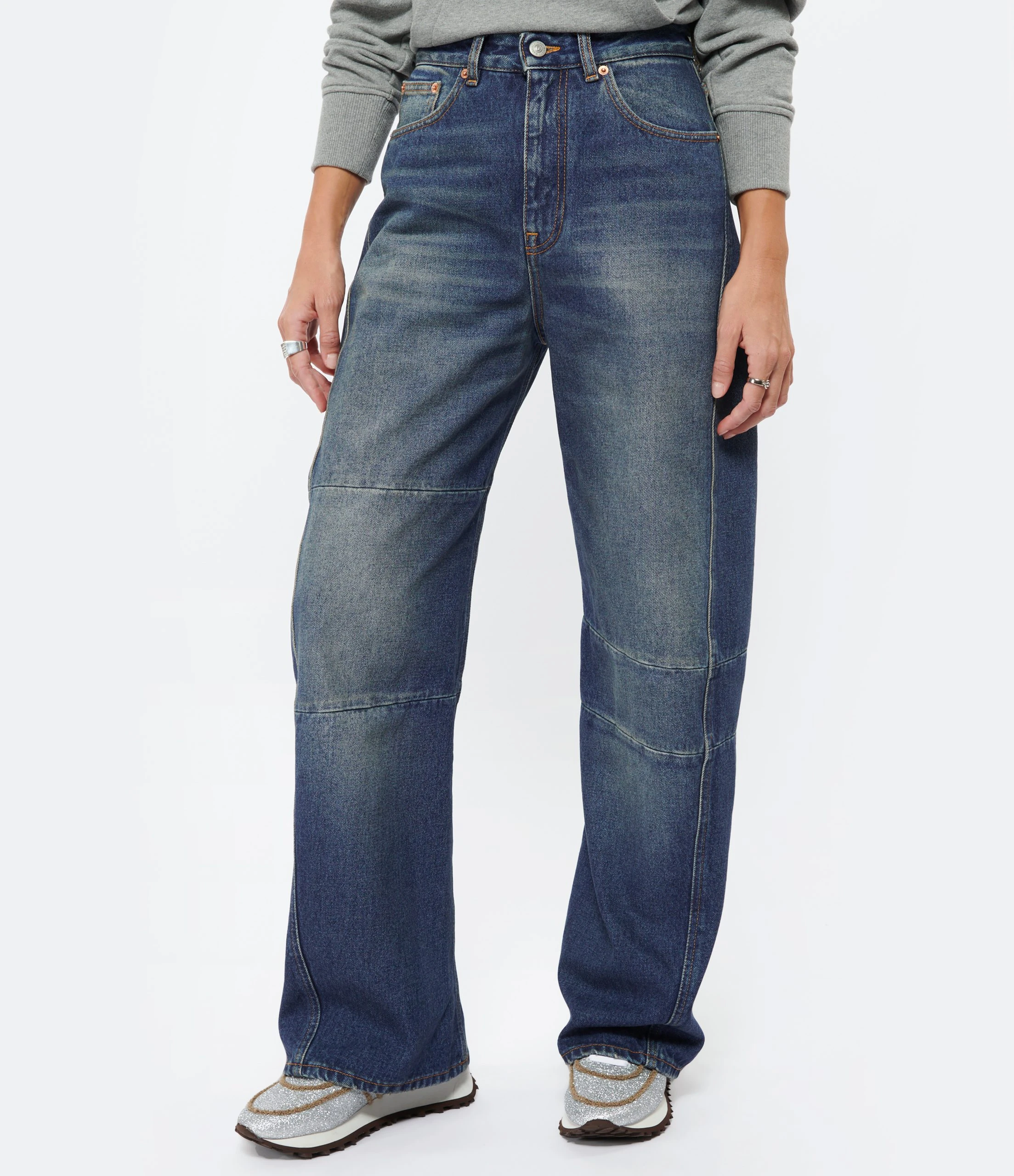 Pantalon en denim de coton bleu délavé. Passants pour ceinture. Braguette zippée et boutonnée. Deux poches italiennes et une poche à gousset. Deux poches plaquées dans le dos. Jeu de couture sur les jambes. Coupe droite. Base droite.