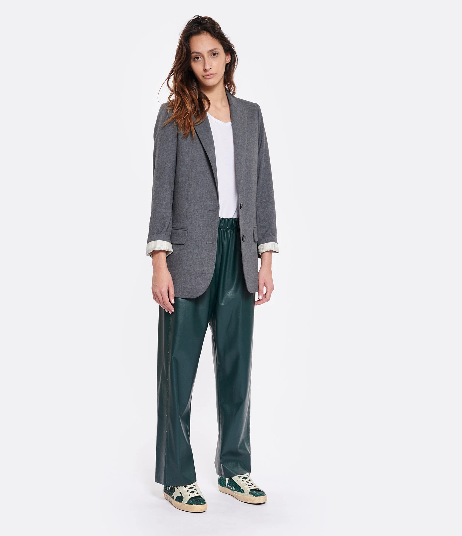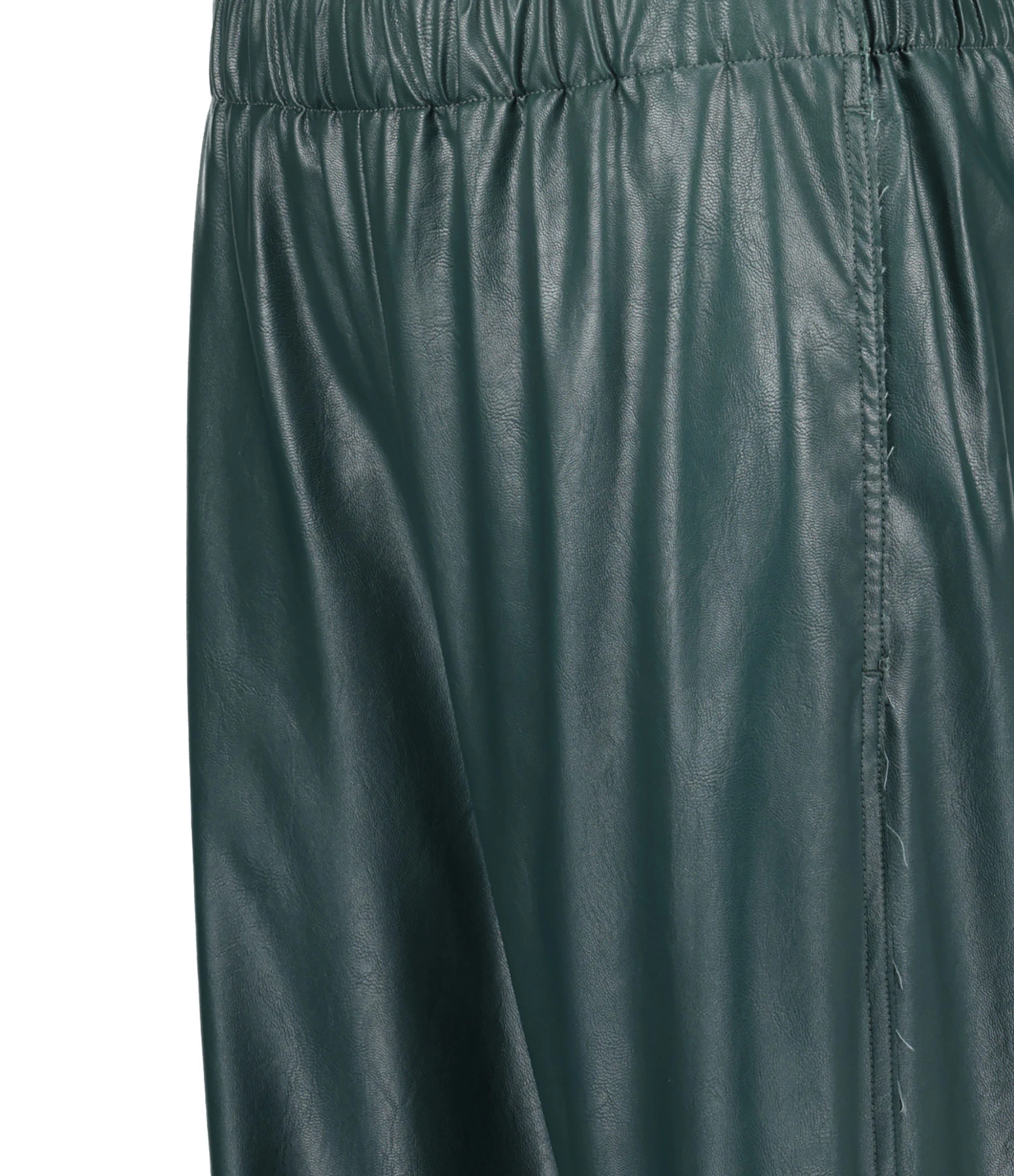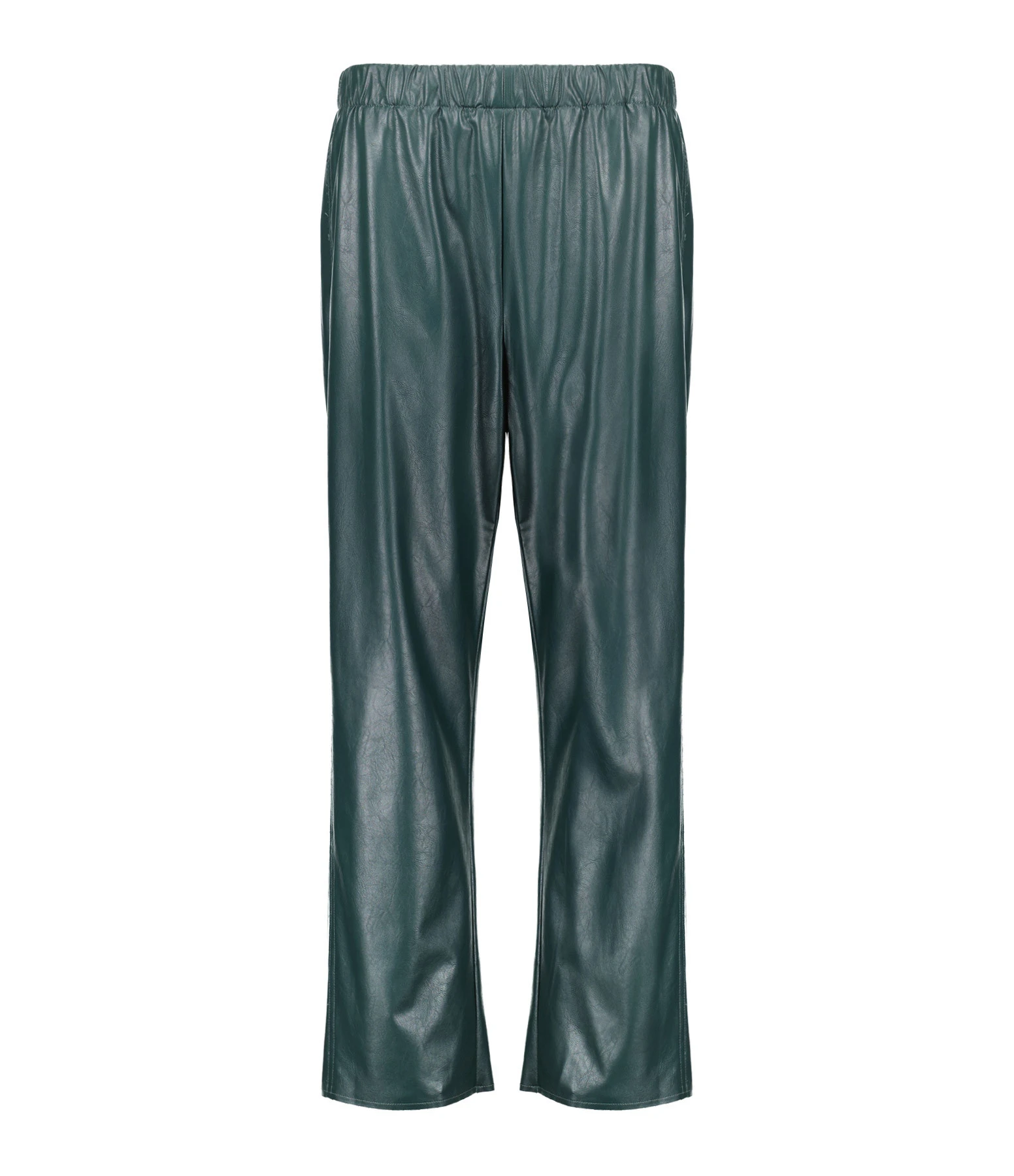 Pantalon en simili cuir vert foncé. Taille élastiquée. Deux poches. Coupe droite. Base droite.