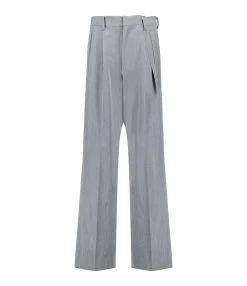 Pantalon de tailleur large gris. Taille haute avec passants pour ceinture. Deux poches à l’avant et une à l’arrière. Fermeture zippée et par crochet invisibles. Coupe droite. Base droite.