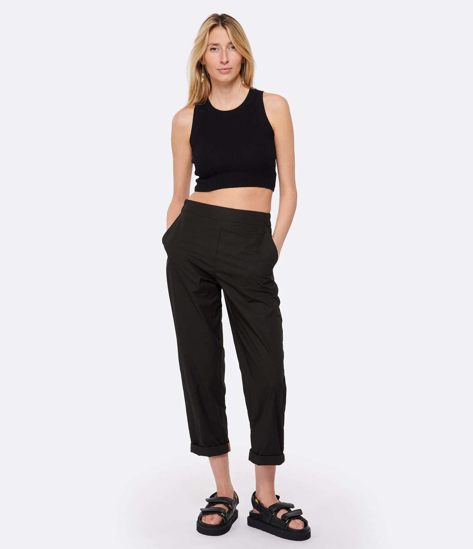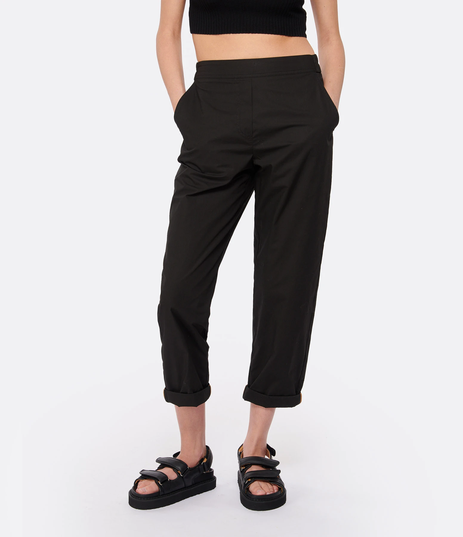 Pantalon droit en coton noir. Taille élastiquée. Deux poches à l’avant. Coupe droite. Base droite.