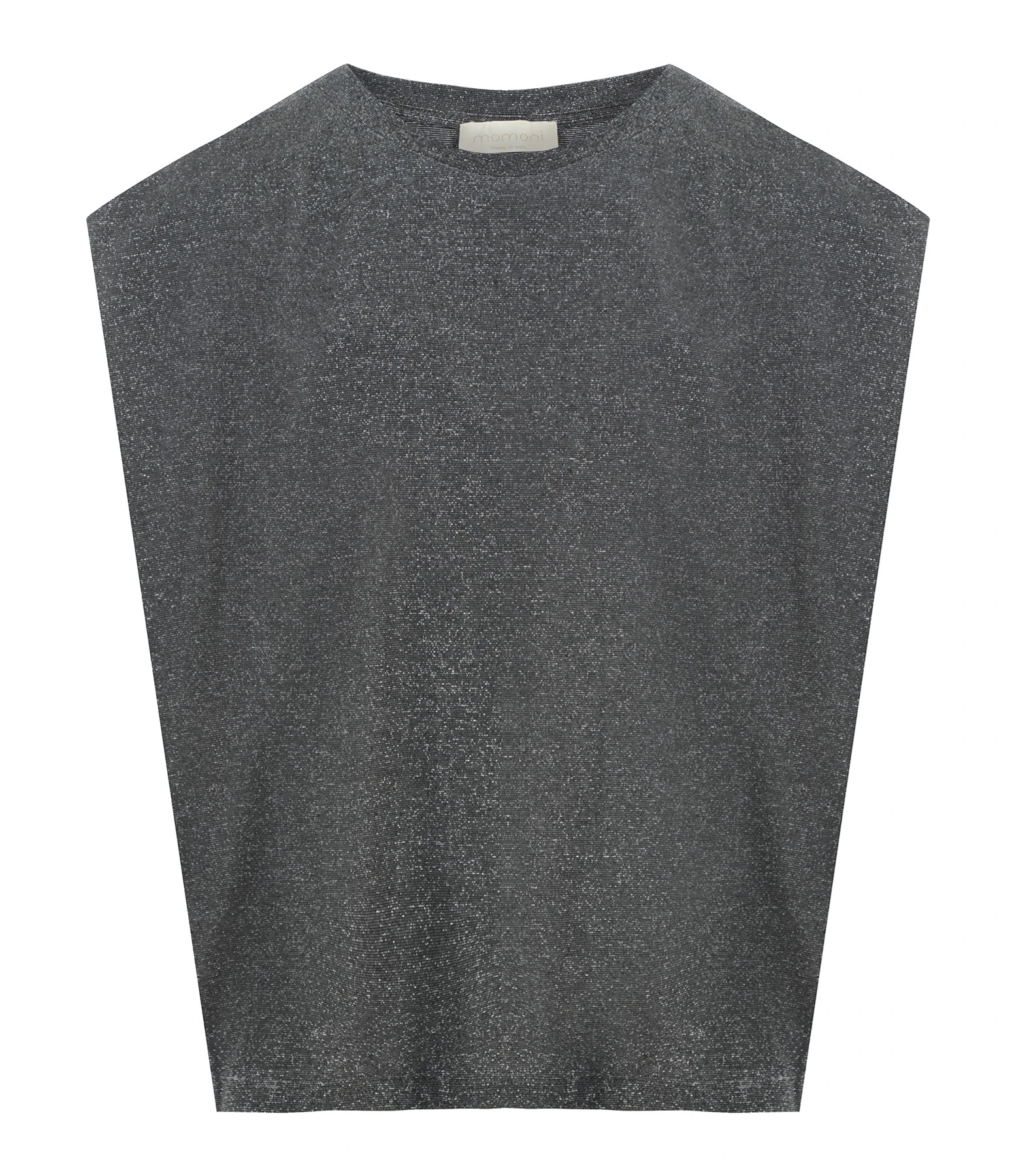 Débardeur gris pailleté. Col rond. Sans manches. Coupe droite. Base droite.