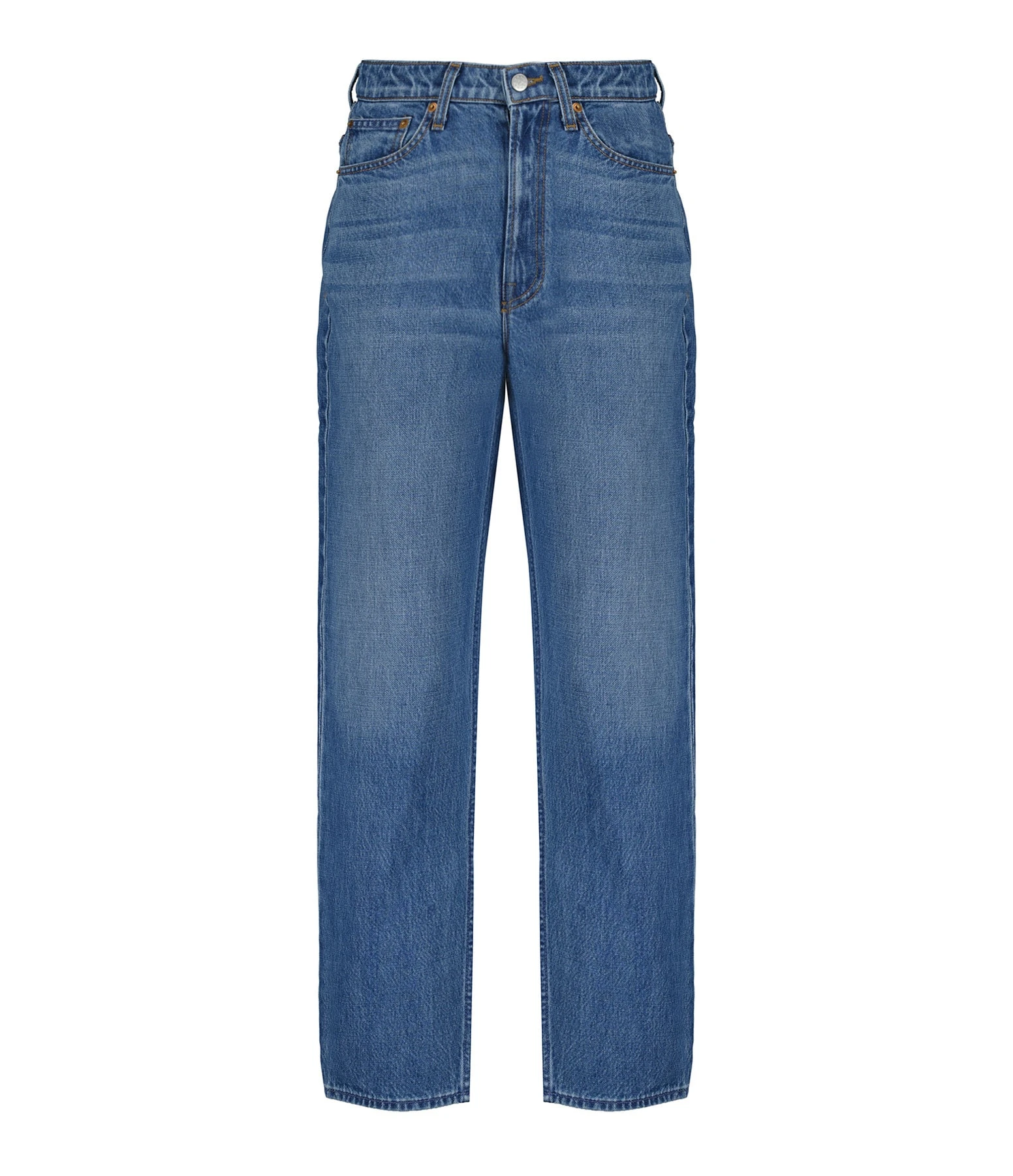 Pantalon en denim de coton bleu. Taille haute avec passants pour ceinture. Braguette zippée et boutonnée sur le devant. Deux poches italiennes et une poche à gousset. Deux poches plaquées dans le dos. Jacron rose dans le dos avec l’inscription « Snacks Made in Los Angeles From Mother » imprimée en beige. Coupe loose. Base droite.