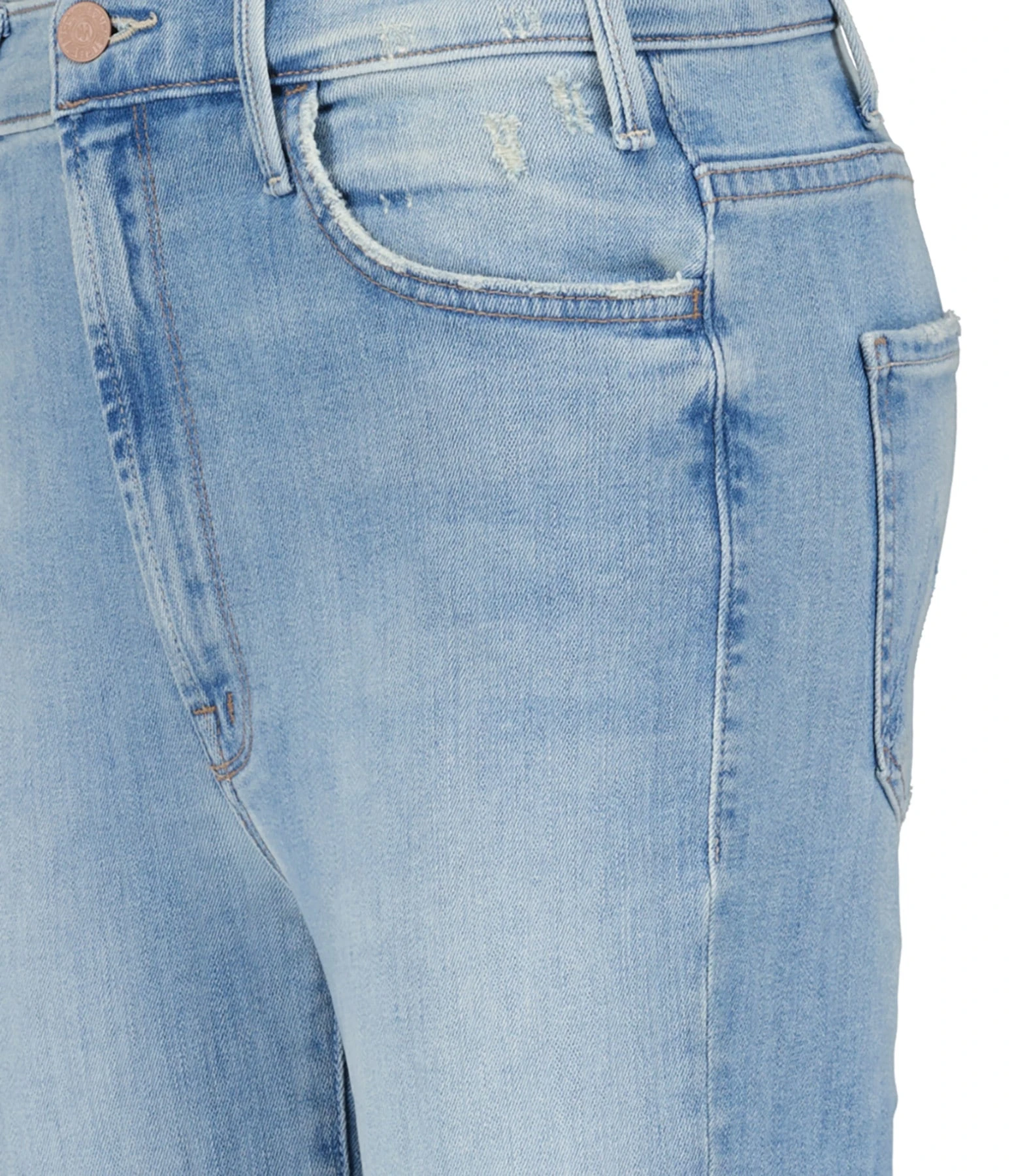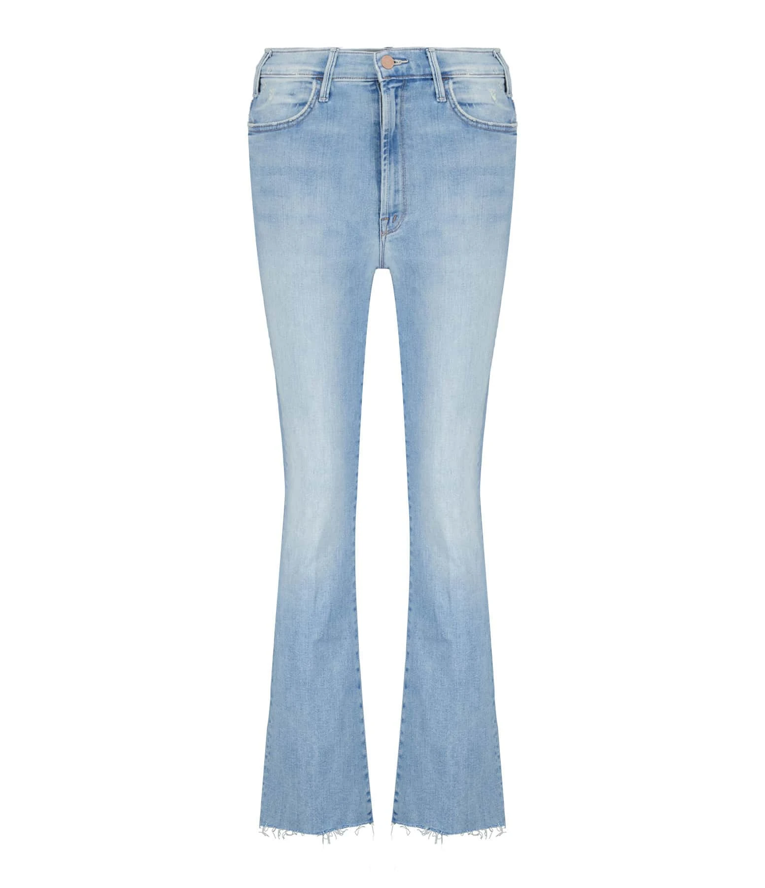 Pantalon en denim de coton bleu clair délavé. Taille haute avec passants pour ceinture. Braguette zippée et boutonnée. Deux poches italiennes sur le devant. Deux poches plaquées dans le dos. Coupe flare. Base droite avec bords effilochés.