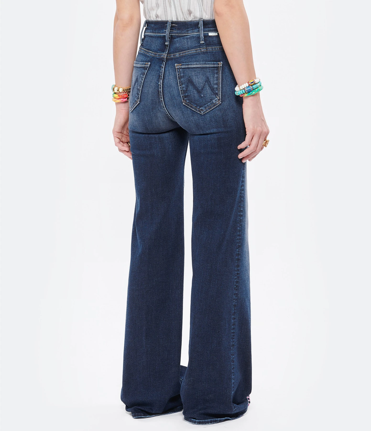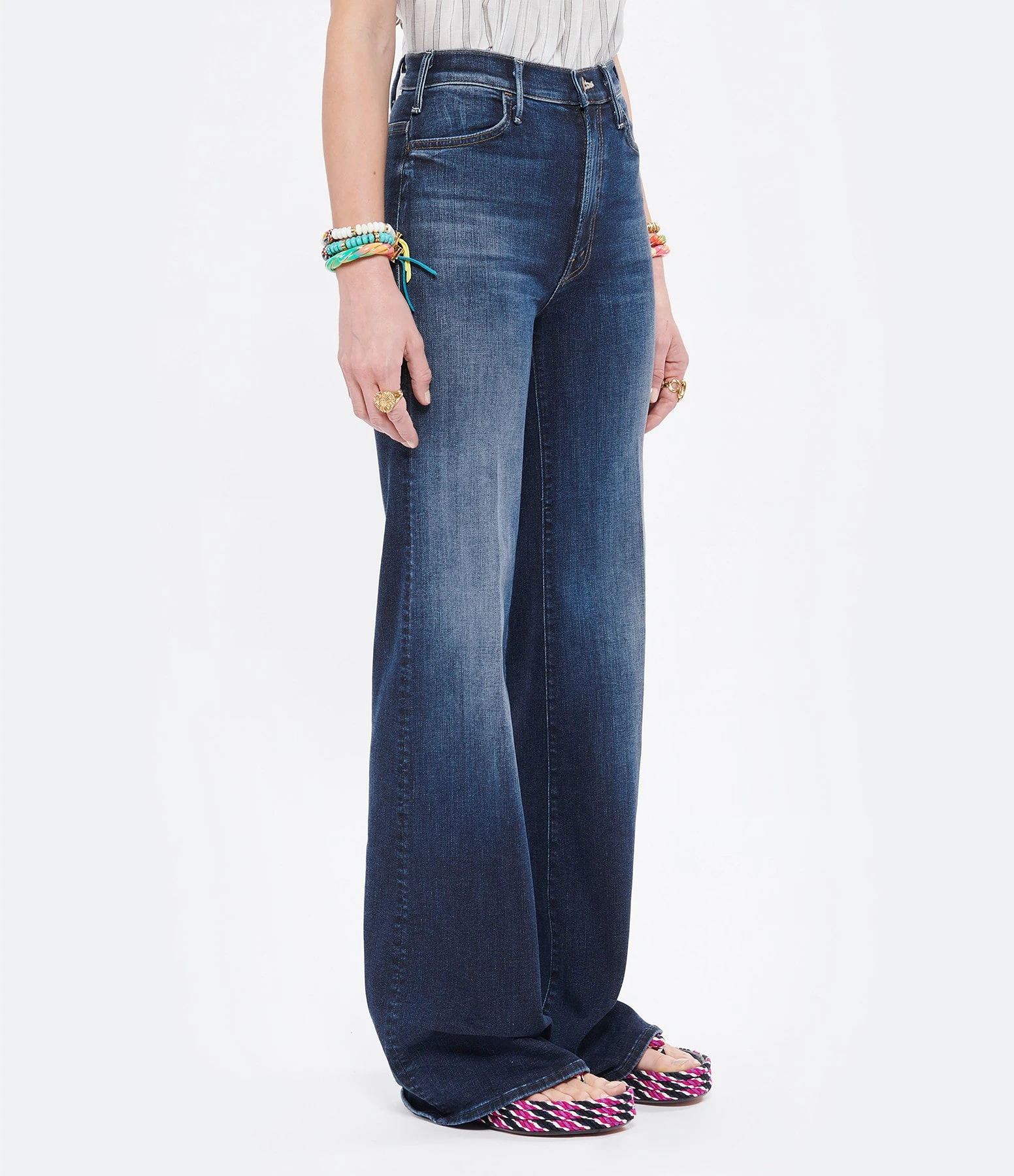 Jean en denim bleu brut. Taille mi-haute. Quatre poches. Fermeture par zip et boutons. Coupe flare.