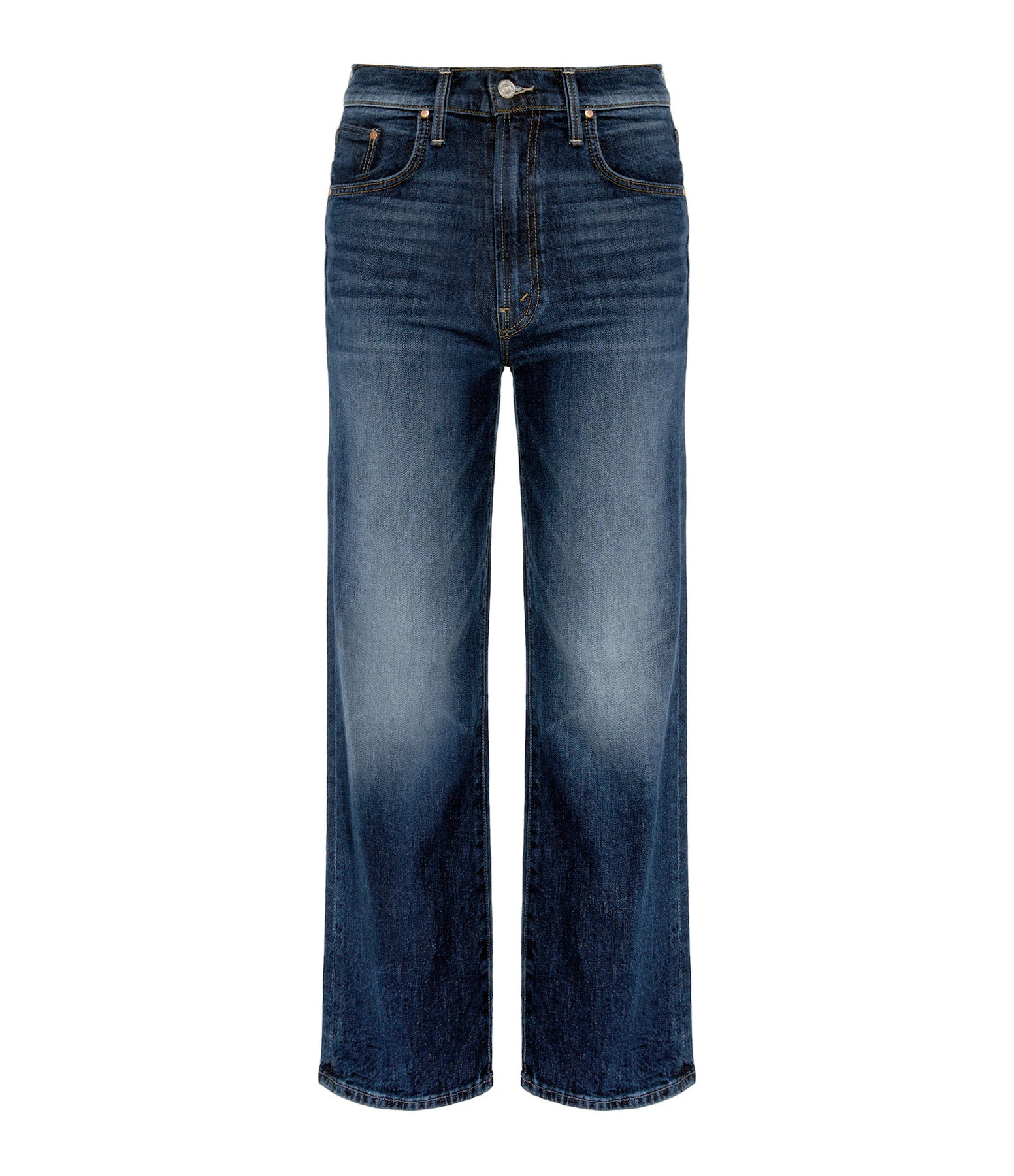 Pantalon large en denim de coton bleu délavé. Braguette boutonnée et zippée. Boutons métalliques avec logo gravé. Passants pour ceinture. Deux poches italiennes et une poche à gousset sur le devant. Deux poches plaquées dans le dos. Coupe droite. Base droite.