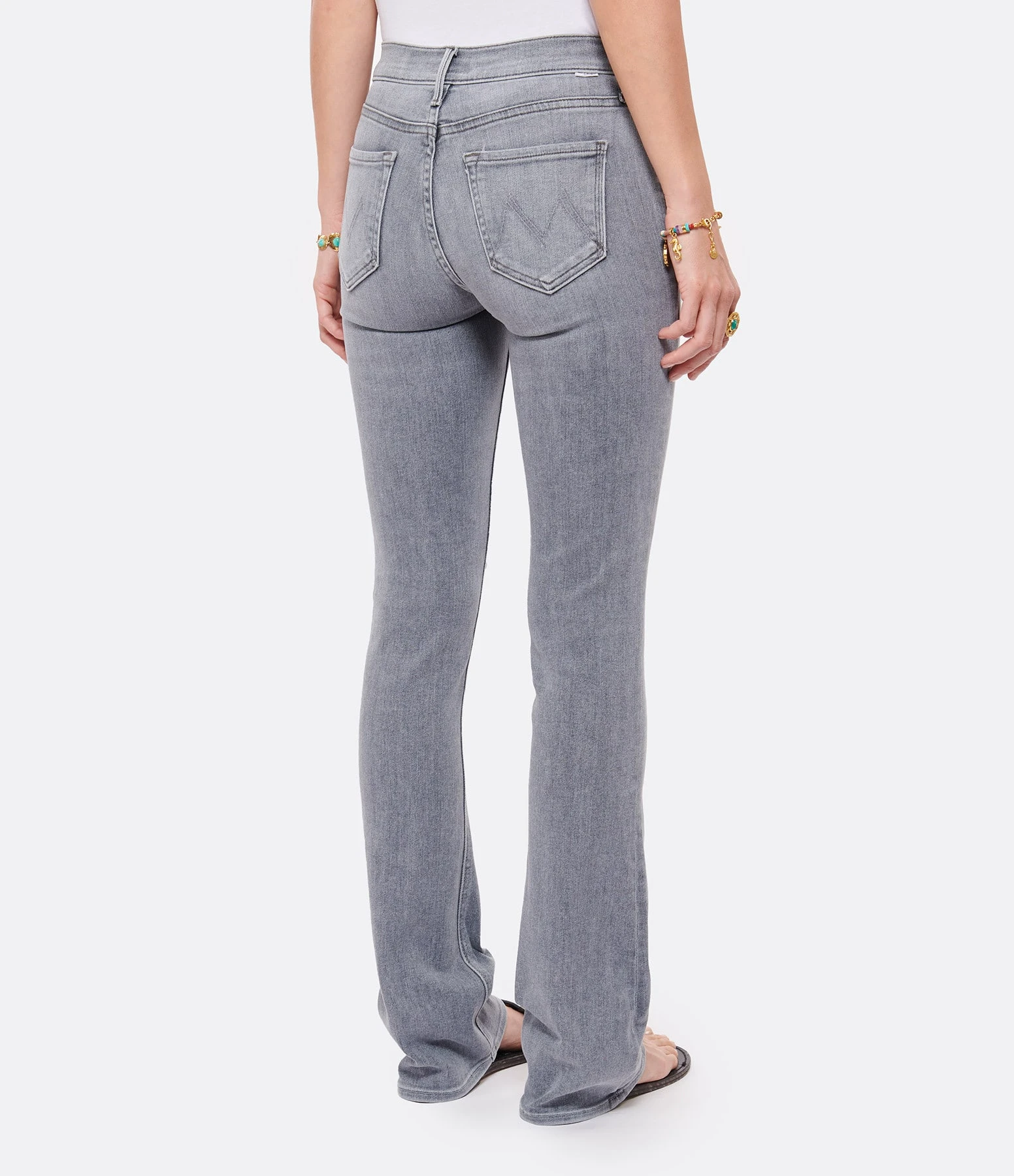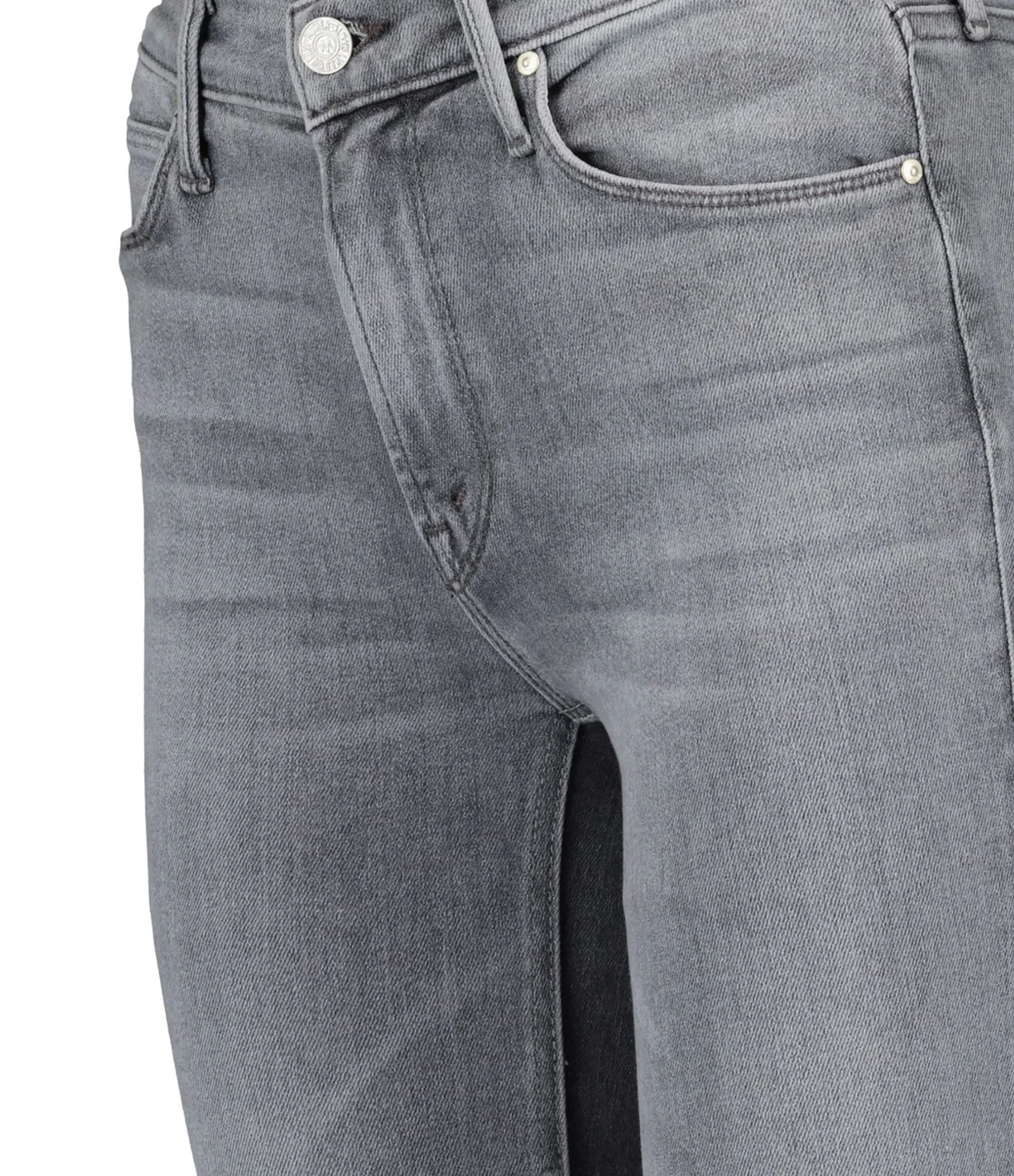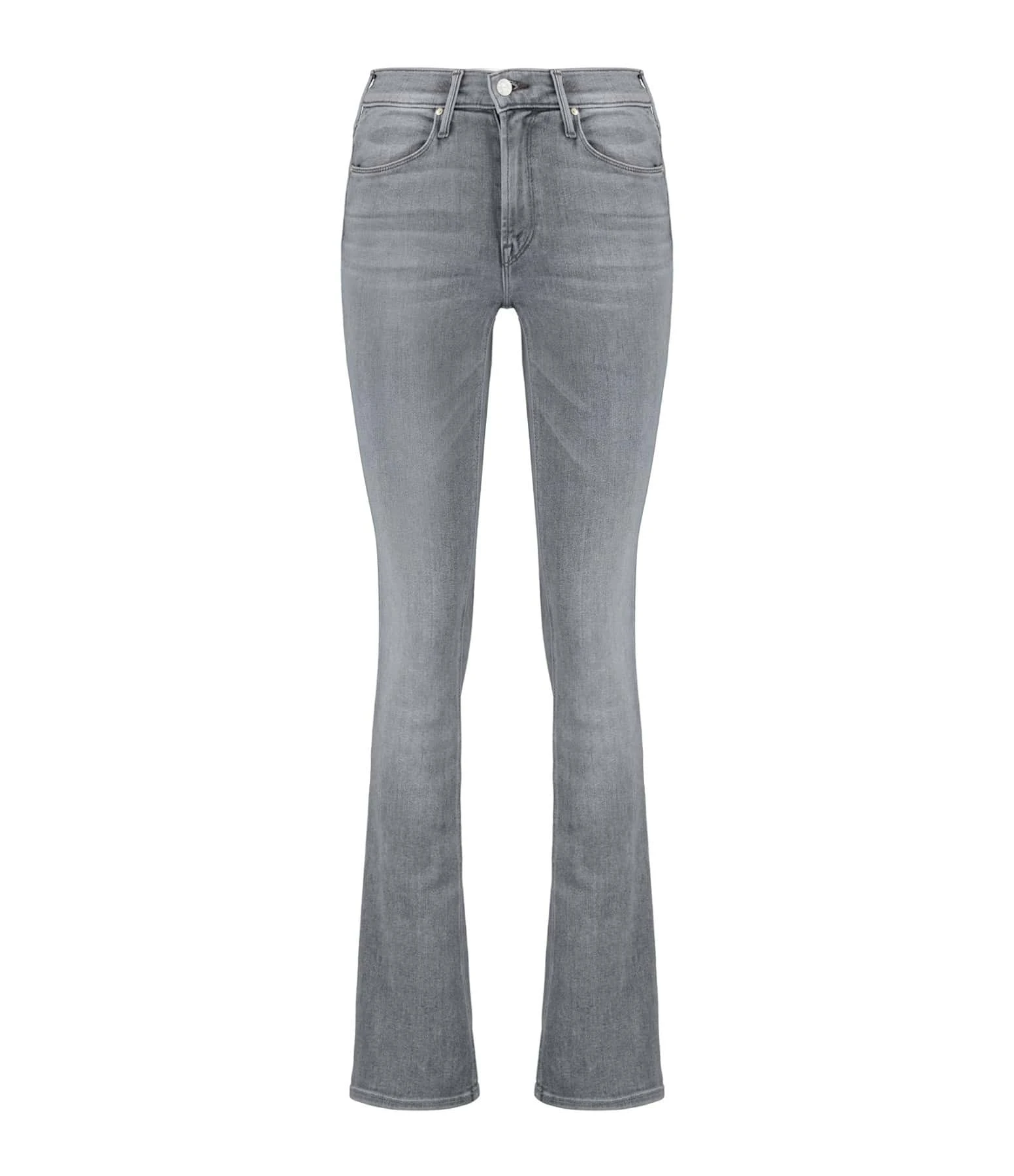 Jean flare en denim gris. Fermeture par zip et bouton. Passants pour ceinture. Cinq poches. Coupe slim, évasé en bas.