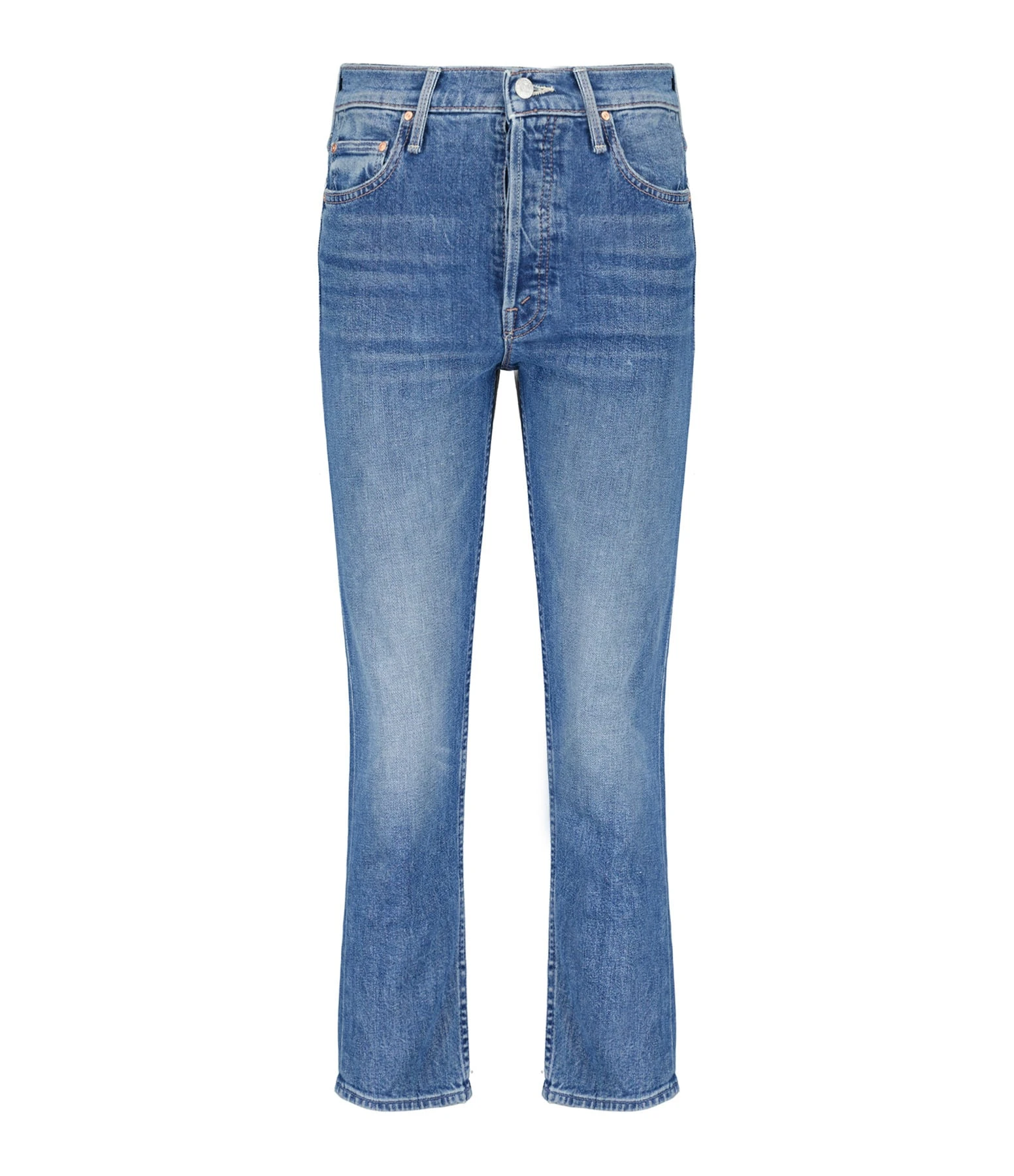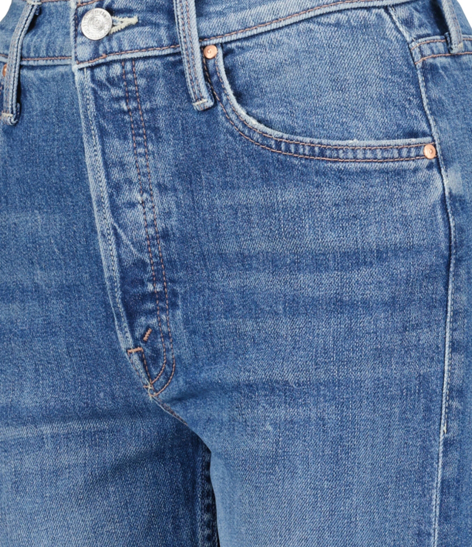 Jean droit en denim de coton bleu délavé. Taille haute. Cinq poches. Fermeture par boutons métalliques. Coupe droite. Base droite.