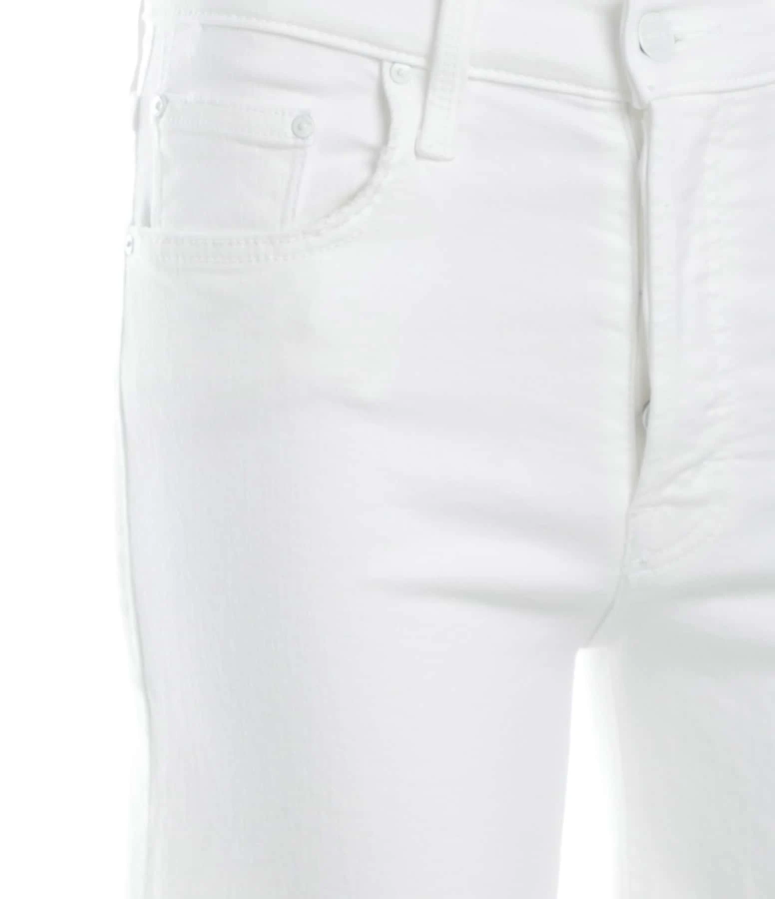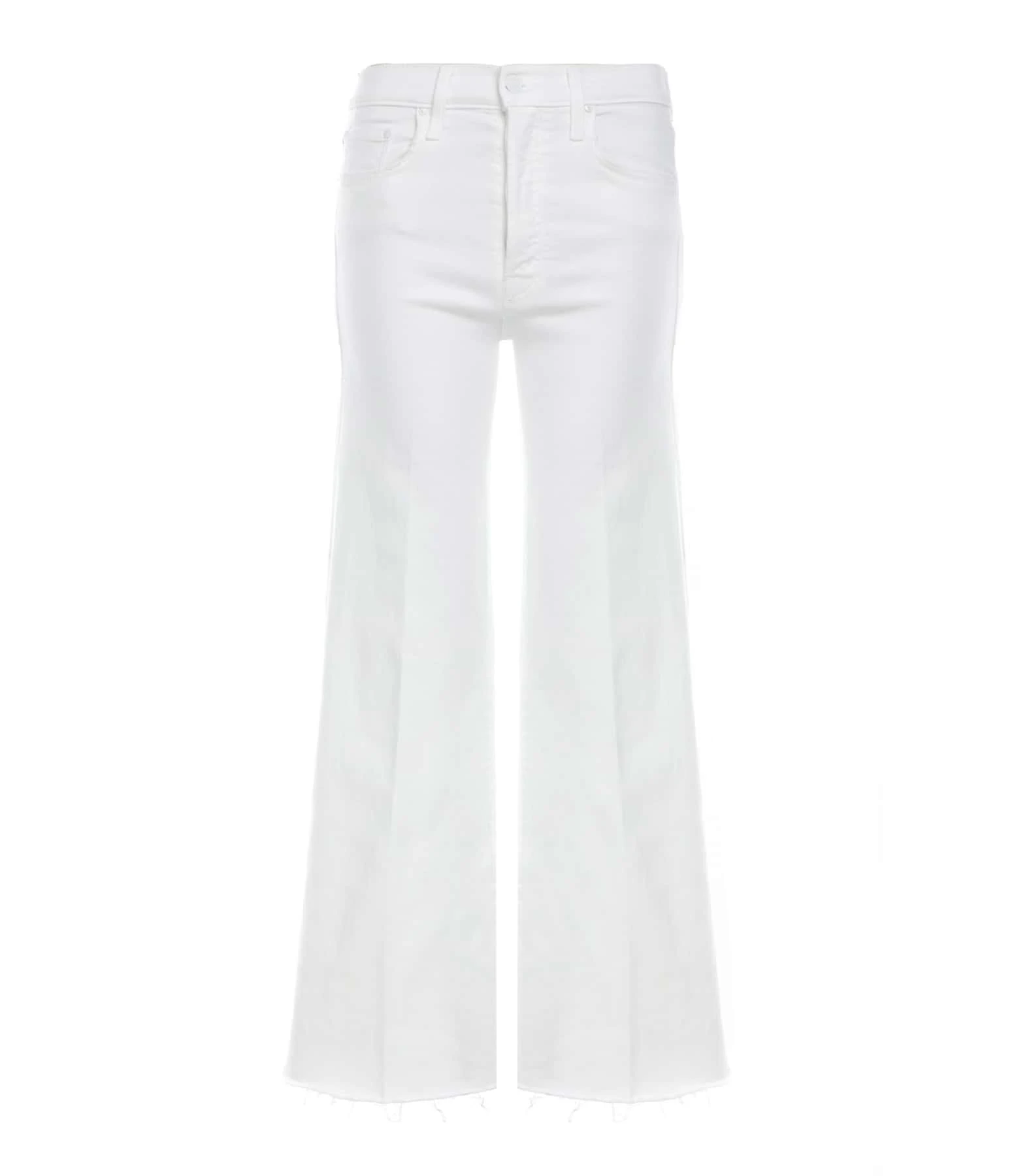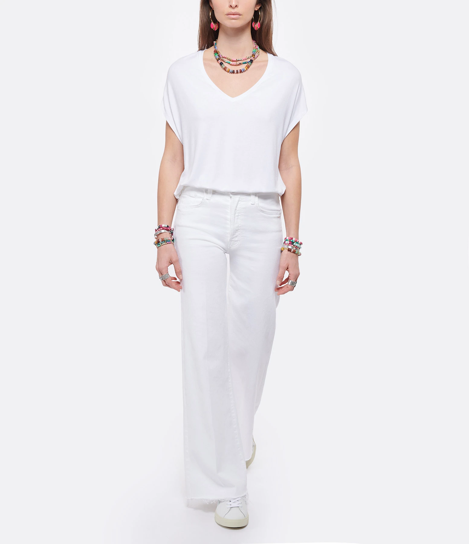 Jean large en denim blanc. Cinq poches. Fermeture boutonnée et passants pour ceinture. Coupe large avec bords coupés à crus.