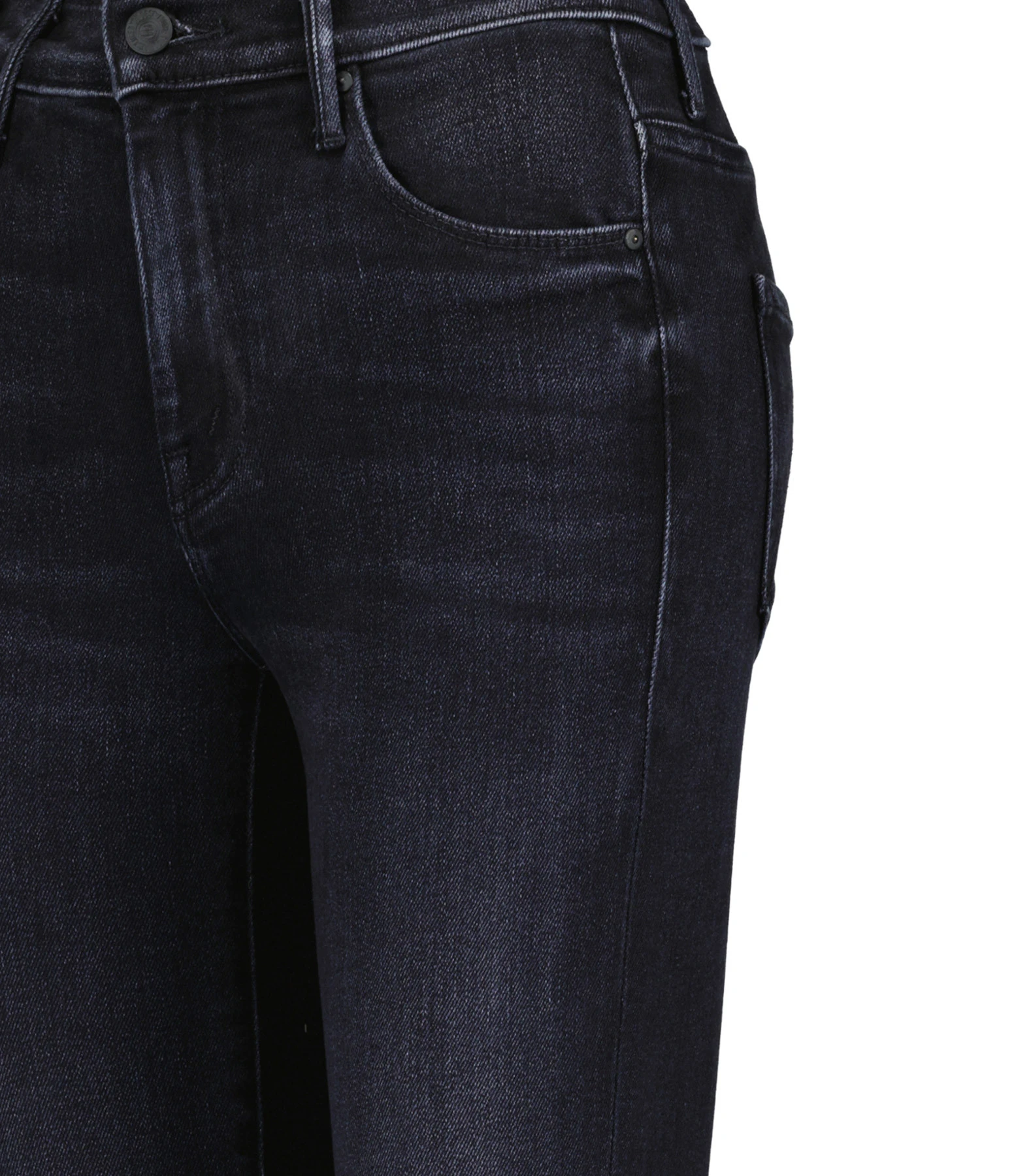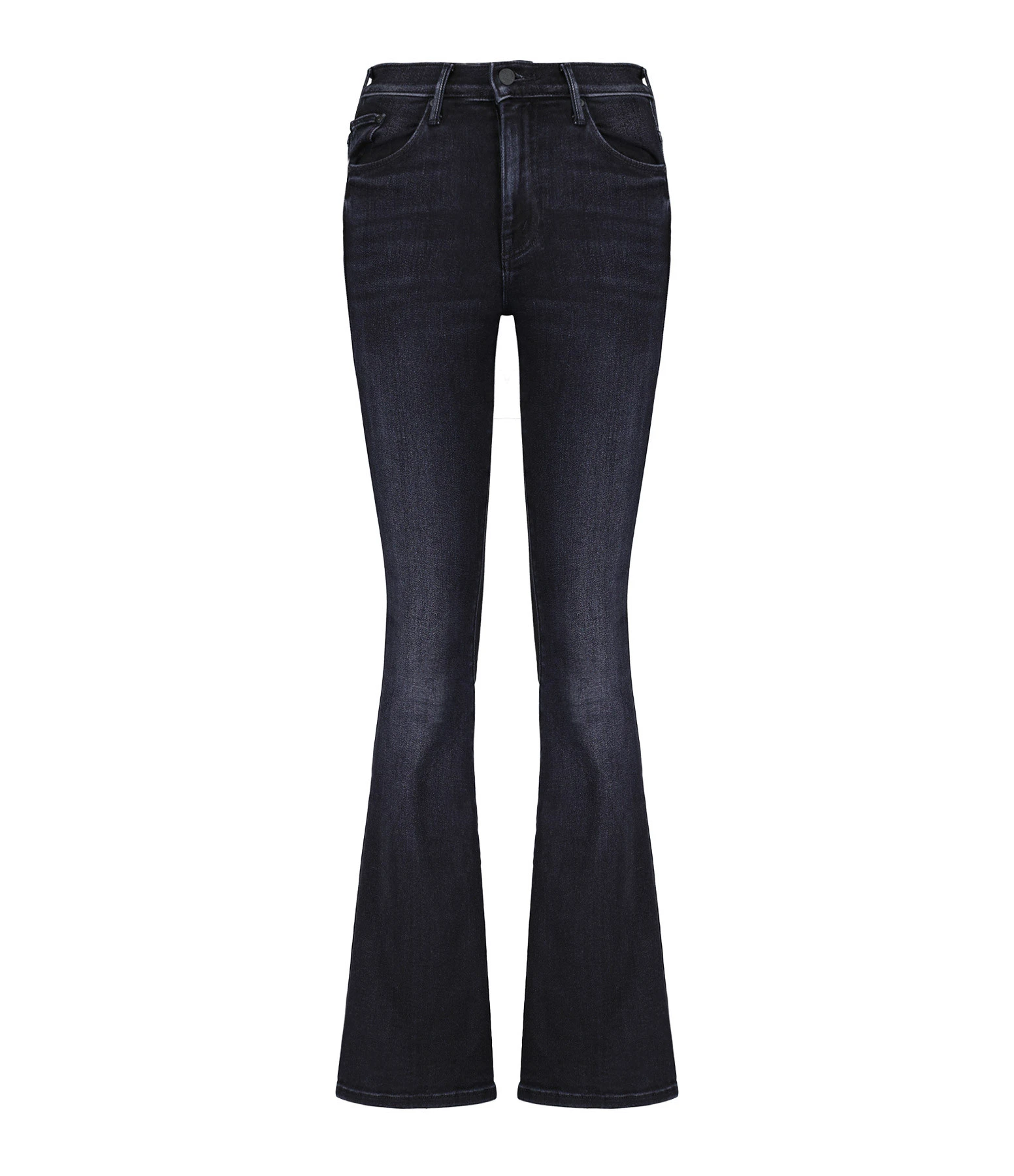 Jean en denim noir, légèrement décoloré aux genoux. Taille haute. Coupe bootcut évasée aux chevilles. Cinq poches. Fermeture par zip et bouton
