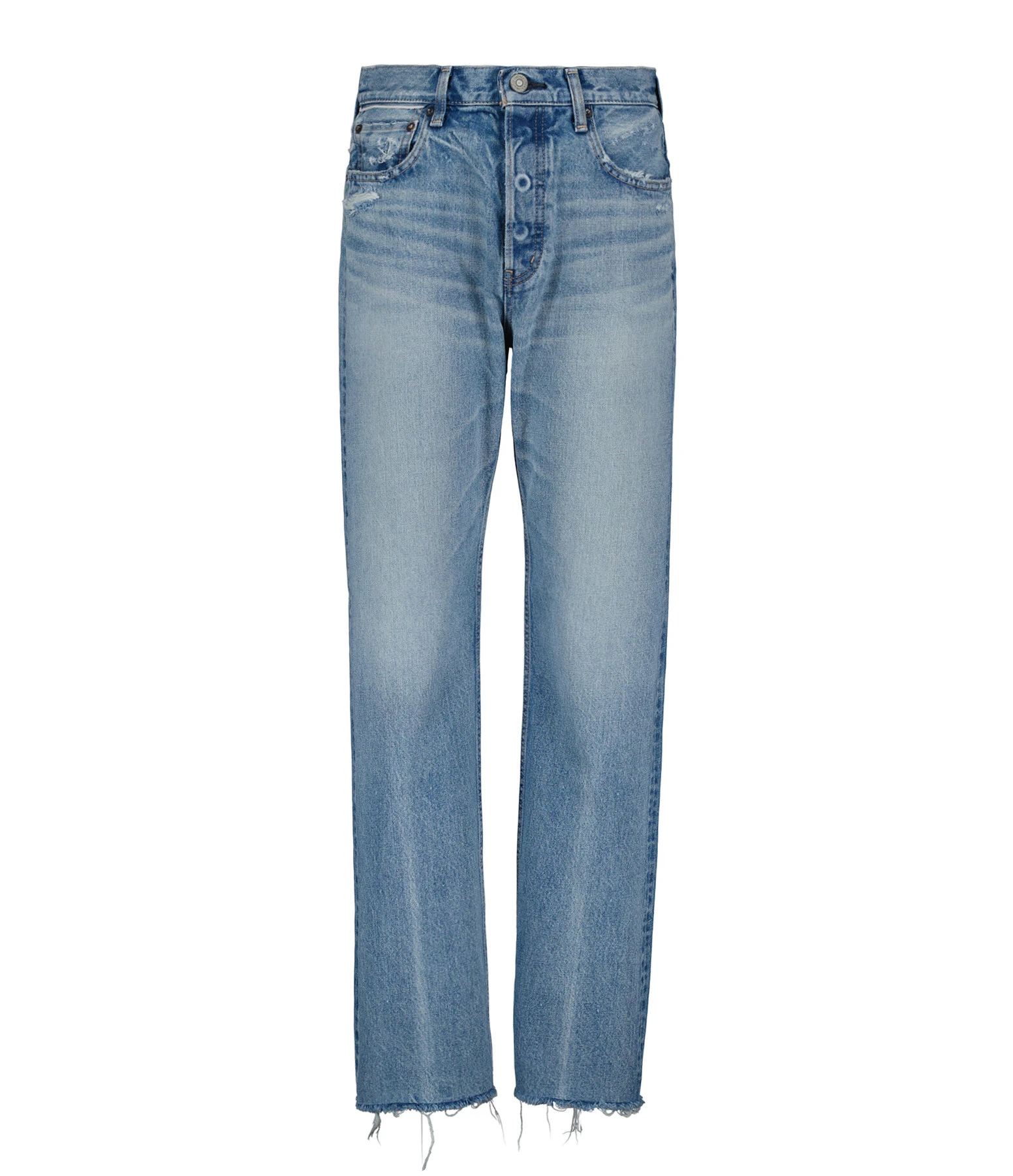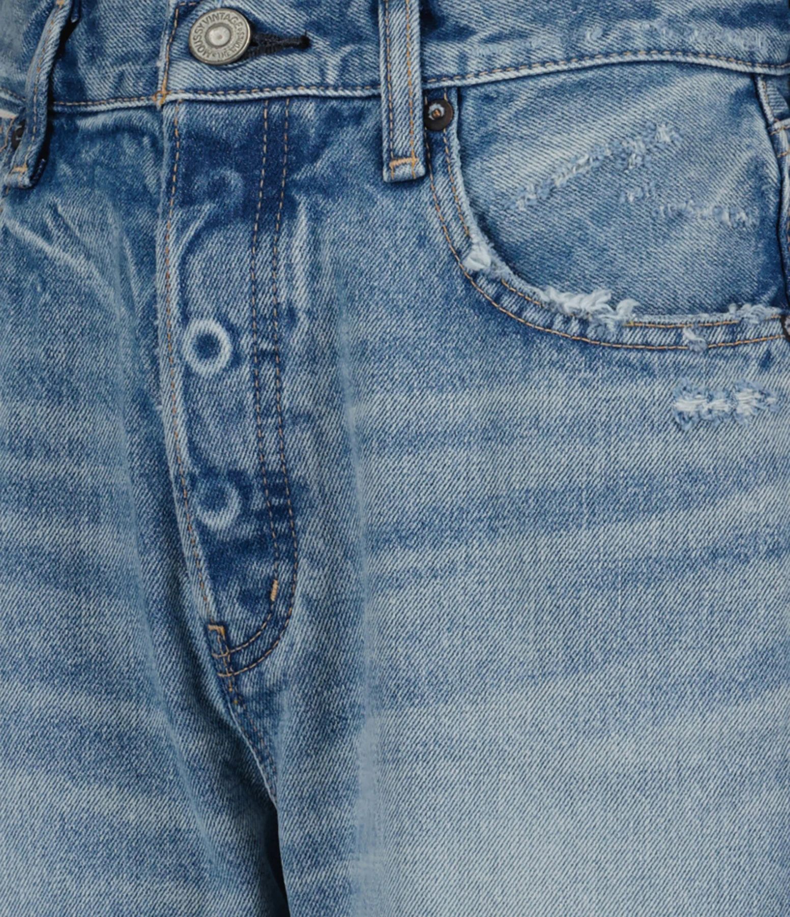 Pantalon en denim de coton bleu délavé. Braguette boutonnée. Boutons métalliques avec logo gravé. Passants pour ceinture. Deux poches italiennes et une poche à gousset. Deux poches plaquées dans le dos. Jacron en cuir lisse beige. Coupe droite large. Base droite avec bords francs. Effet usé et déchiré.