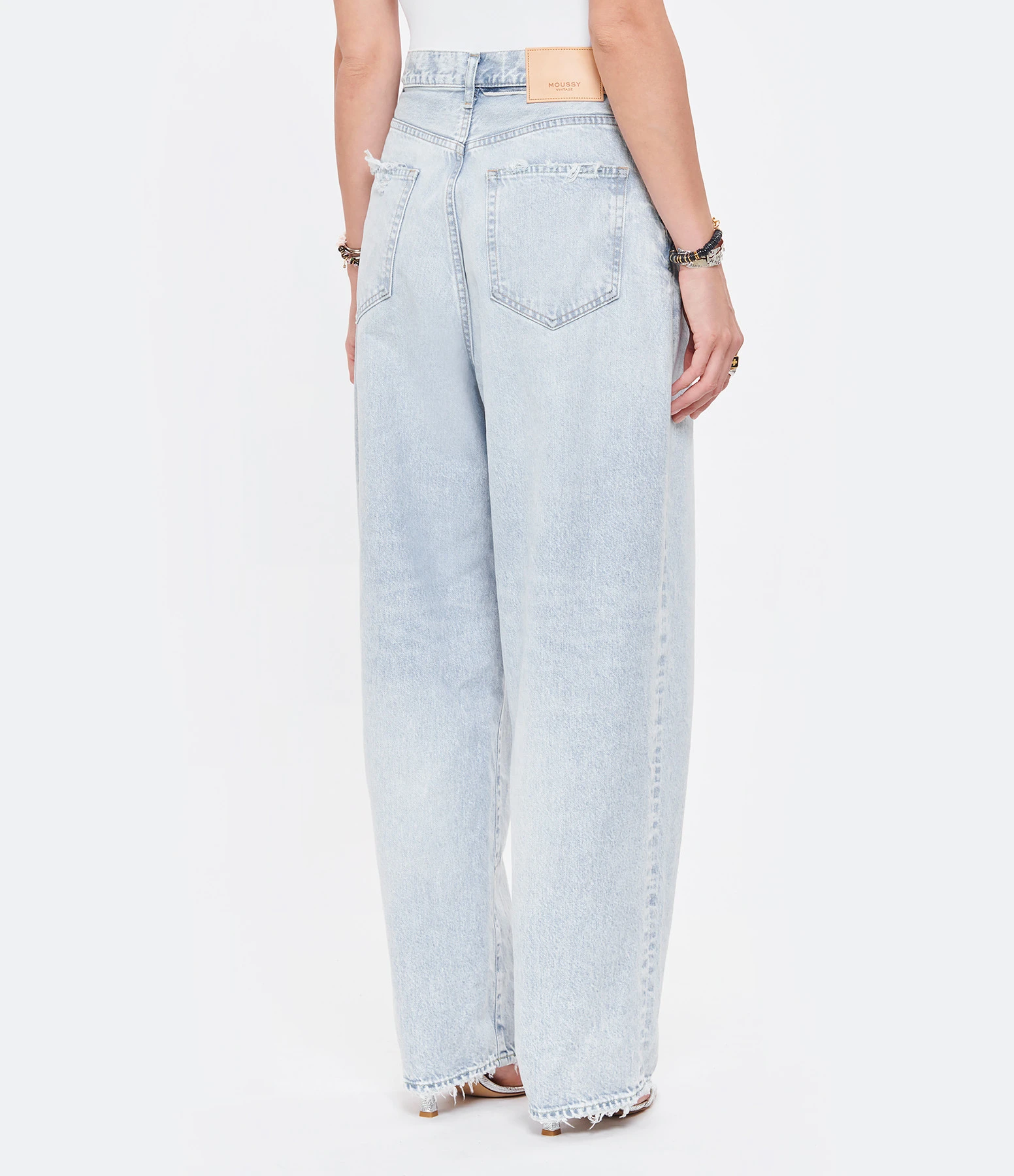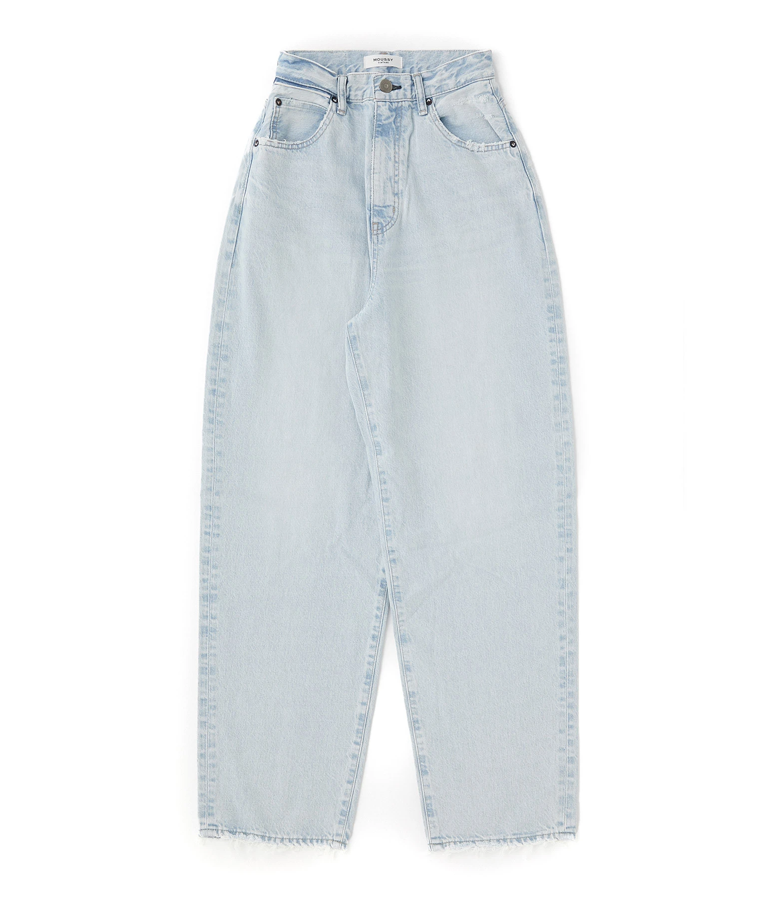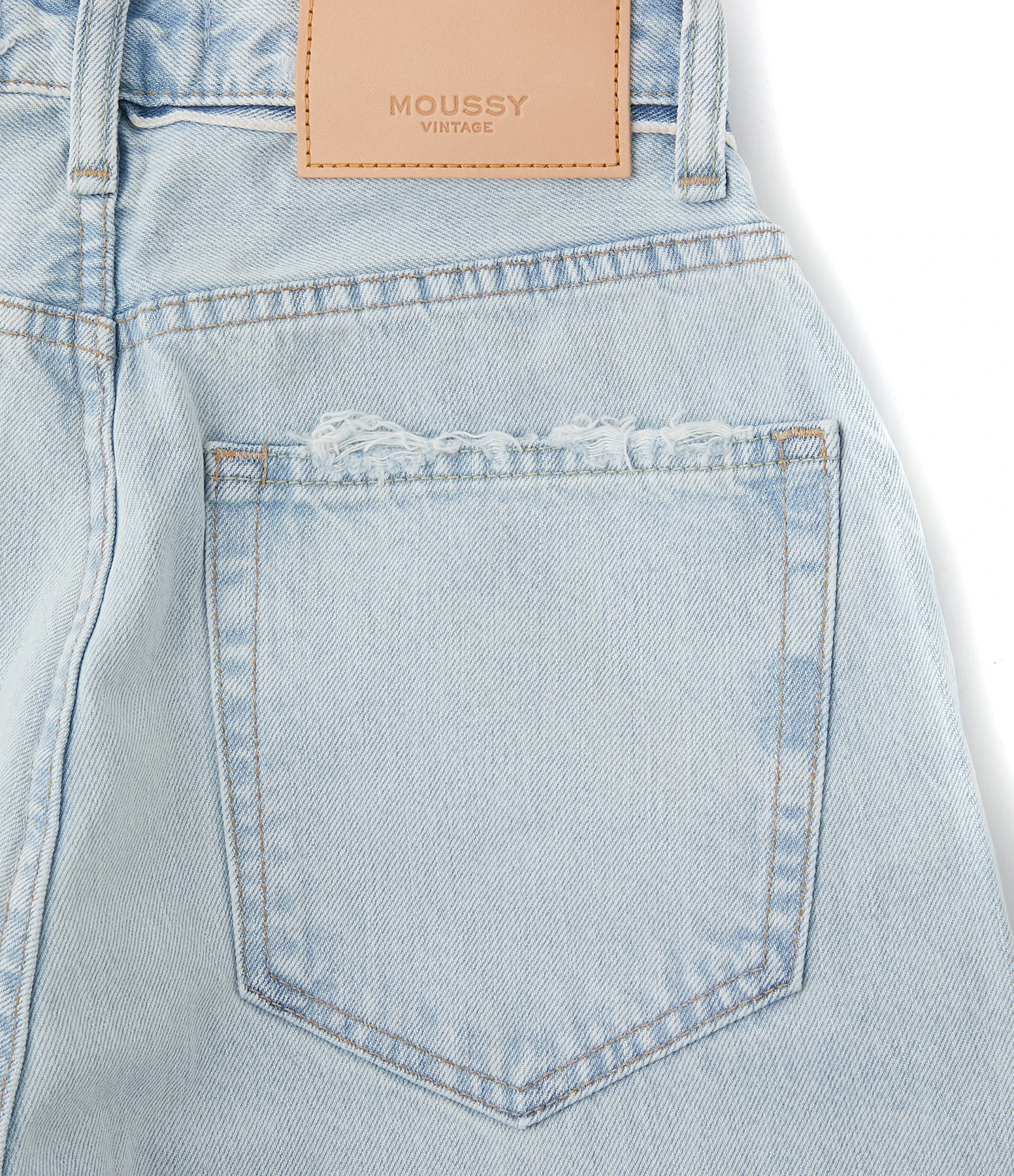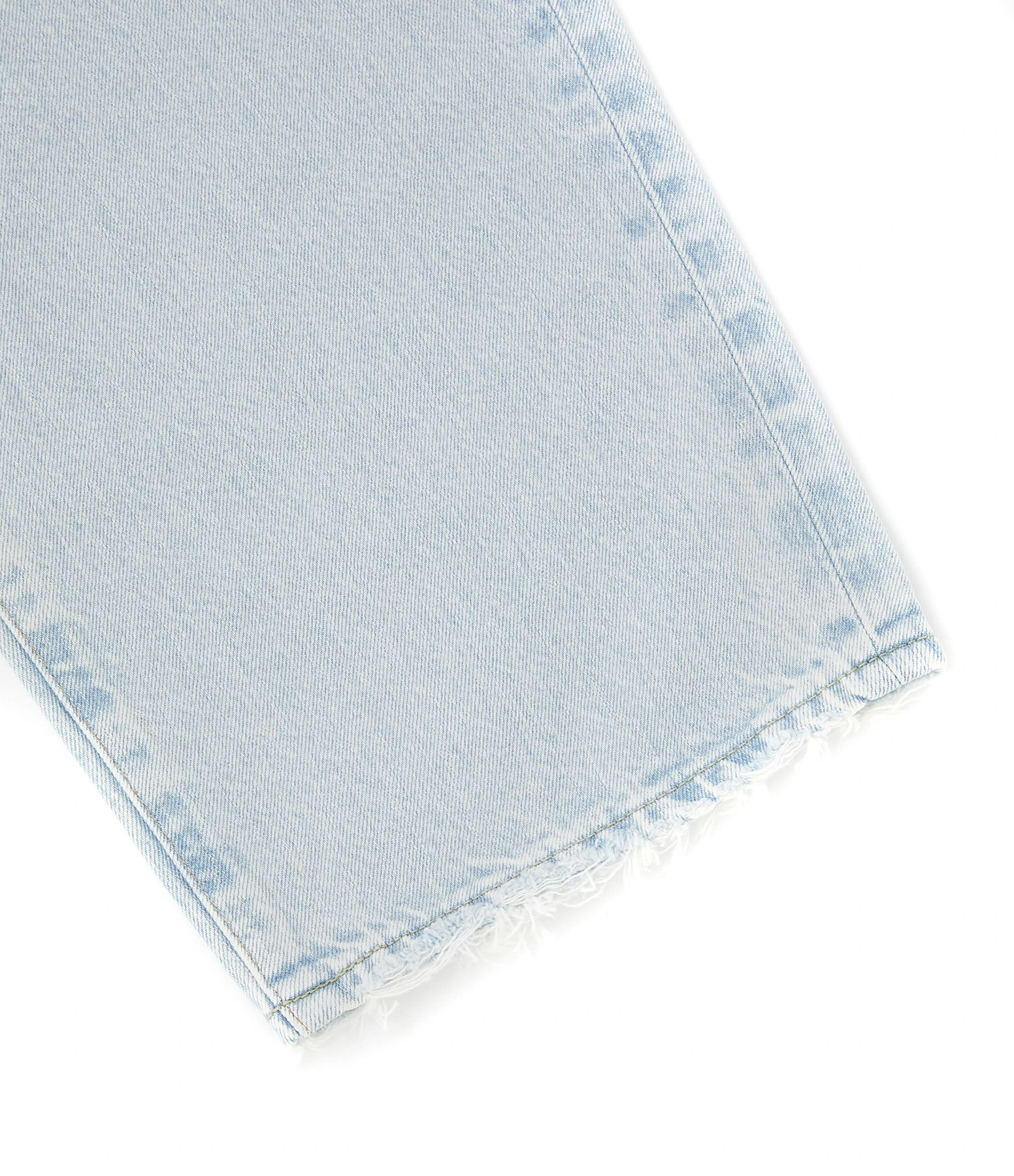 Jean coupe mom en denim bleu clair délavé. Bas de jambes effilochés. Cinq poches dont une briquet. Fermeture par zip.