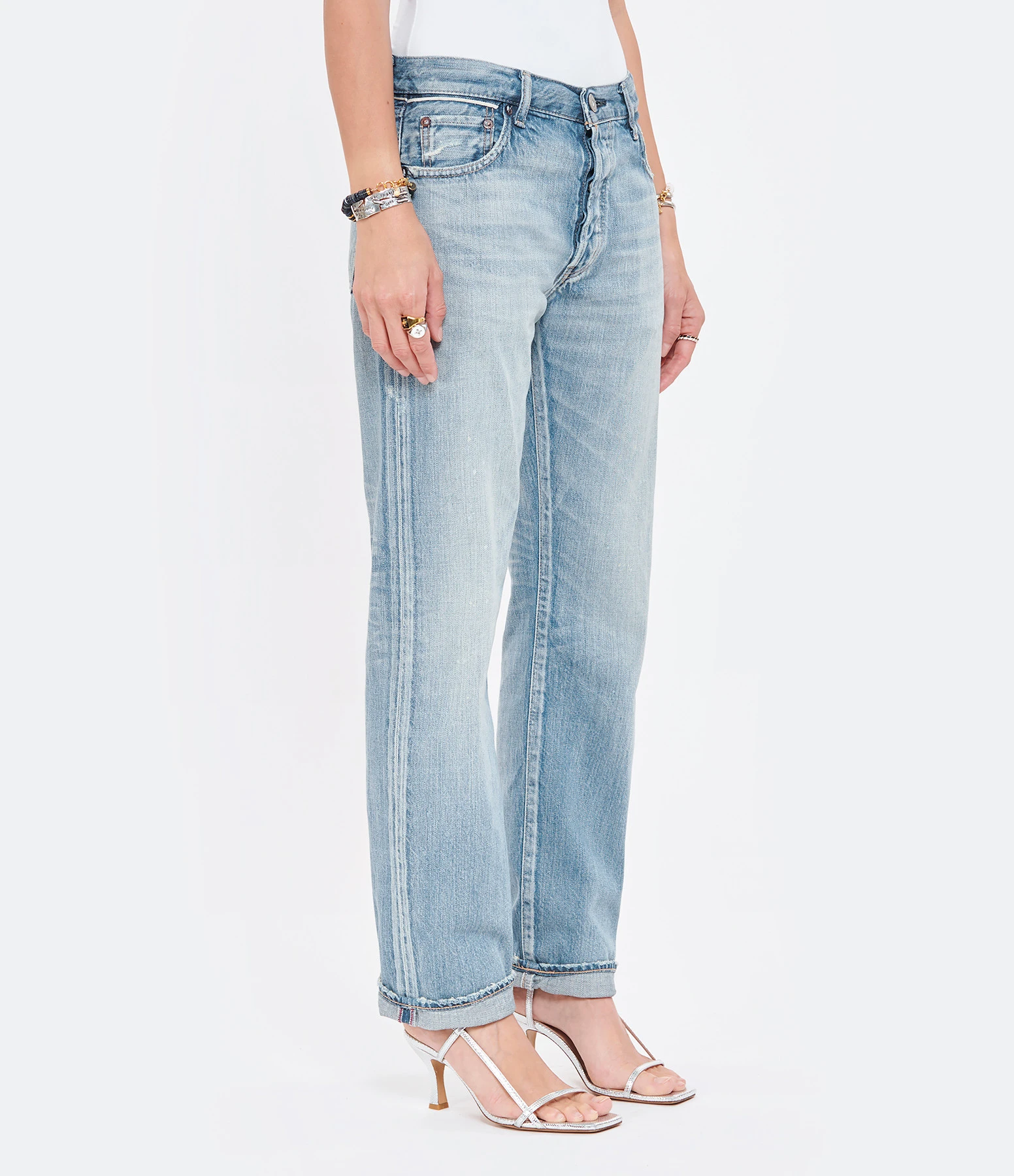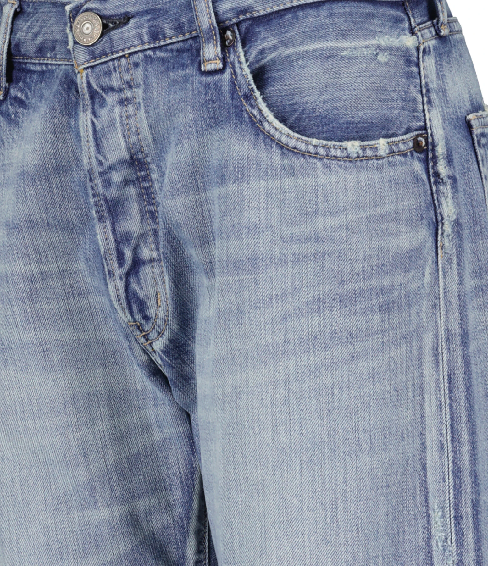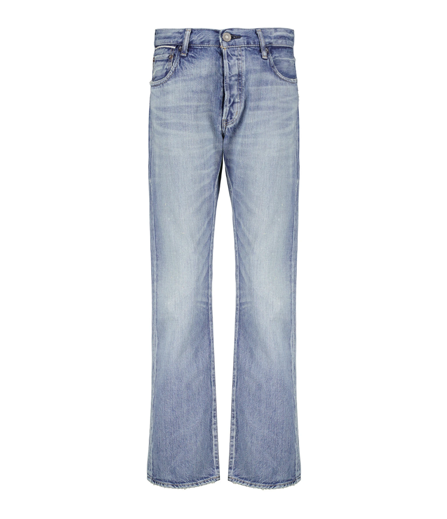 Jean droit délavé en denim bleu. Cinq poches dont une briquet. Fermeture par boutons. Effets usés volontairement par endroits.
