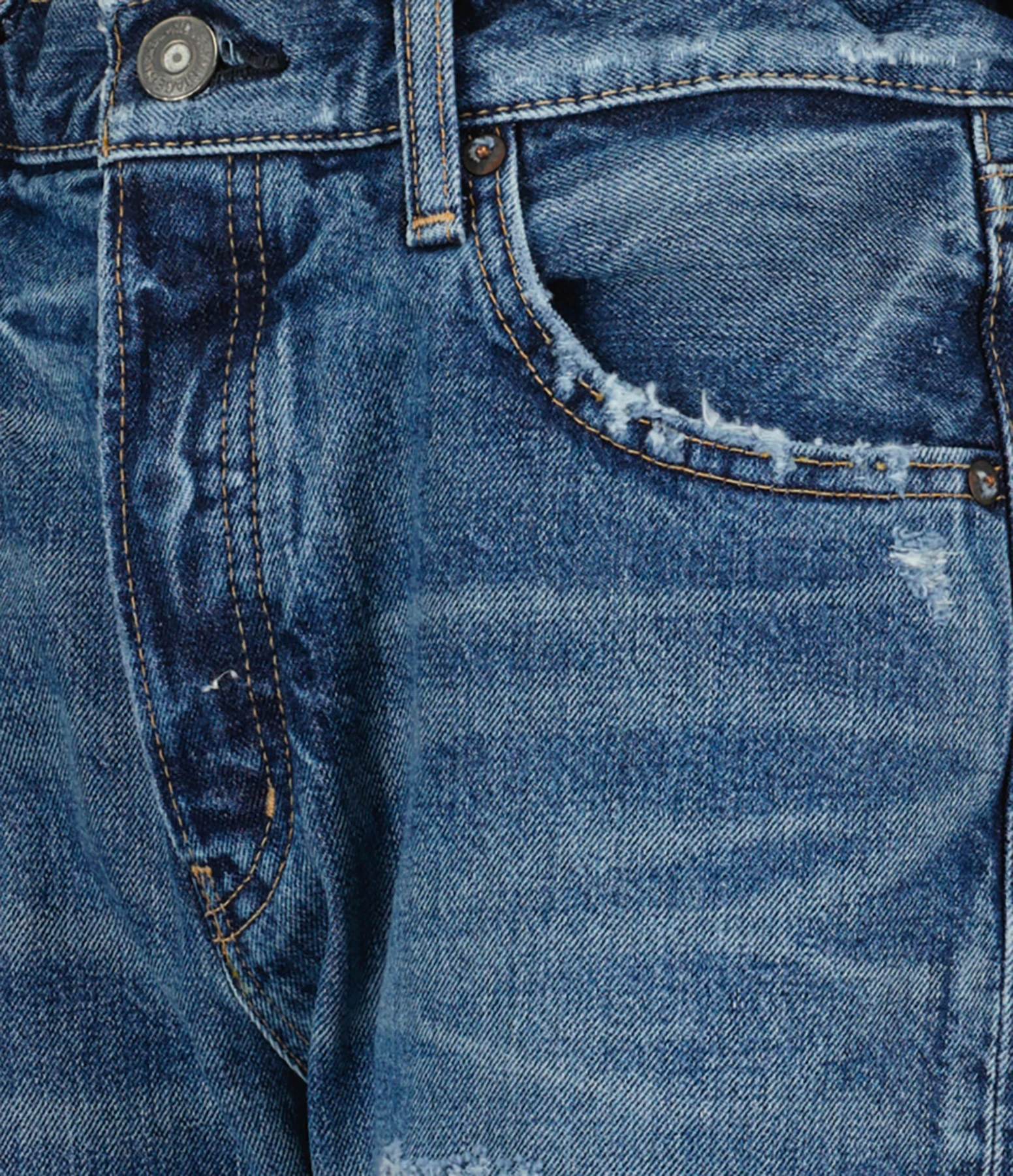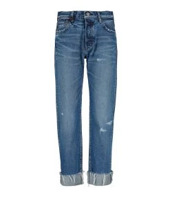 Pantalon en denim de coton bleu délavé. Braguette boutonnée. Boutons métalliques avec logo gravé. Passants pour ceinture. Deux poches italiennes et une poche à gousset. Deux poches plaquées dans le dos. Jacron en cuir lisse beige. Coupe droite. Base droite avec ourlet rabattu et bords francs. Effet usé et déchiré.