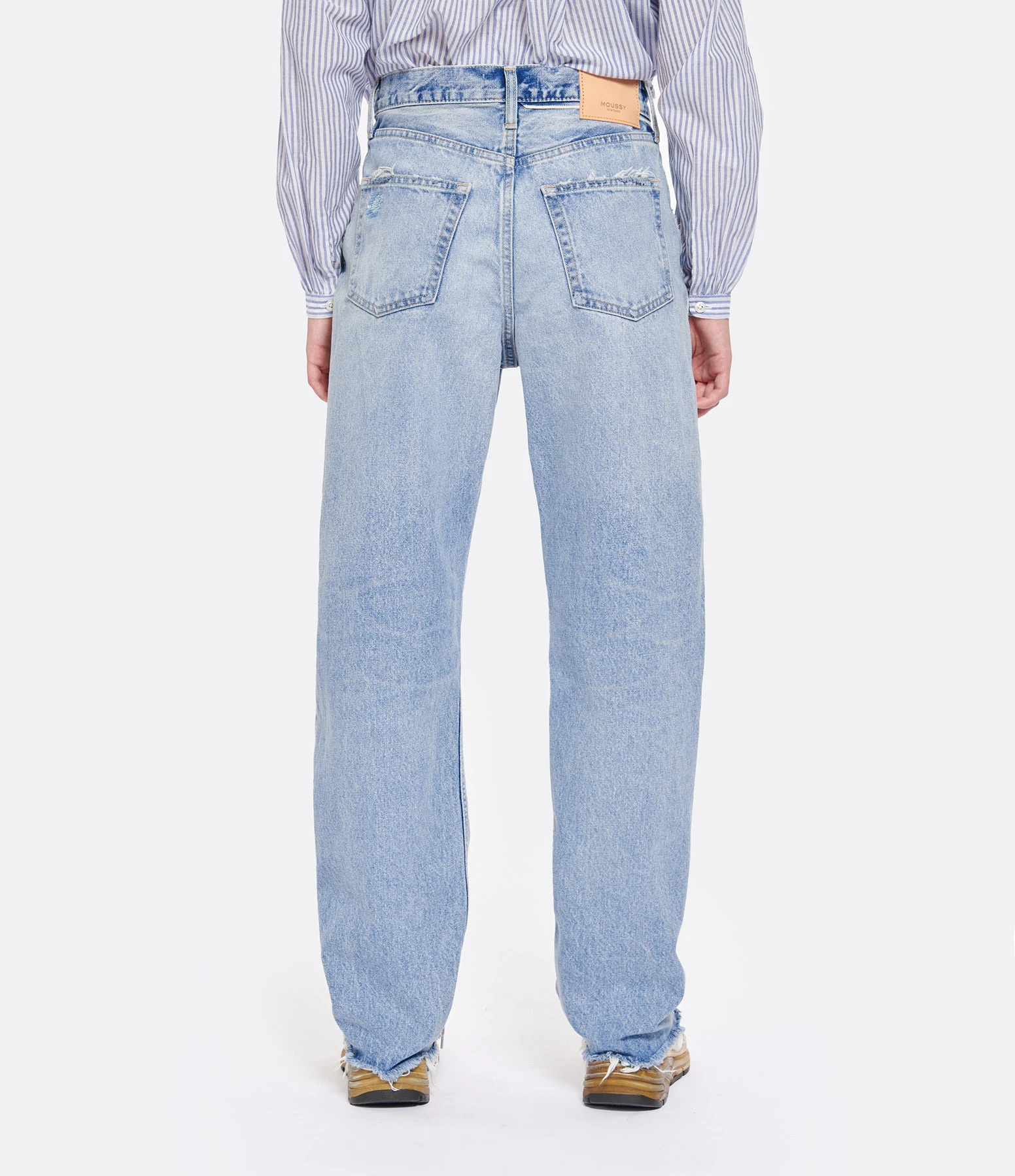 Pantalon droit en denim de coton bleu délavé. Effet usé par endroit. Braguette boutonnée. Boutons métalliques avec logo gravé. Cinq poches. Passants pour ceinture. Jacron en cuir lisse beige. Coupe droite. Base droite coupé à cru avec franges.