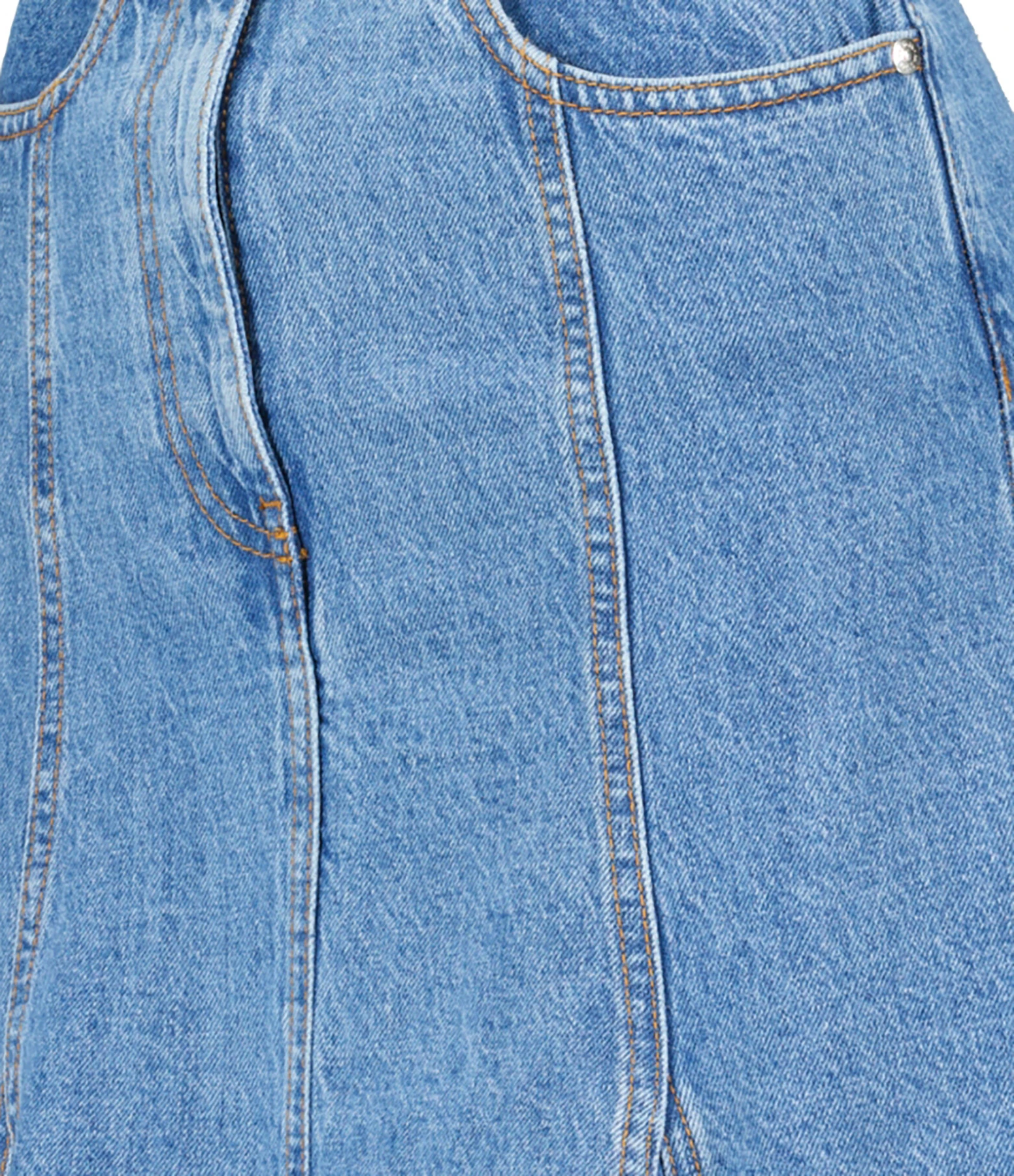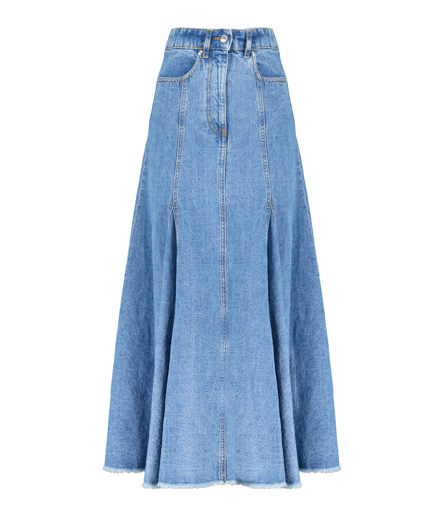 Jupe longue en denim de coton bleu. Deux poches Ă l’avant. Braguette zippĂ©e et boutonnĂ©e. Passants pour ceinture. Coupe Ă©vasĂ©e. Base droite coupĂ©e Ă cru.