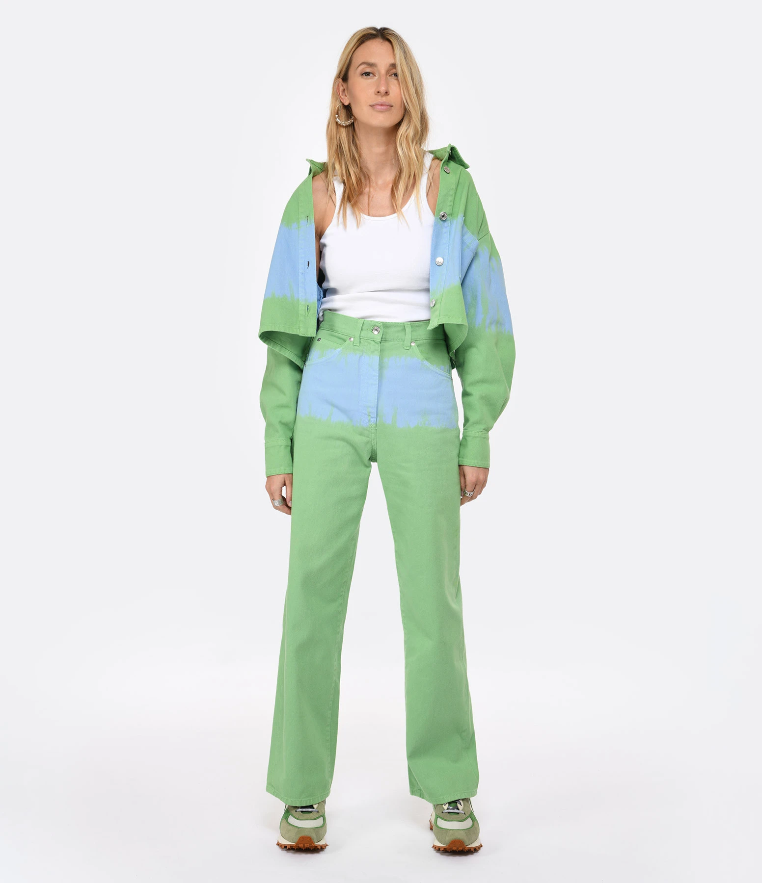 Pantalon large en denim de coton vert. Effet bleu délavé sur le haut du pantalon. Passants pour ceinture. Cinq poches. Braguette zippée et boutonnée. Coup droite. Base droite.