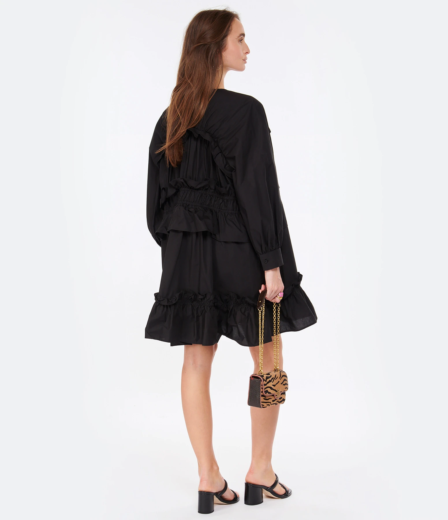 Robe courte en coton noir. Volants et plissée au niveau des épaules, de la taille et au bas de la jupe. Col en V avec cordons de serrage sur plusieurs niveaux. Manches longues avec boutons de fermeture aux poignets. Coupe droite. Base droite.