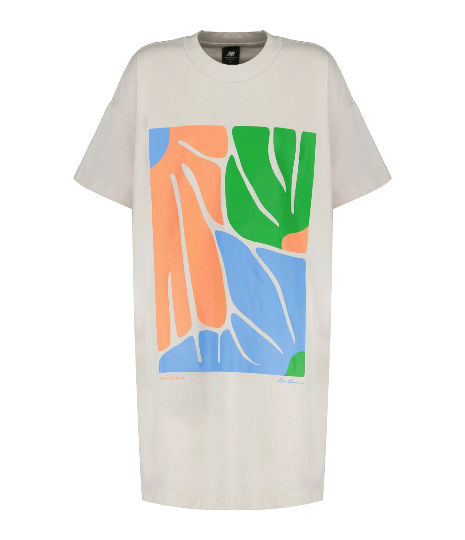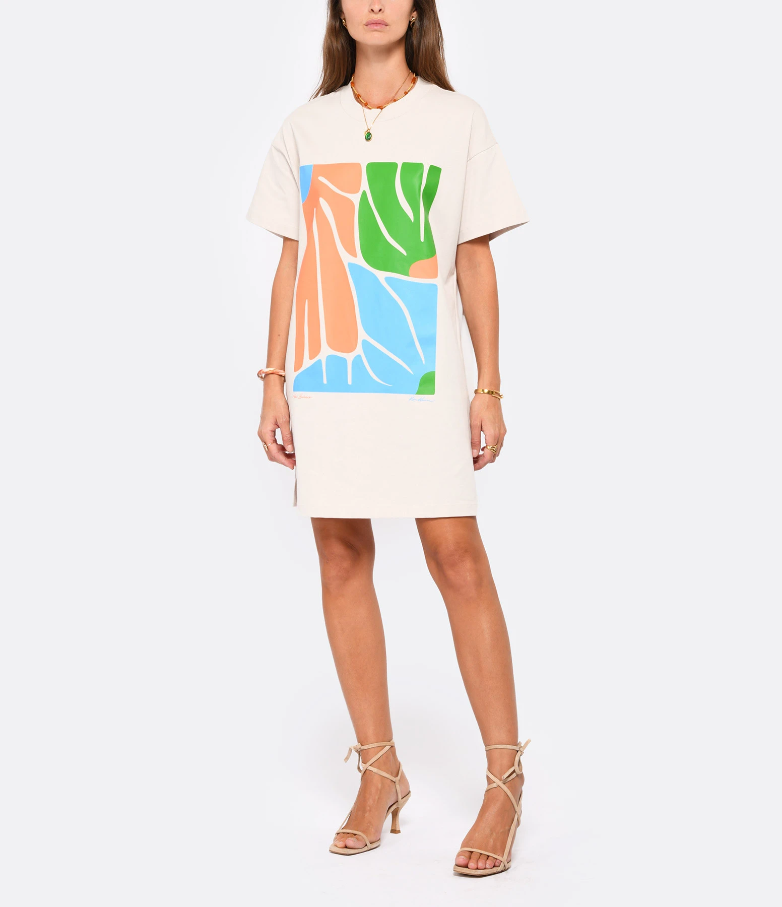 Robe courte en coton beige. Imprimé multicolore sur le devant. Col rond. Manches courtes. Coupe droite. Base droite avec fentes sur les côtés.