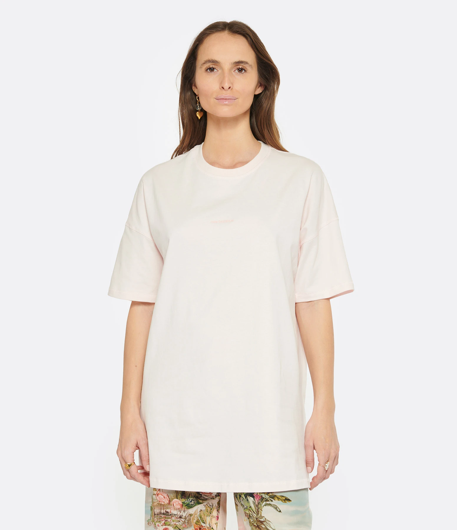 Tee-shirt en coton rose. Logo au centre de la poitrine. Manches courtes. Col ras du cou. Coupe droite. Base droite.