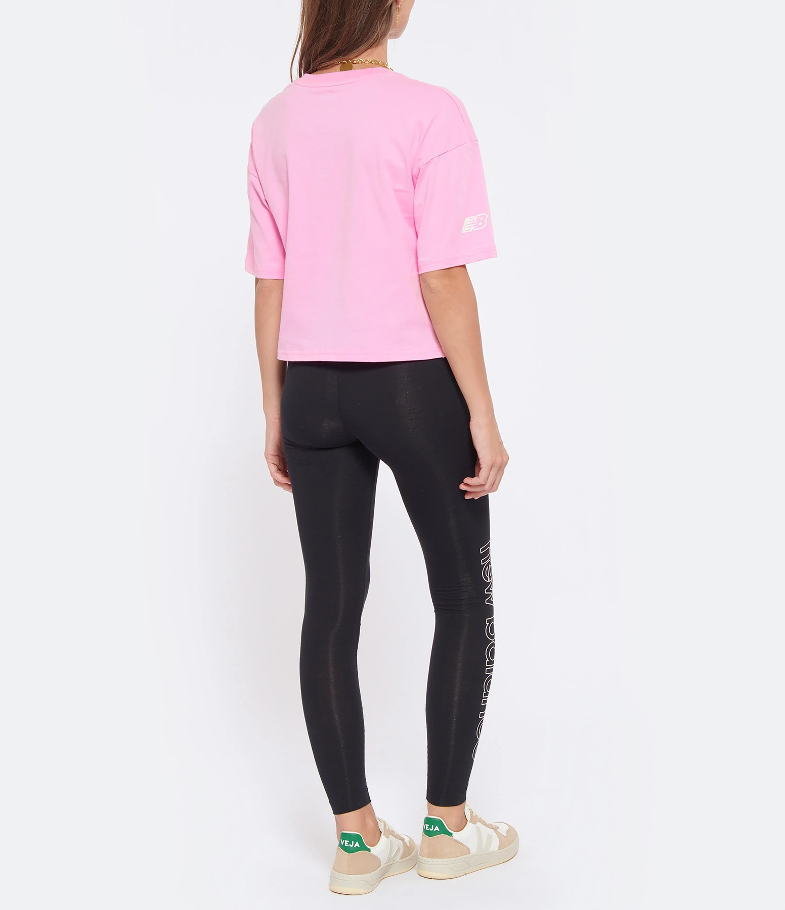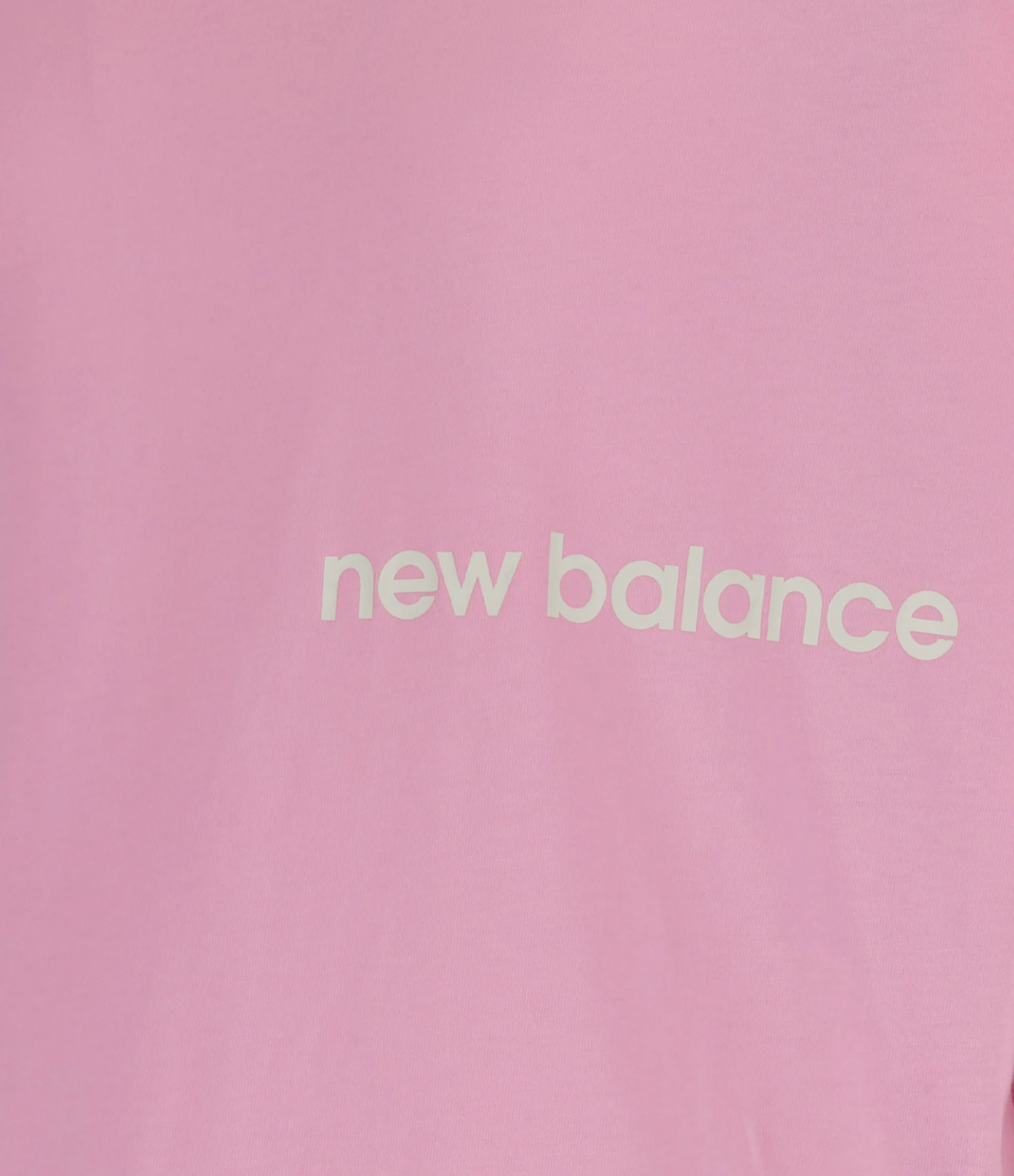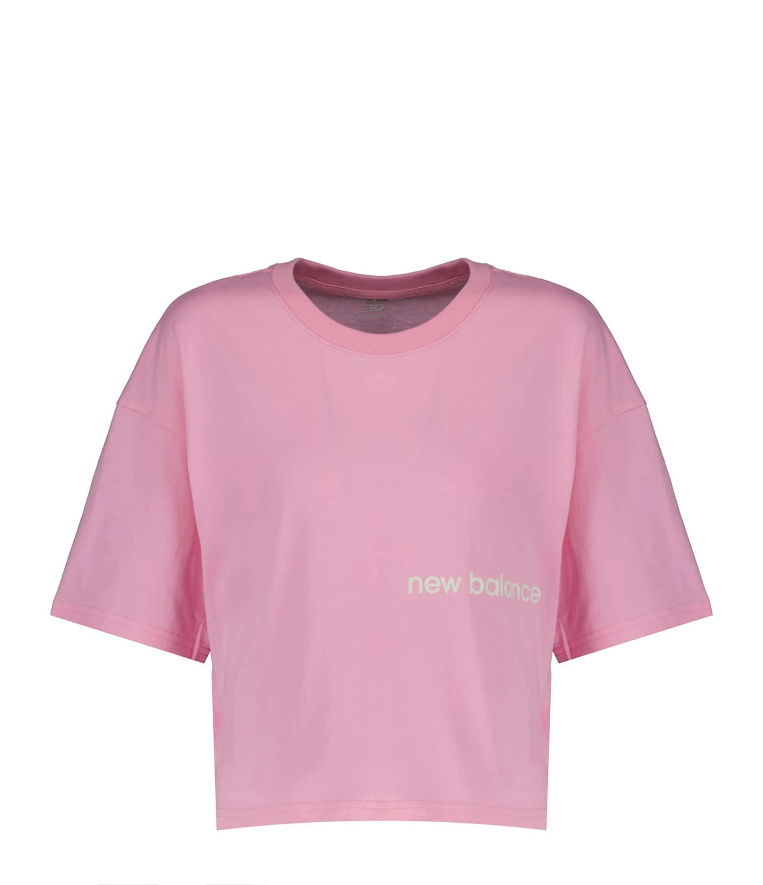 Tee-shirt court en coton rose avec inscription « new balance » sur la poitrine et logo sur la manche droite. Col rond. Manches courtes. Coupe oversize. Base droite.