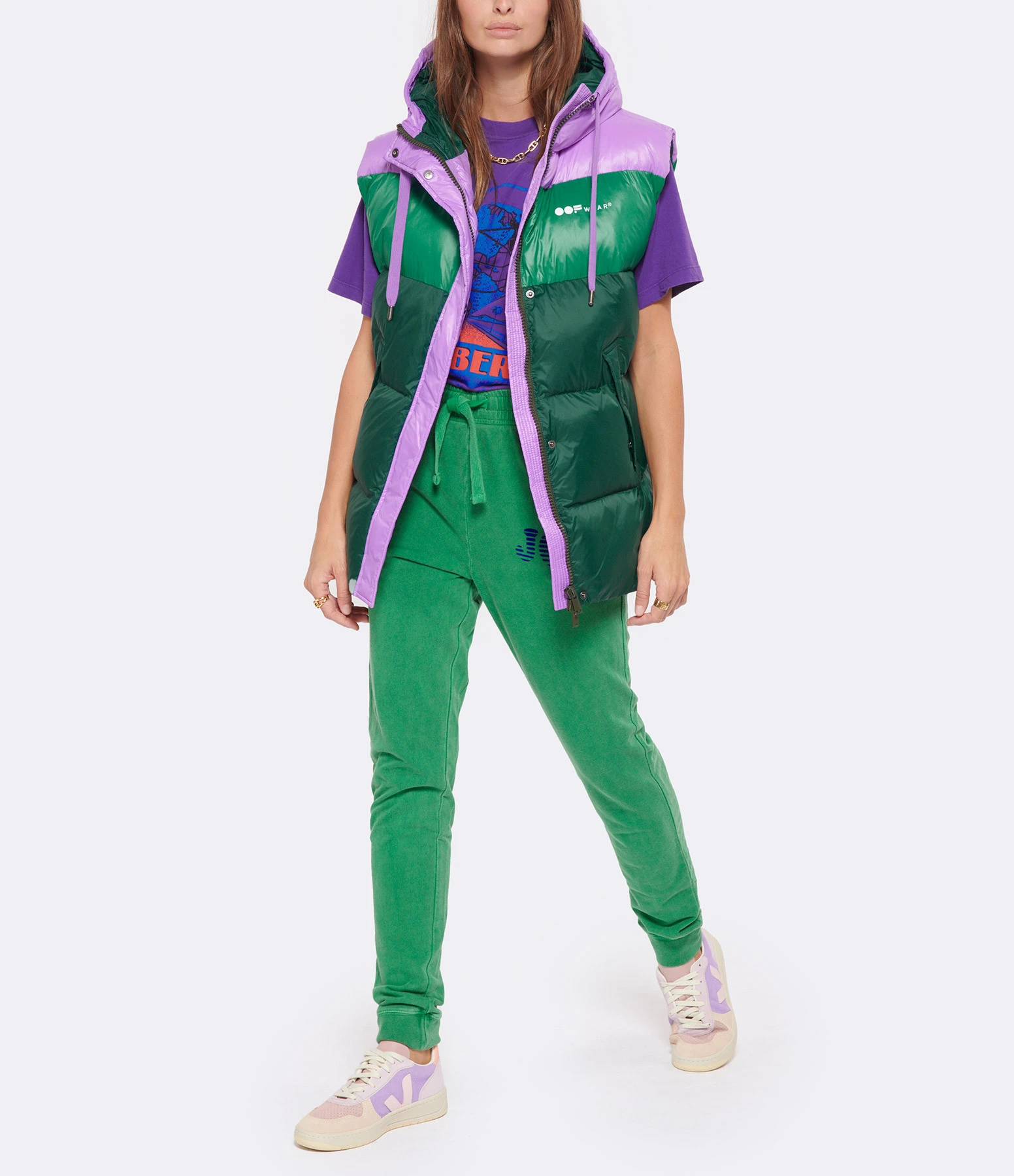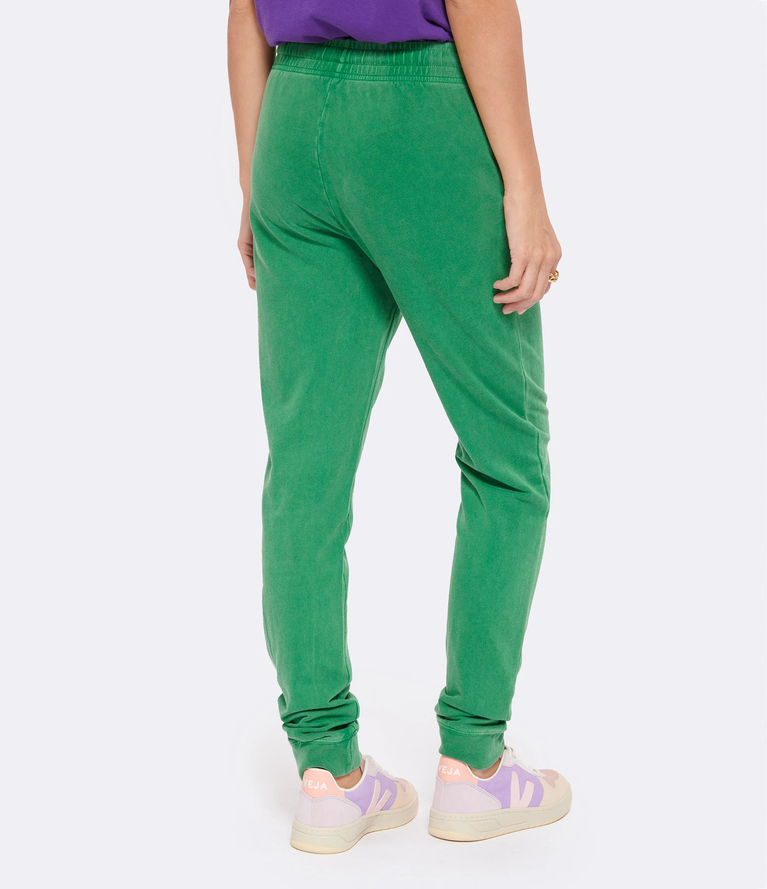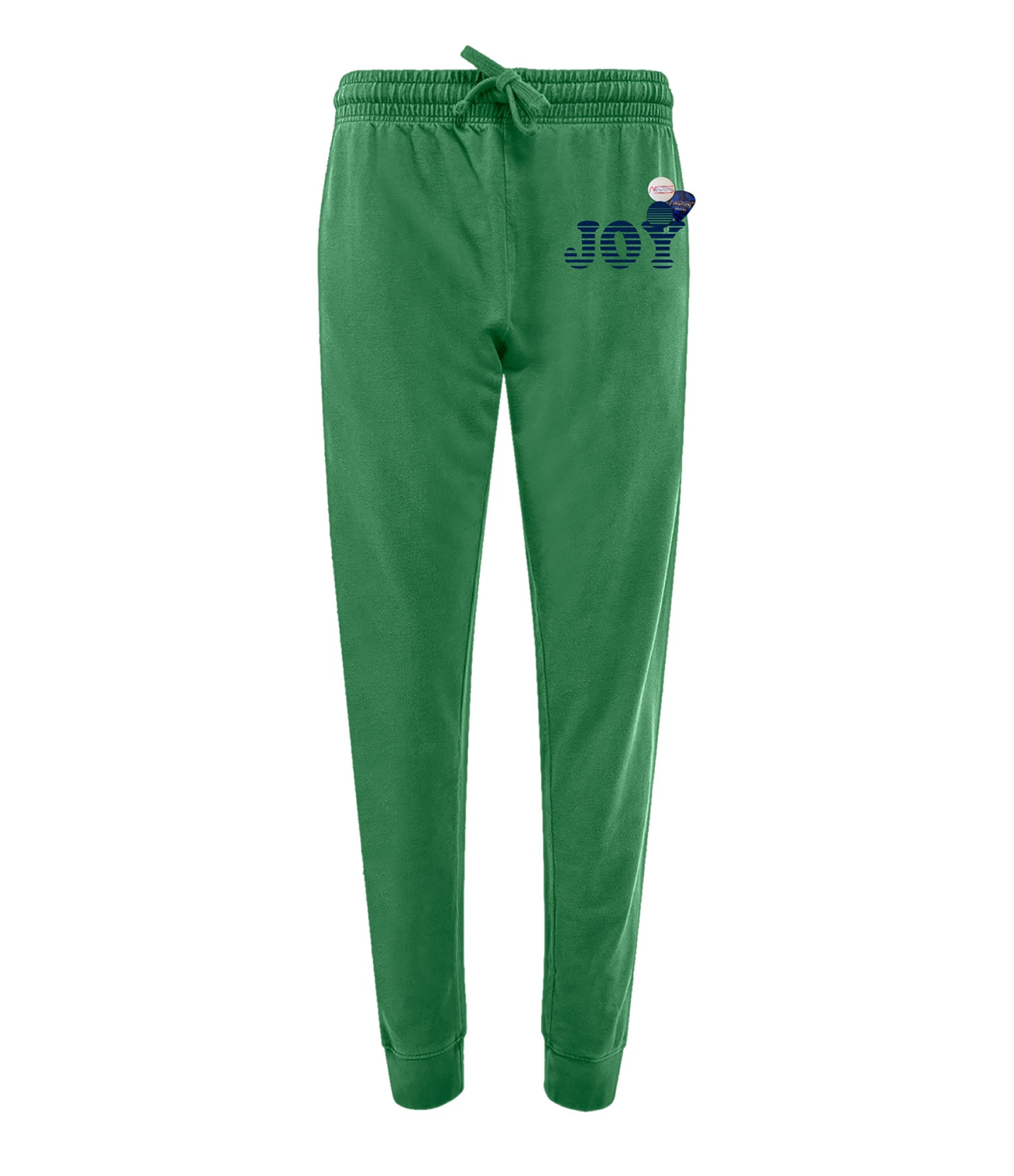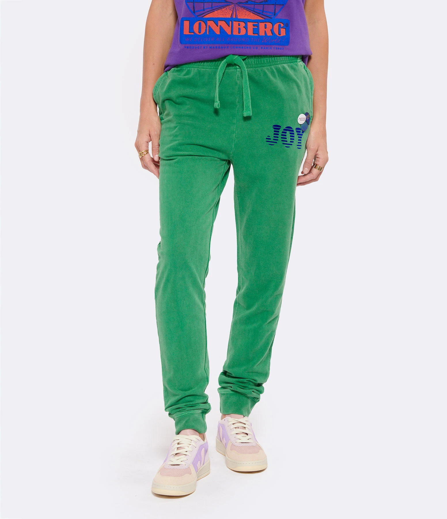 Pantalon de jogging en coton molletonné vert. Inscription « JOY » flockée velours en bleu sur le devant. Deux pin’s et un médiator sur le devant. Taille élastiquée avec liens de serrage. Deux poches prises dans les coutures latérales sur le devant. Coupe droite. Base droite resserrée.