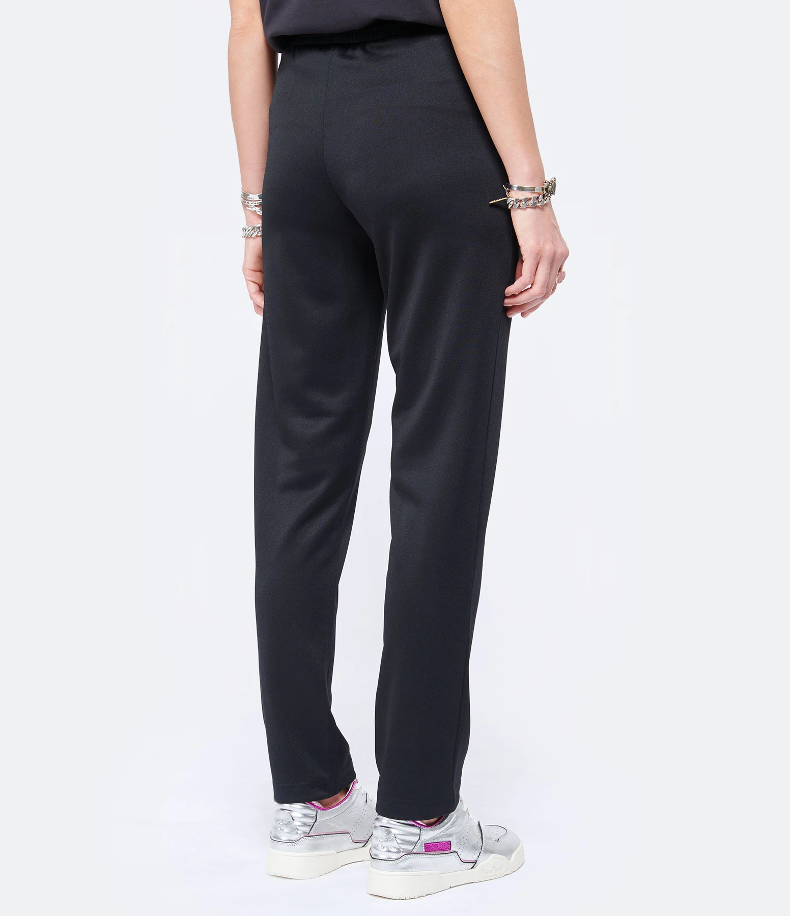 Jogging en tissu noir. Pli pressé à l’avant. Deux poches fendues sur les côtés. Taille élastiquée. Coupe droite.