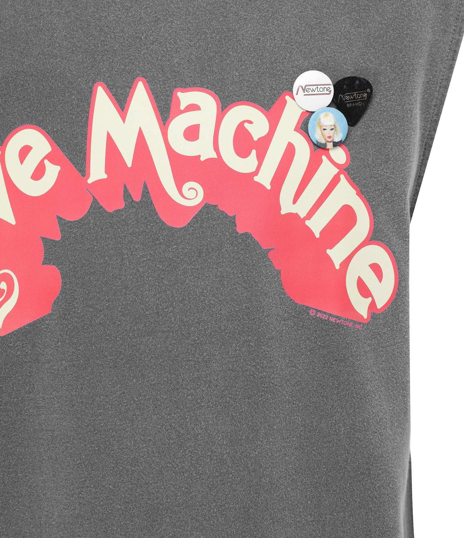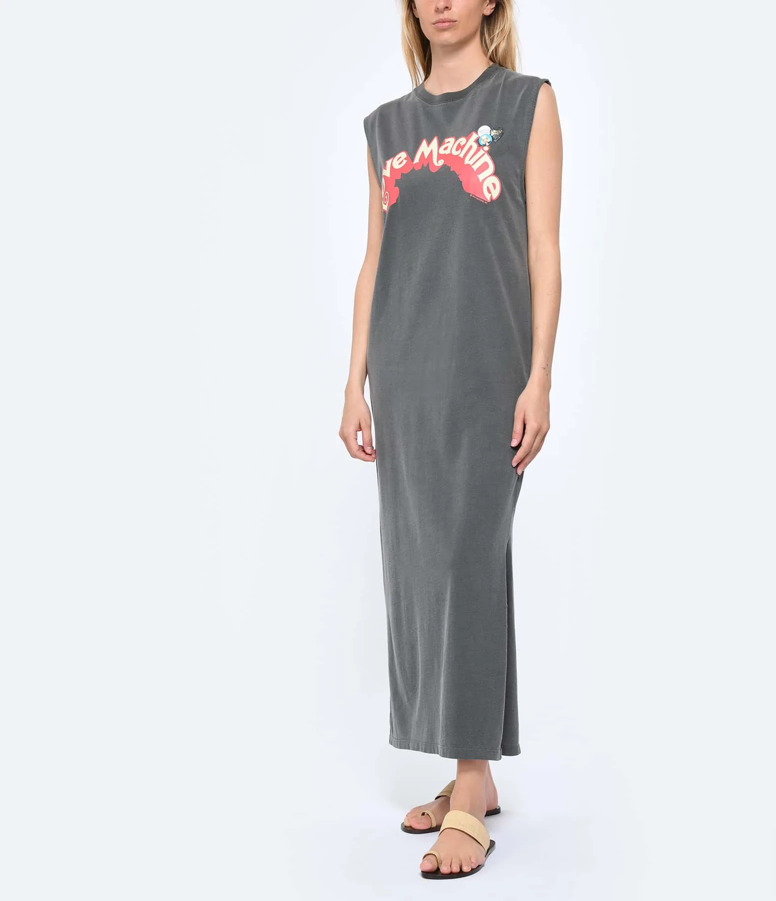 Robe débardeur en coton gris délavé. Sérigraphie « Love machine » rouge et écru à l’avant. Deux badges côté cœur. Fente sur le côté gauche. Col rond. Coupe droite. Base droite. Non doublée.