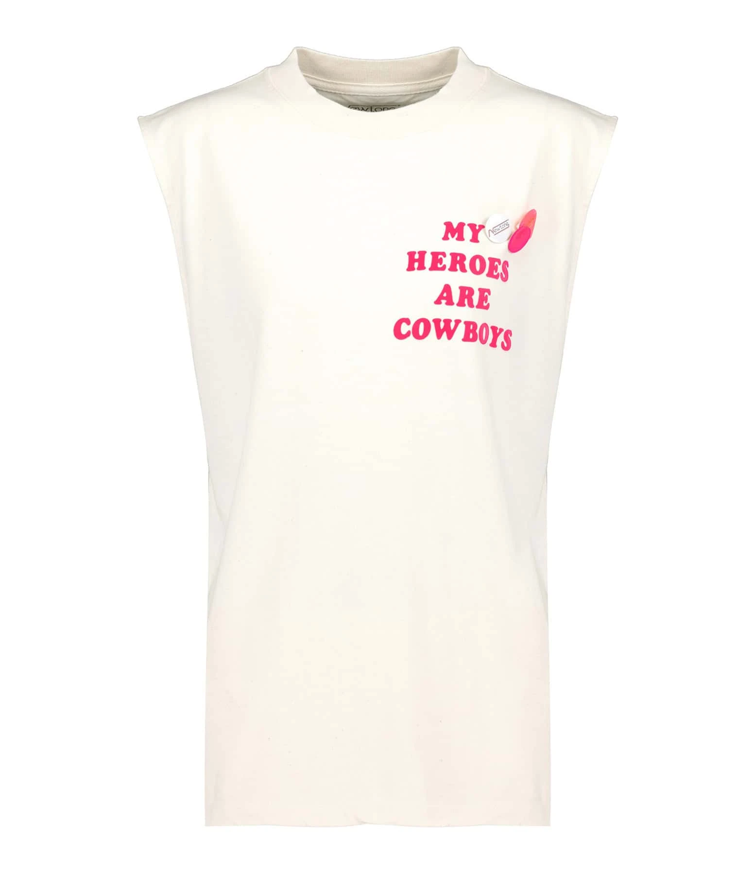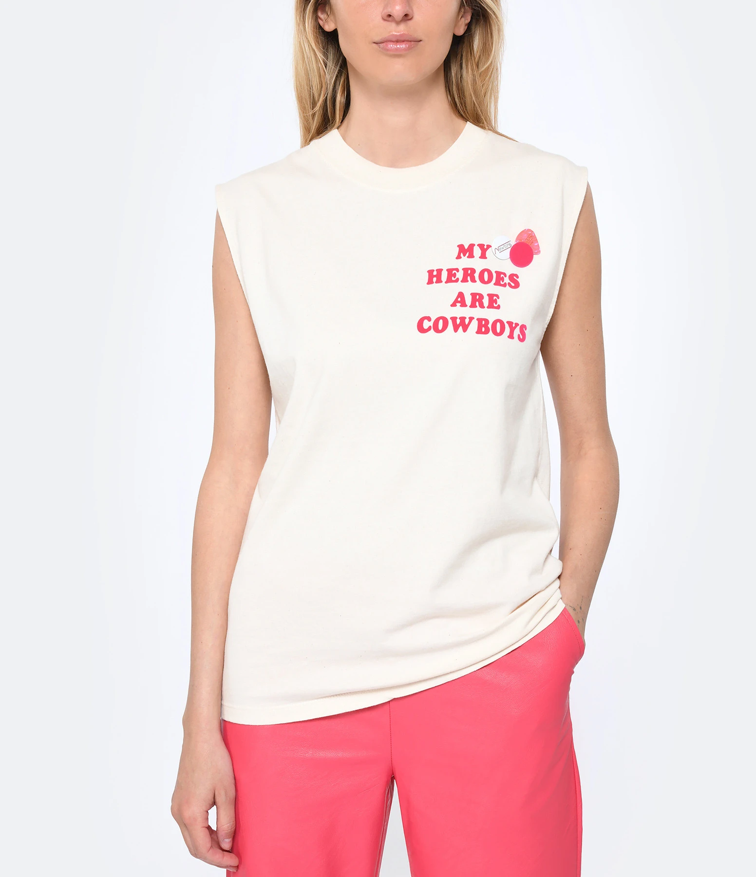Débardeur en coton écru à inscription fuchsia niveau poitrine sur le devant. Sans manches. Col rond côtelé. Trois badges côté cœur. Coupe droite. Base droite.
