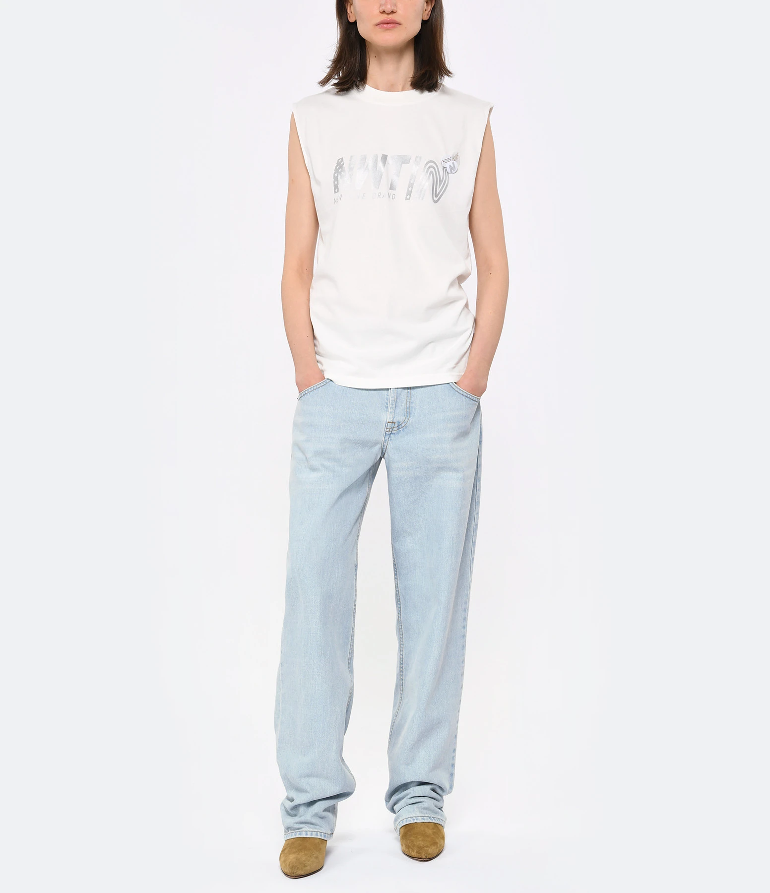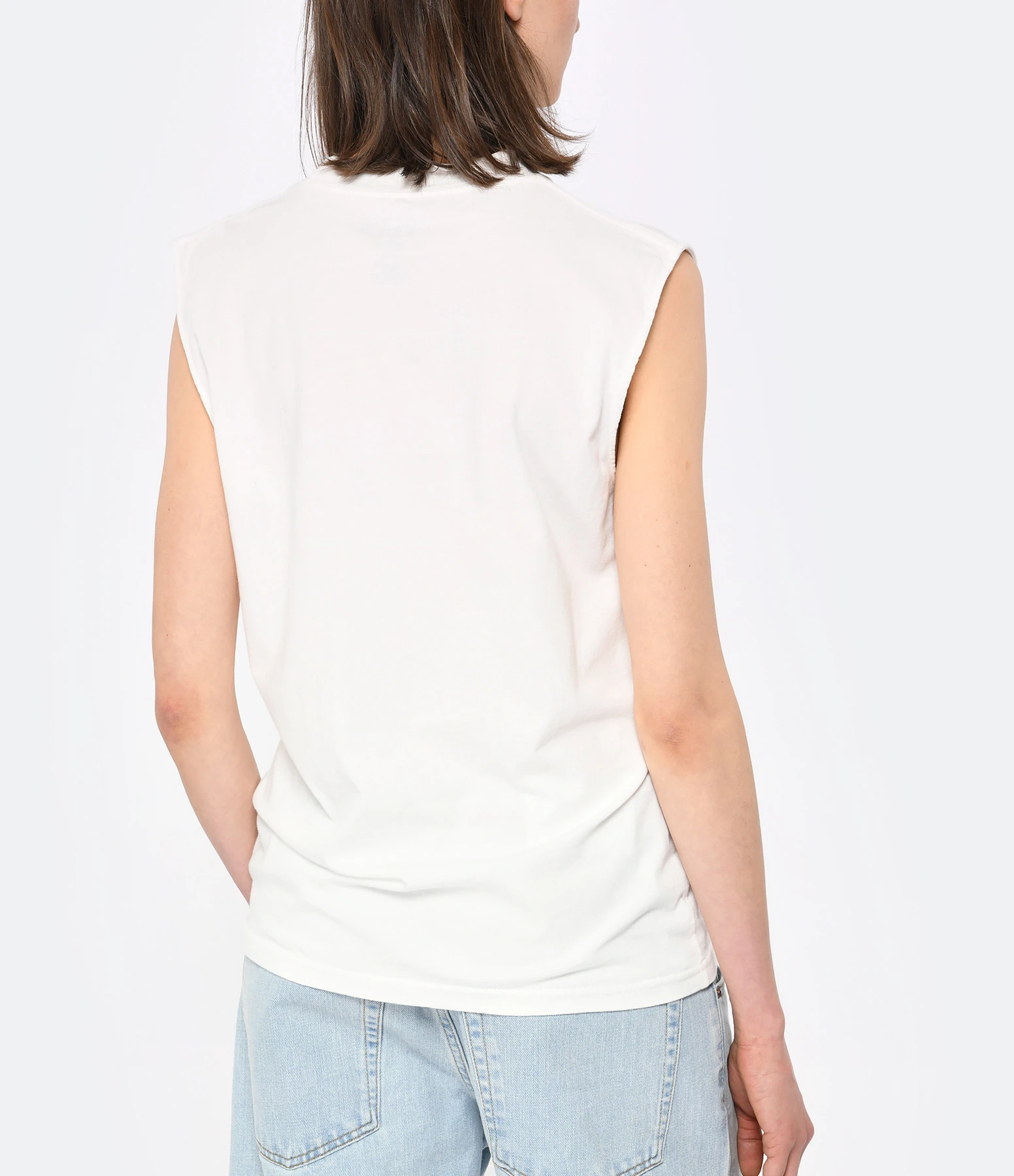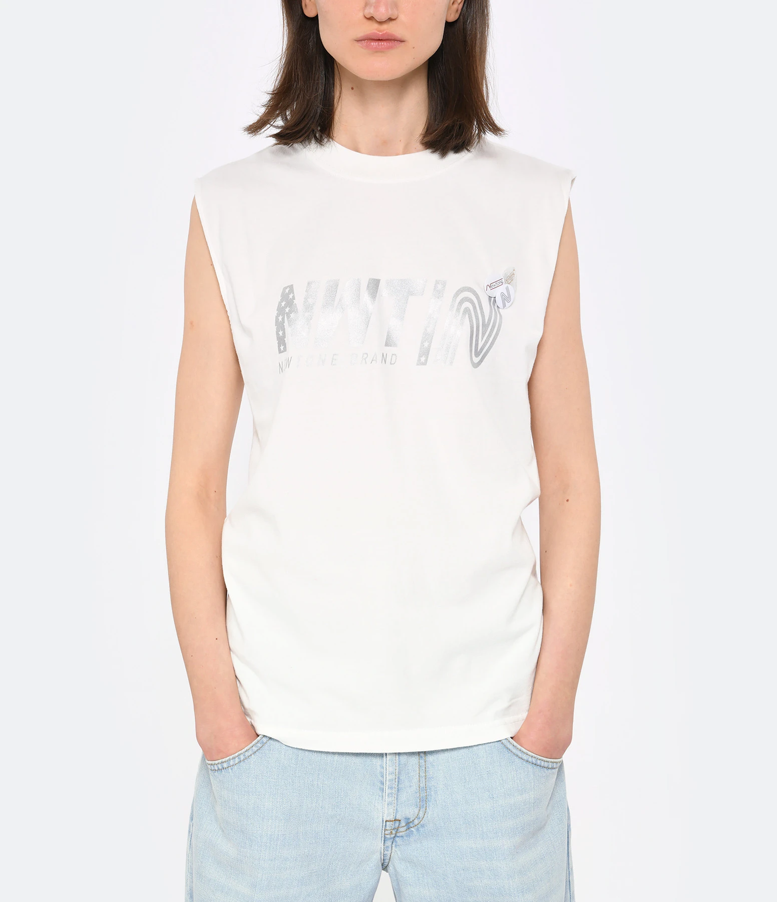Débardeur en coton blanc à inscription NEWTONE argentée sur le devant. Sans manches. Col rond côtelé. Trois badges côté cœur. Coupe droite. Base droite.