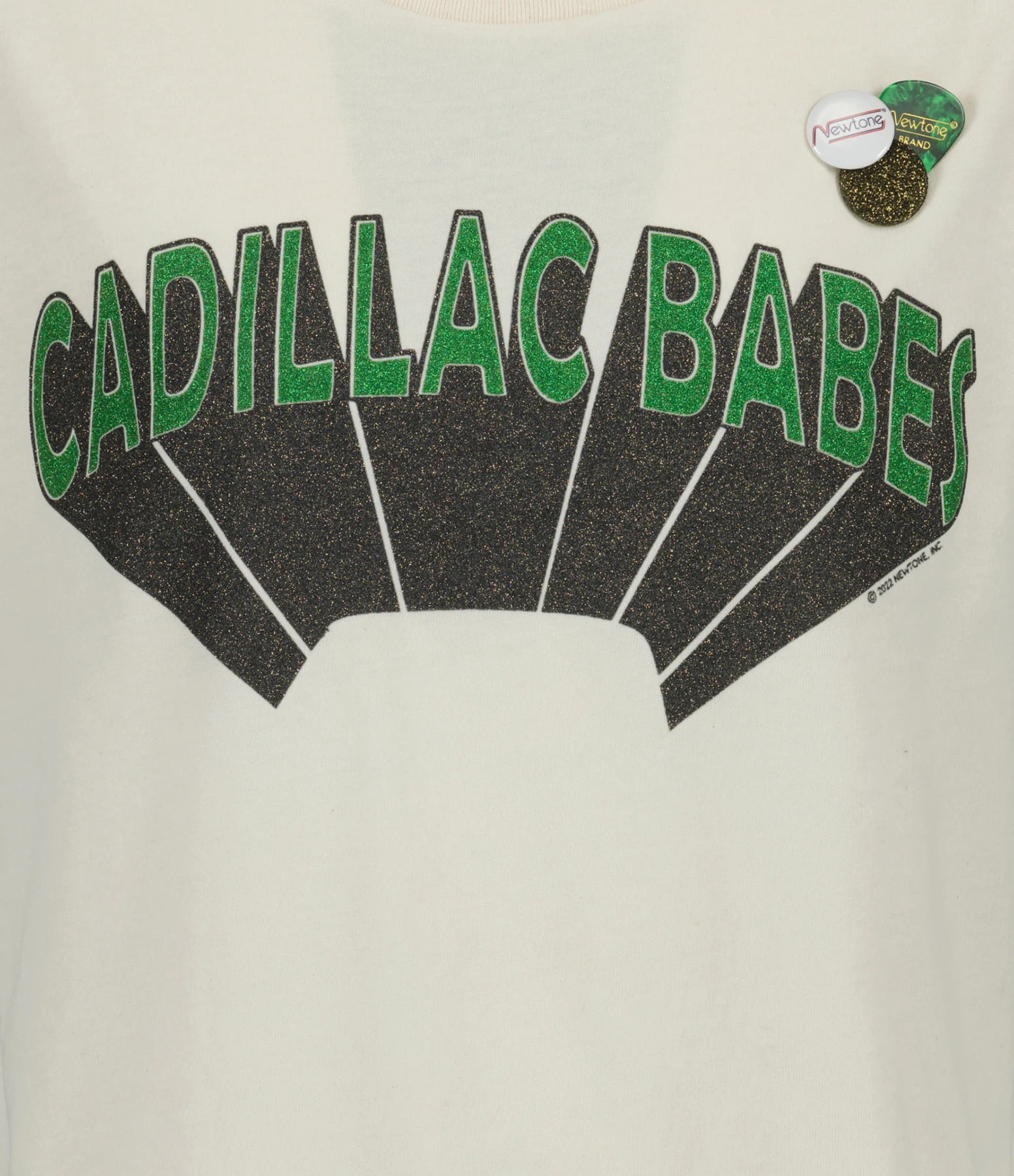 Tee-shirt en coton écru sérigraphié « CADILLAC BABES » en vert et noir pailleté. Trois badges côté cœur. Manches courtes. Col rond effet usé. Base droite effet usé.