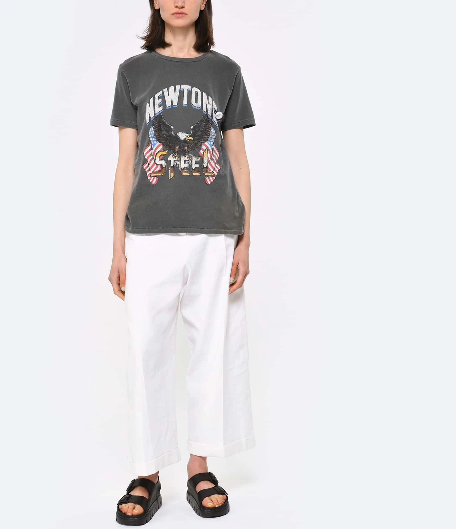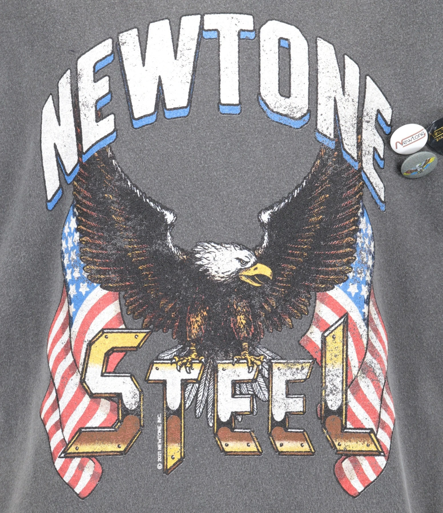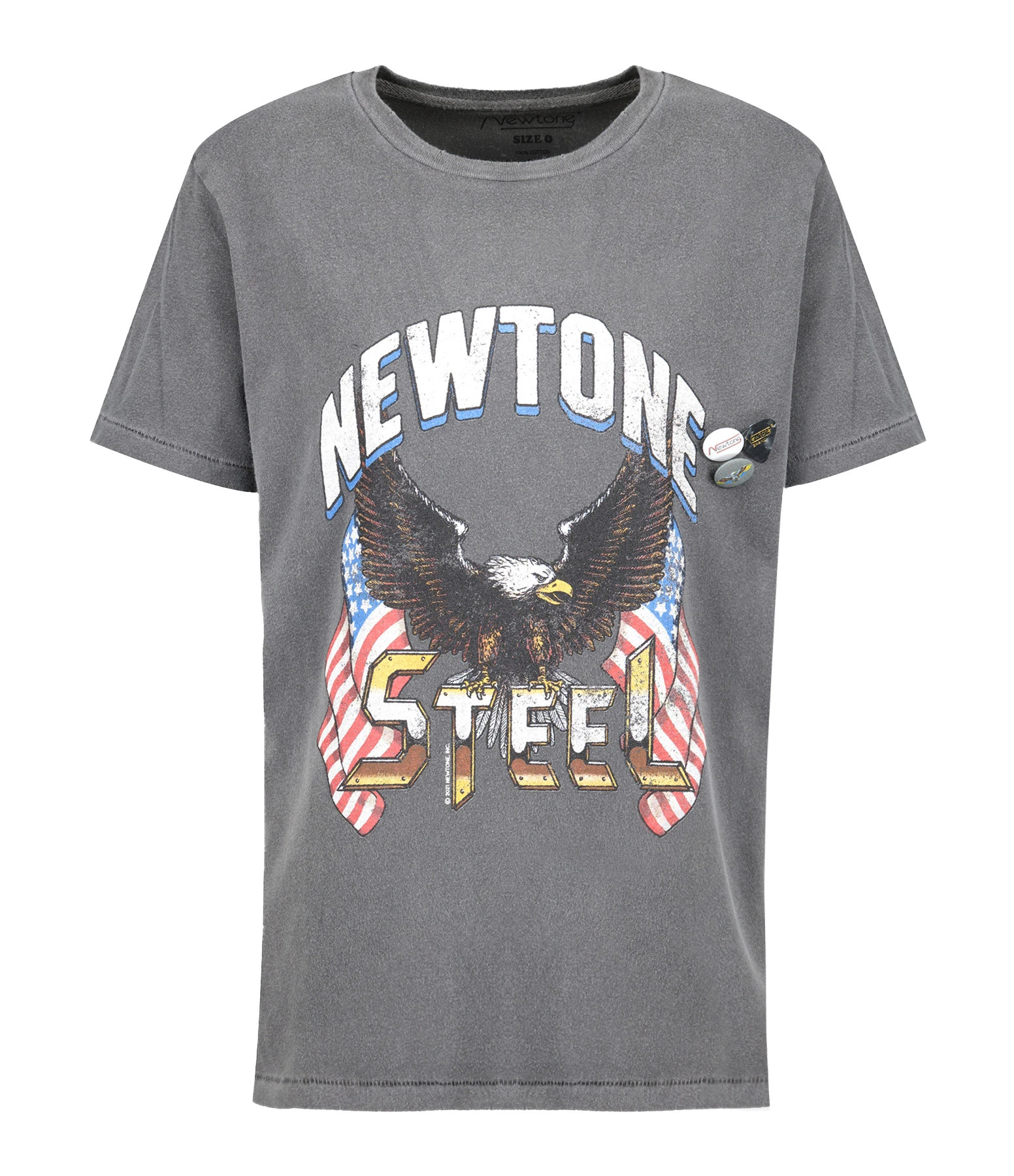 Tee-shirt en coton gris délavé orné d’un aigle, d’inscriptions multicolores et de deux badges et un médiator sur le devant. Manches courtes. Col rond. Coupe droite. Base droite.