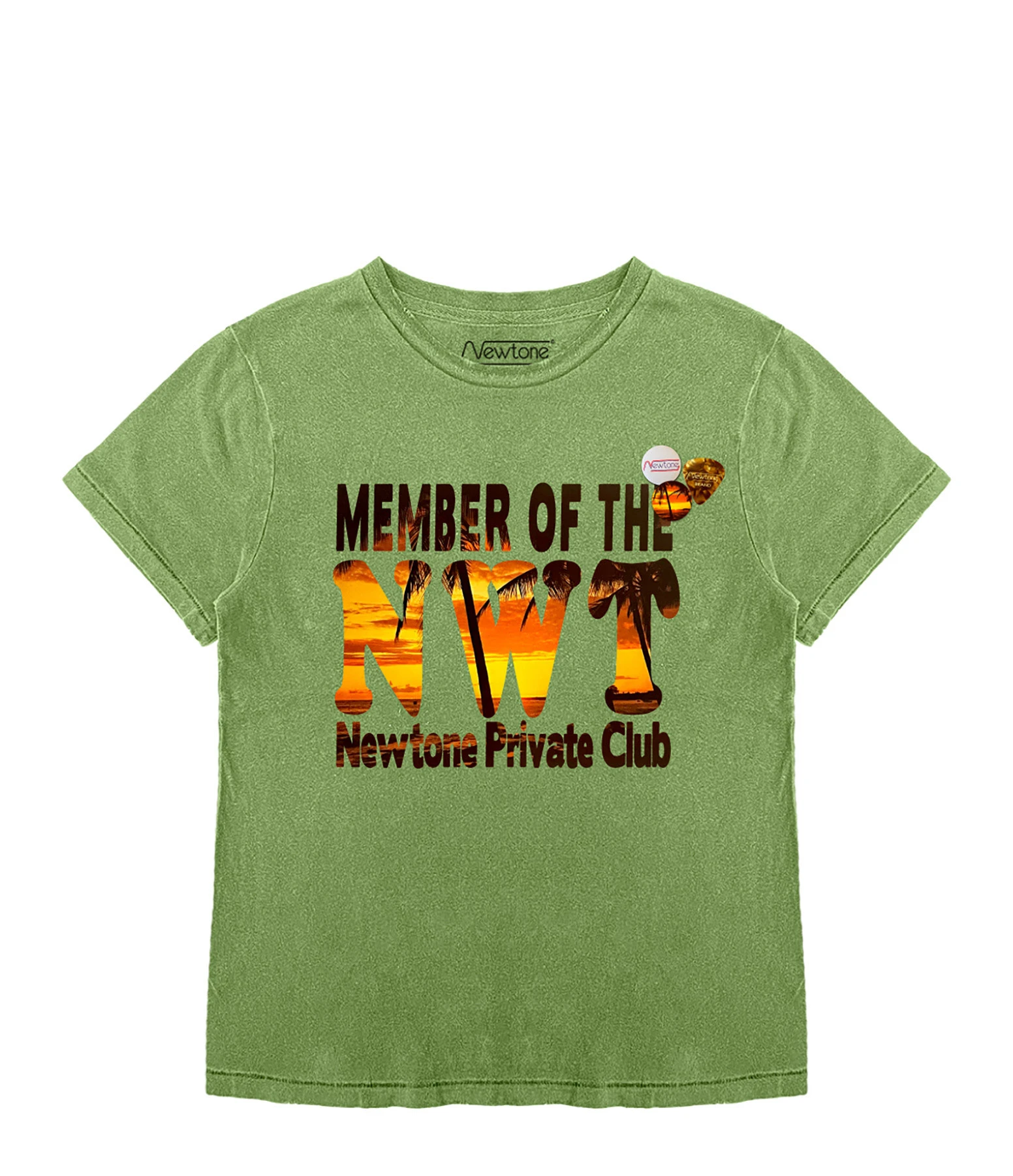 Tee-shirt en coton vert orné d’inscriptions multicolores et de deux badges et un médiator sur le devant. Manches courtes. Col rond. Coupe droite. Base droite.