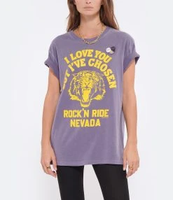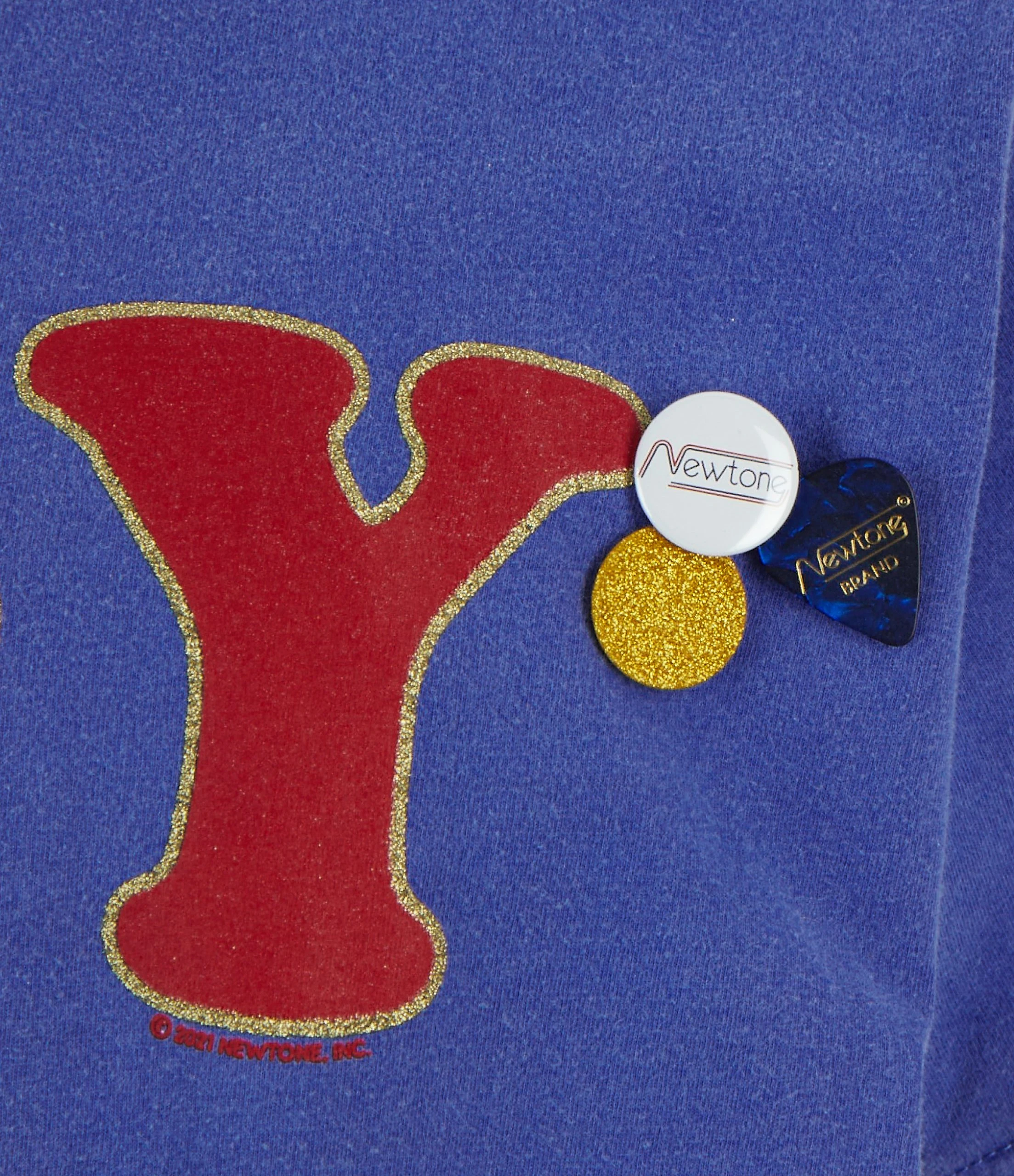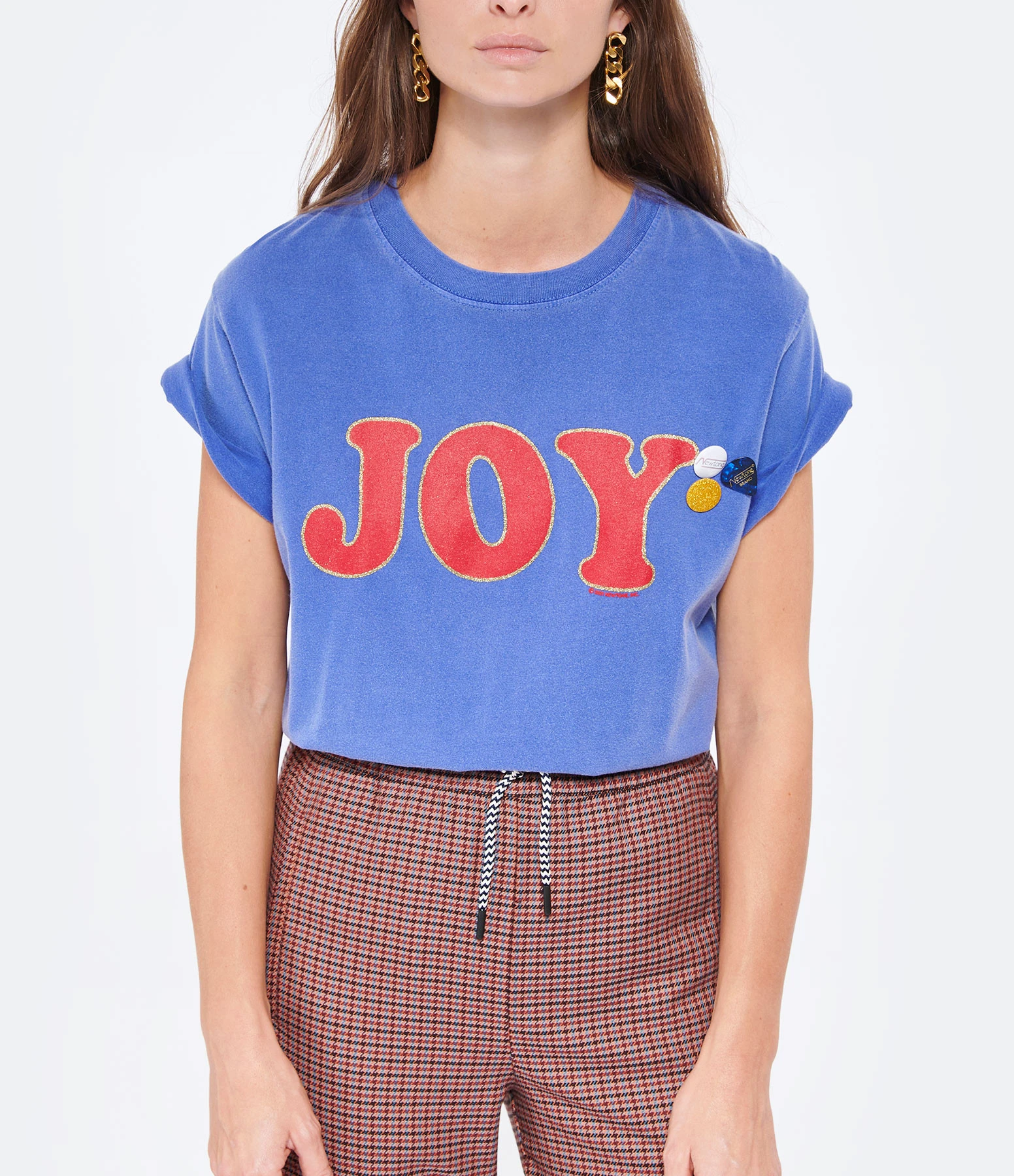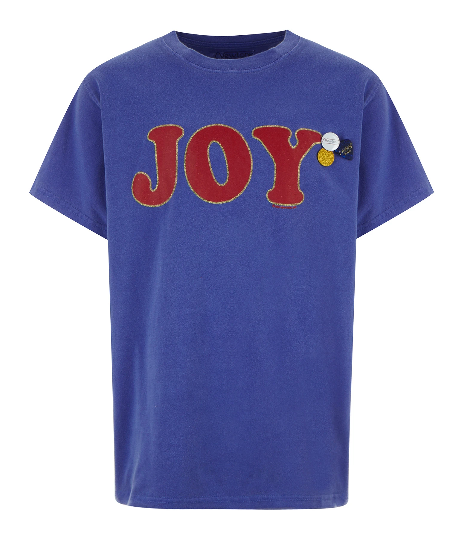 Tee-shirt en coton bleu sérigraphié « JOY » en rouge avec détails doré. Trois badges côté cœur. Manches courtes. Col rond. Base droite.