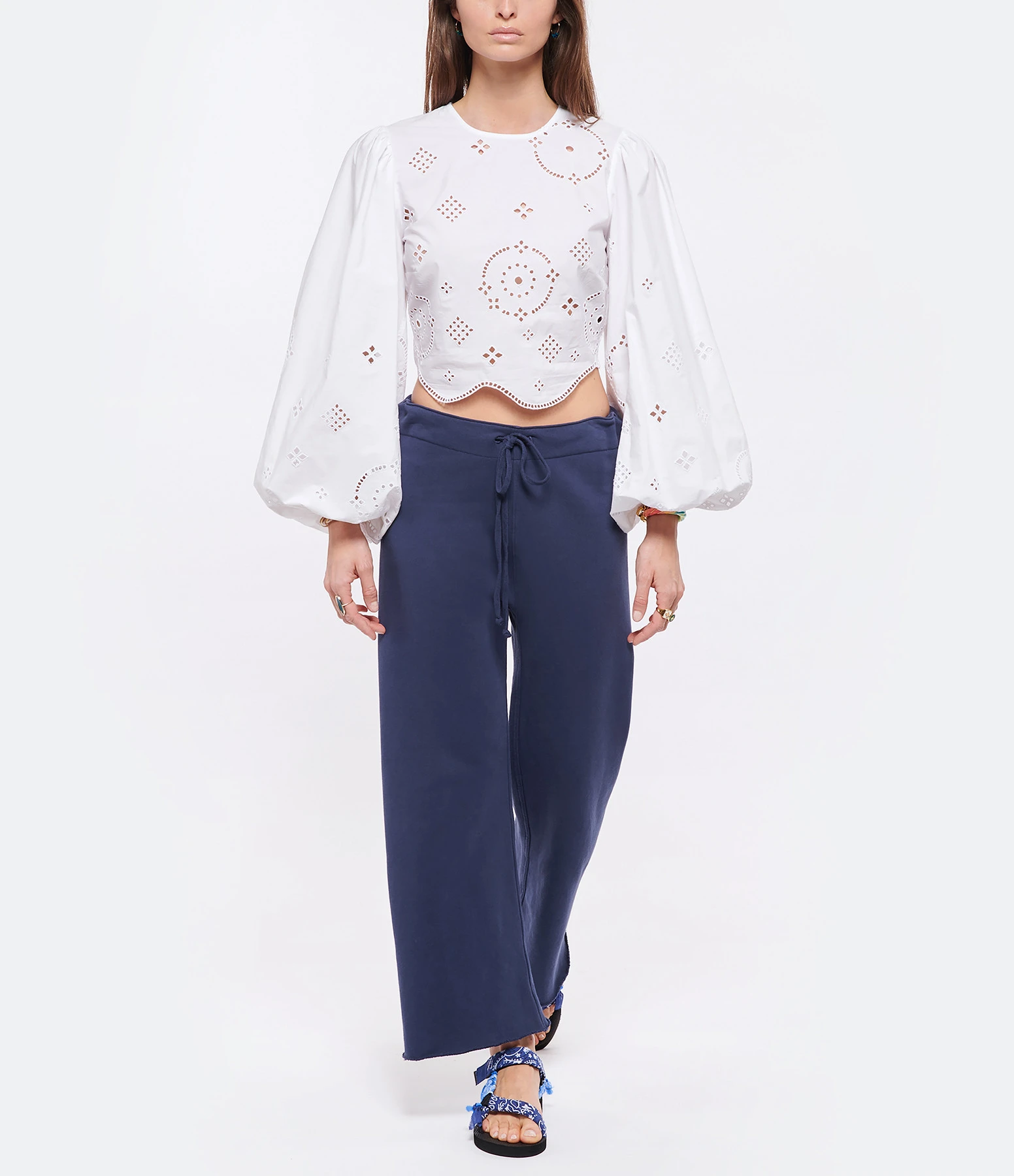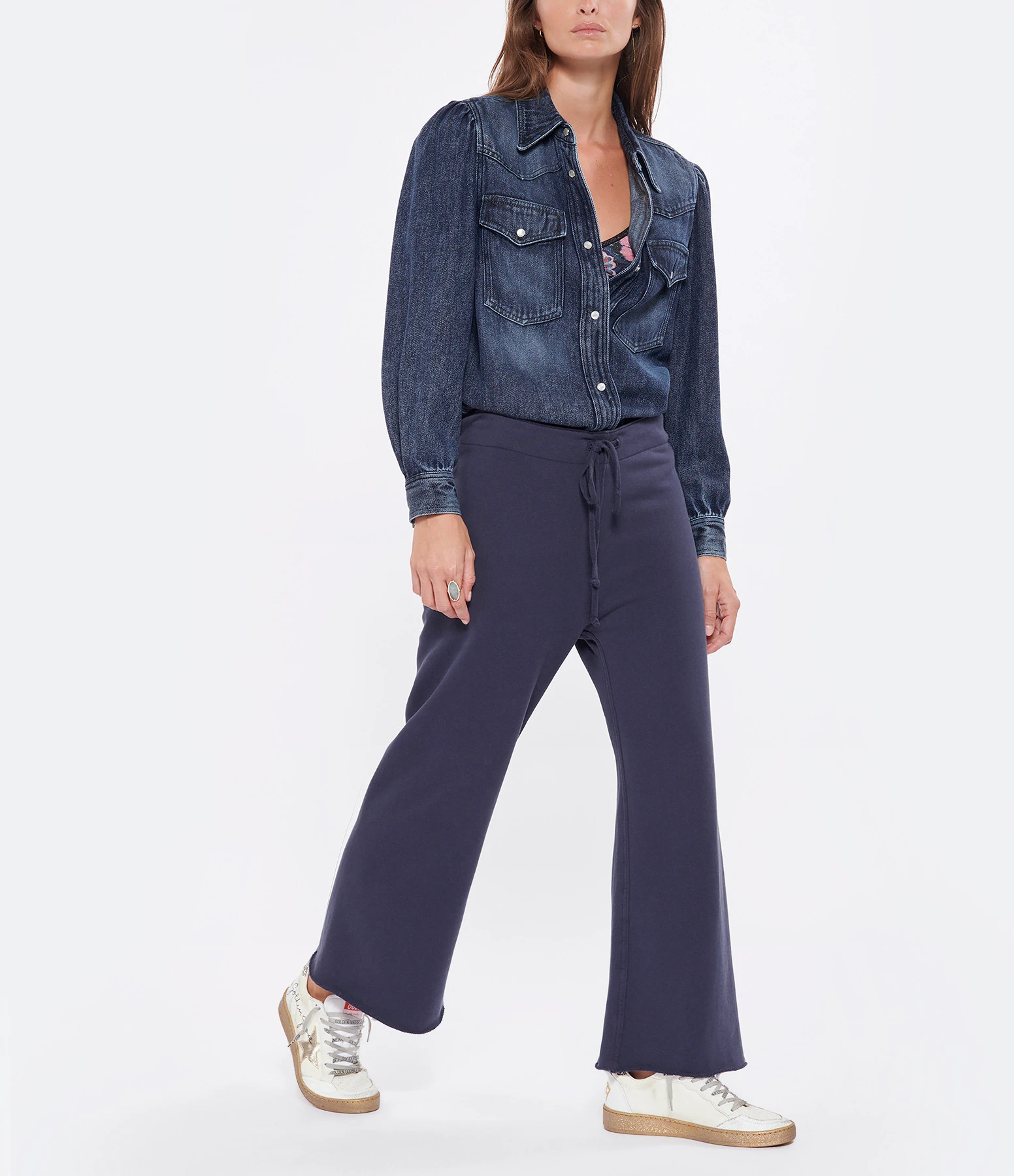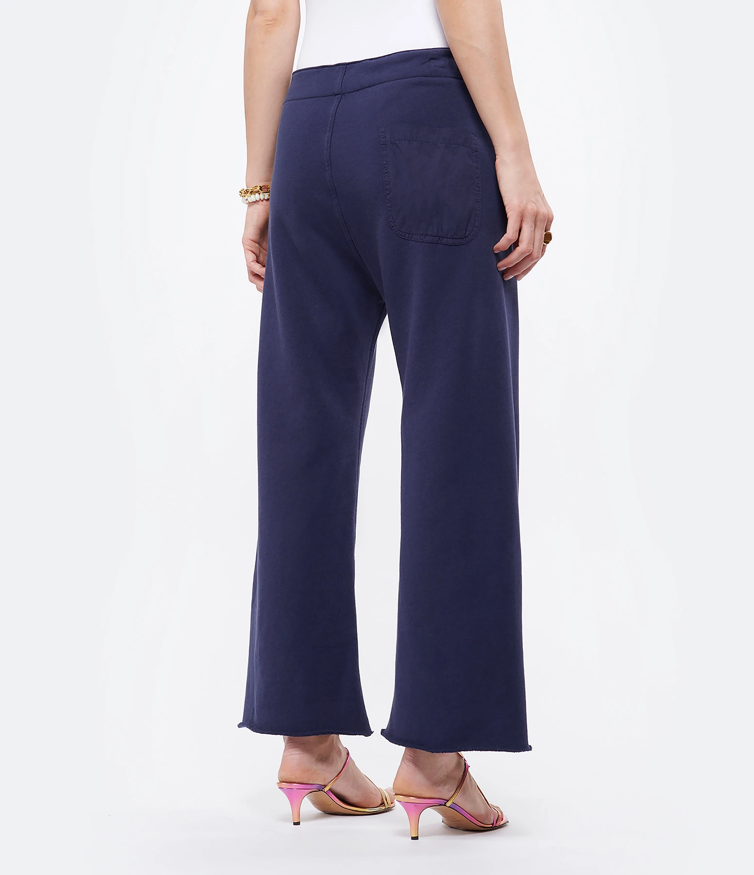 Jogging en coton bleu marine. Liens de serrage Ă la taille. Une poche plaquĂ©e Ă l’arrière. Fourche ample. Coupe large. Bas de jambe effilochĂ©. Non doublĂ©.