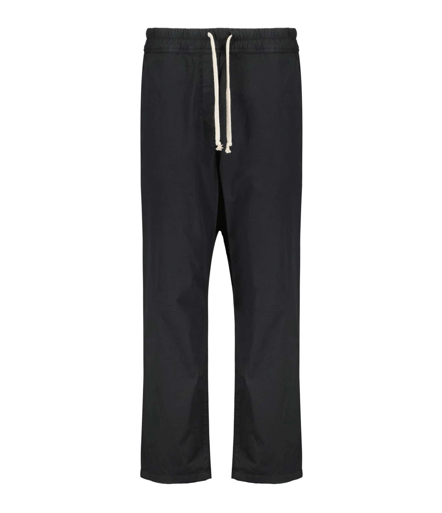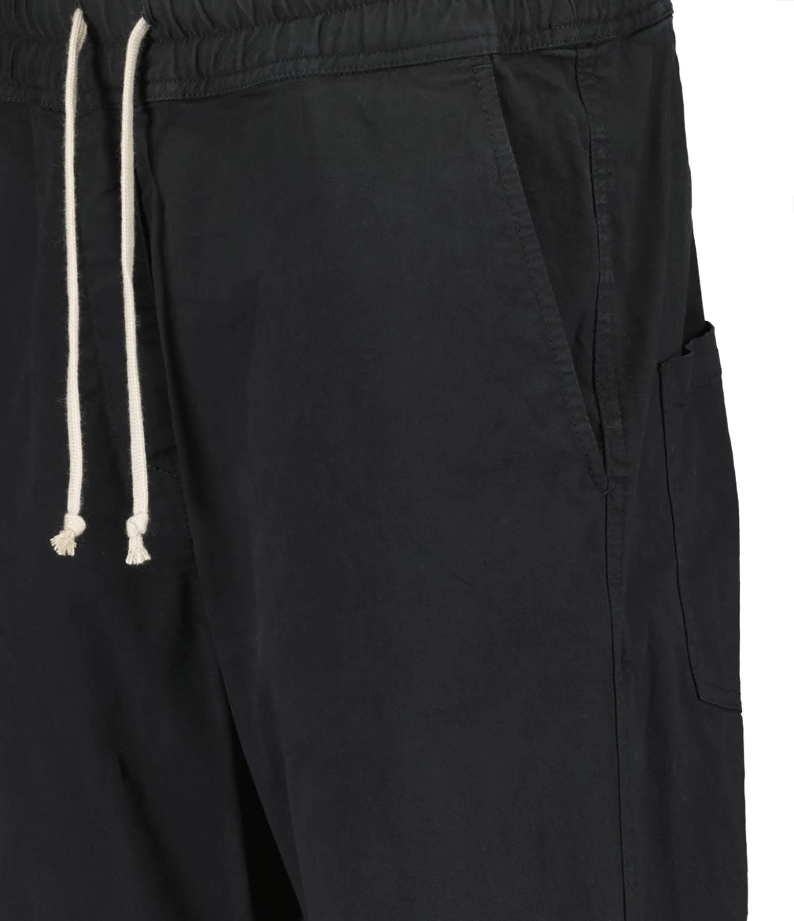 Pantalon style jogging noir. Taille élastiquée avec liens de serrage. Deux poches latérales et deux poches plaquées boutonnées à l’arrière. Jambes courtes.