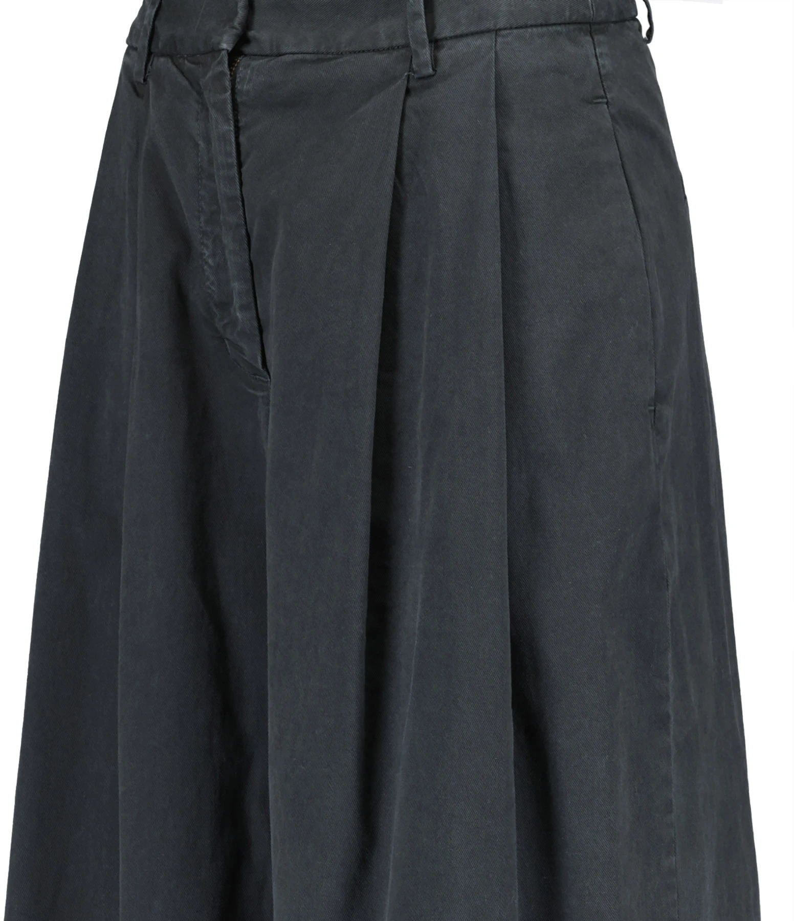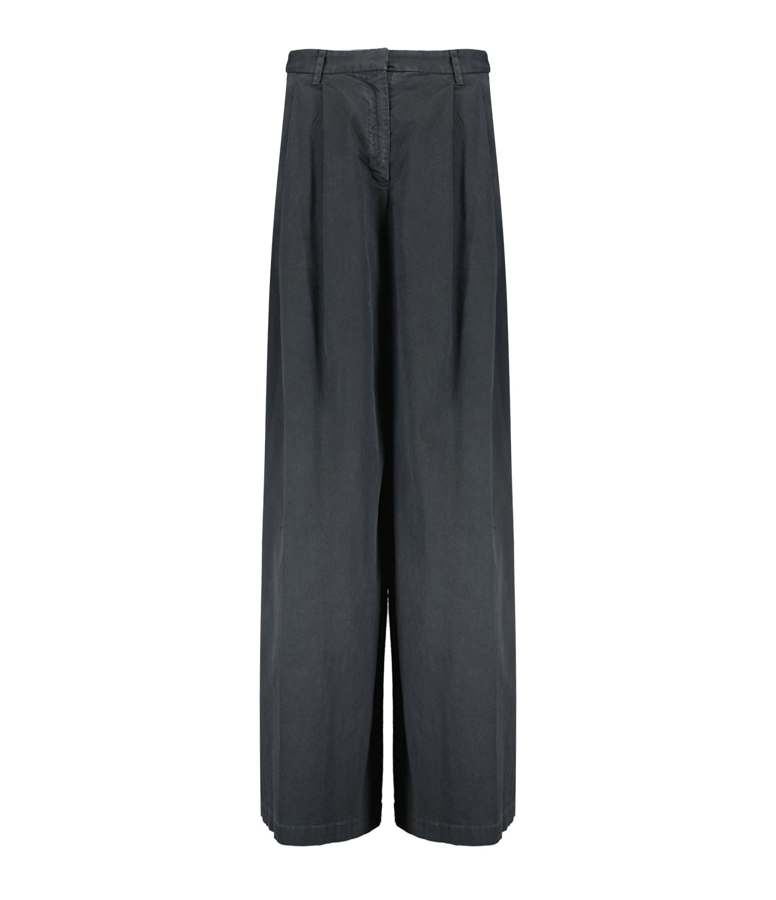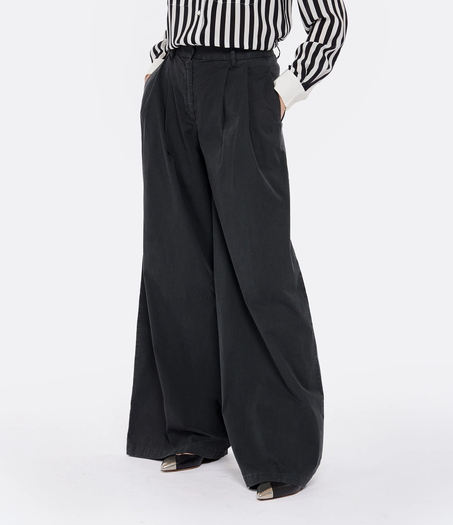 Pantalon à pinces large noir. Taille haute avec passants pour ceinture. Fermeture zippée sous la braguette et crochet. Deux poches prises dans la couture sur le devant. Deux fausses poches passepoilées dans le dos Coupe large. Base droite.