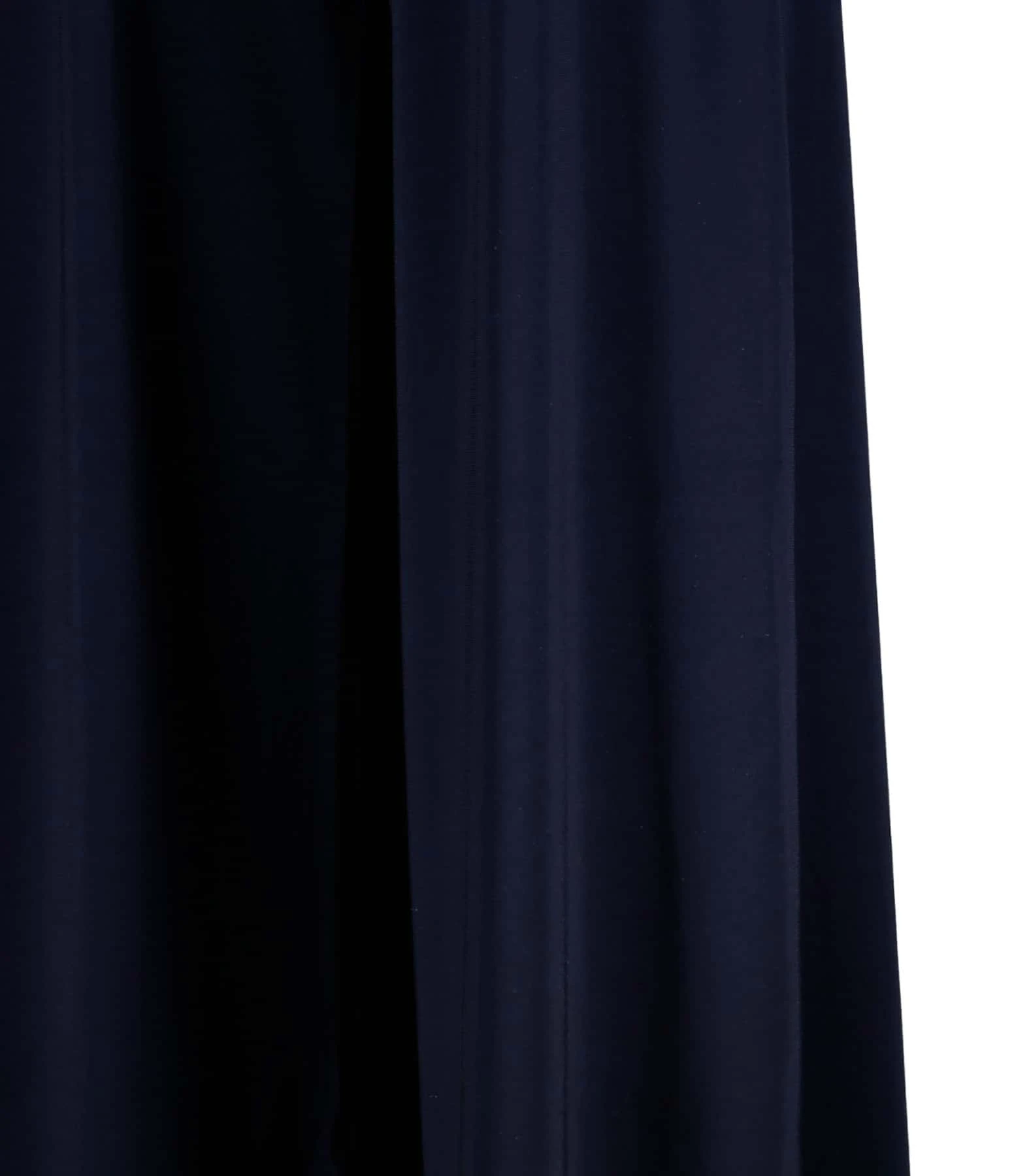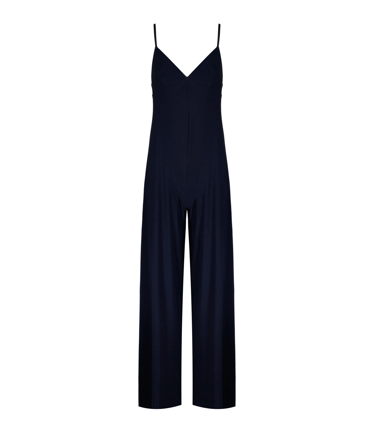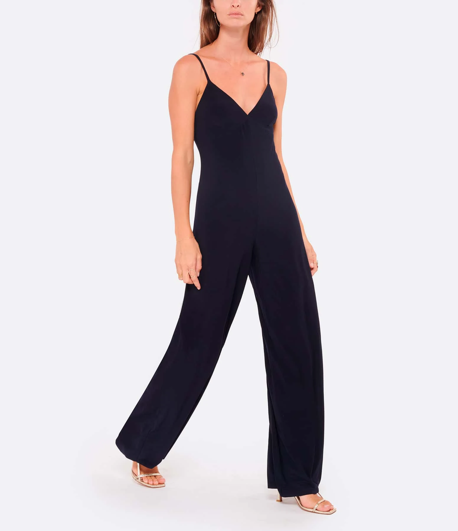 Combinaison pantalon en tissu stretch bleu marine. Col en V. Sans manches. Fines bretelle. Coupe buste ajustée. Coupe pantalon large. Base droite avec bords francs.