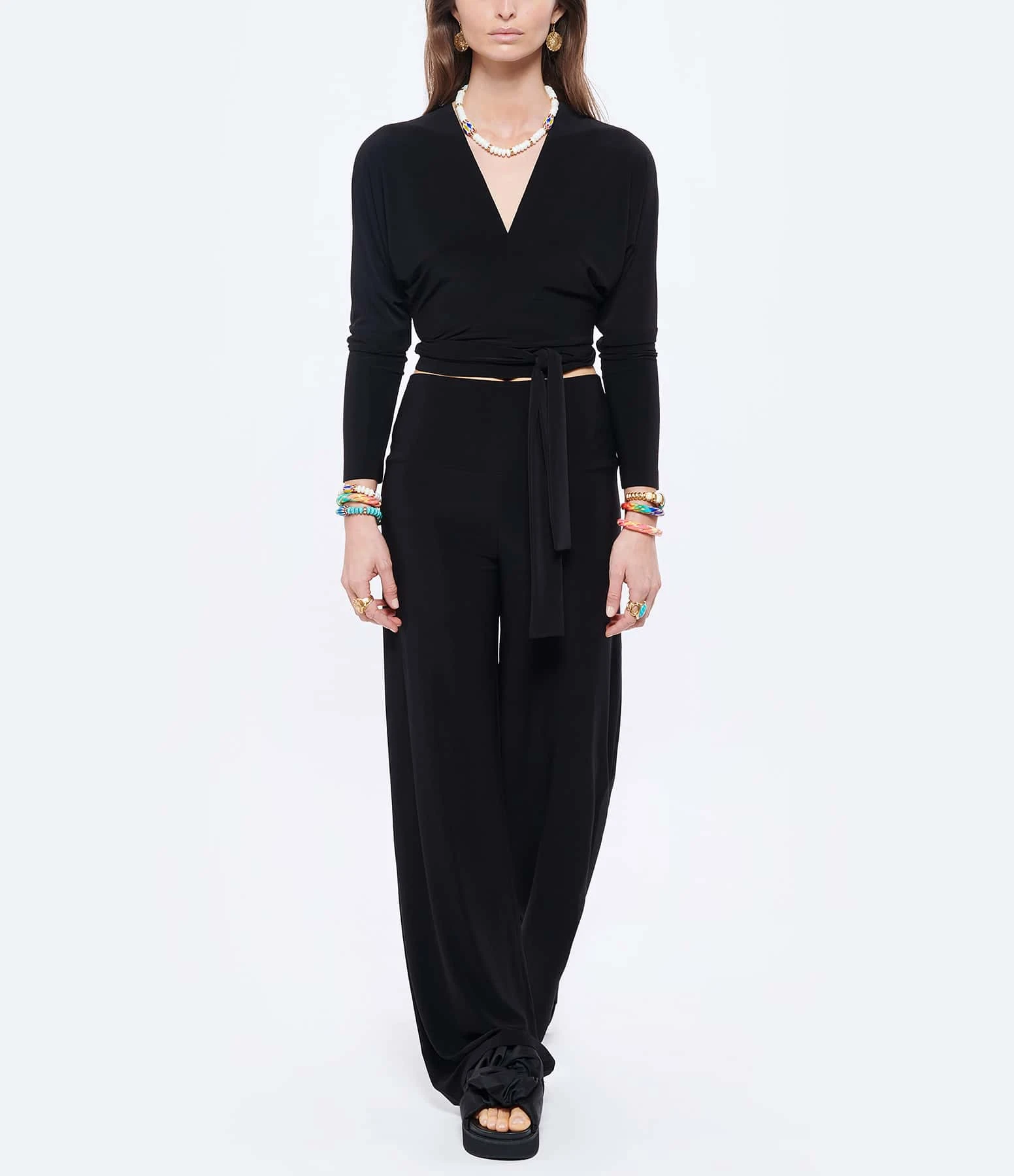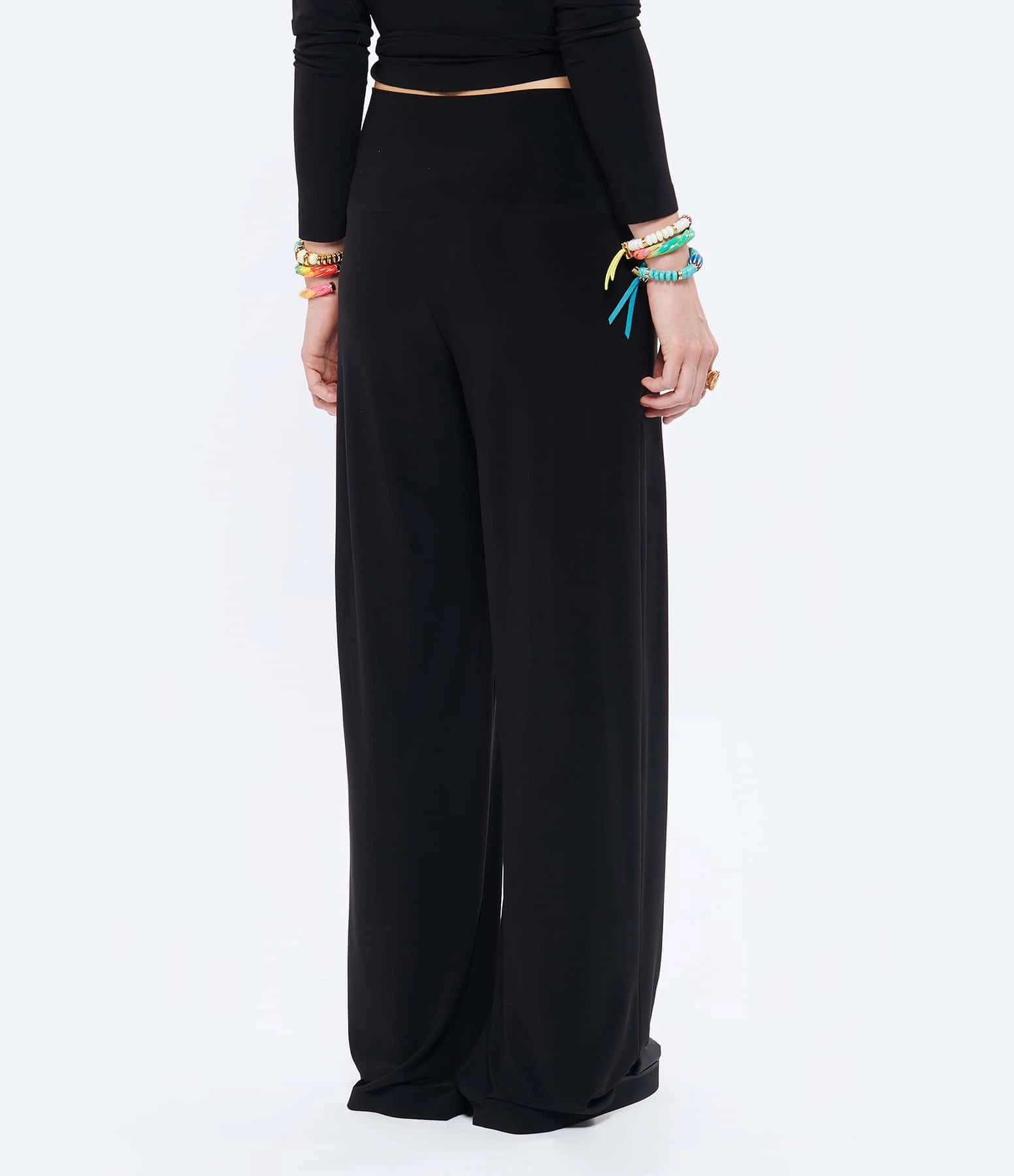 Pantalon fluide noir. Taille haute élastiquée. Coupe ample.