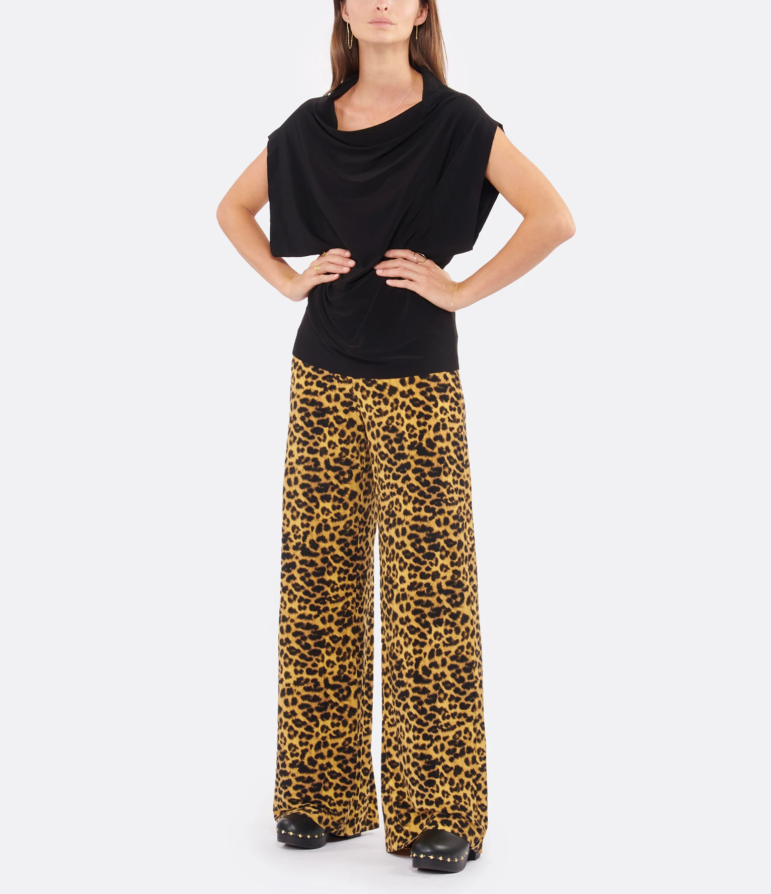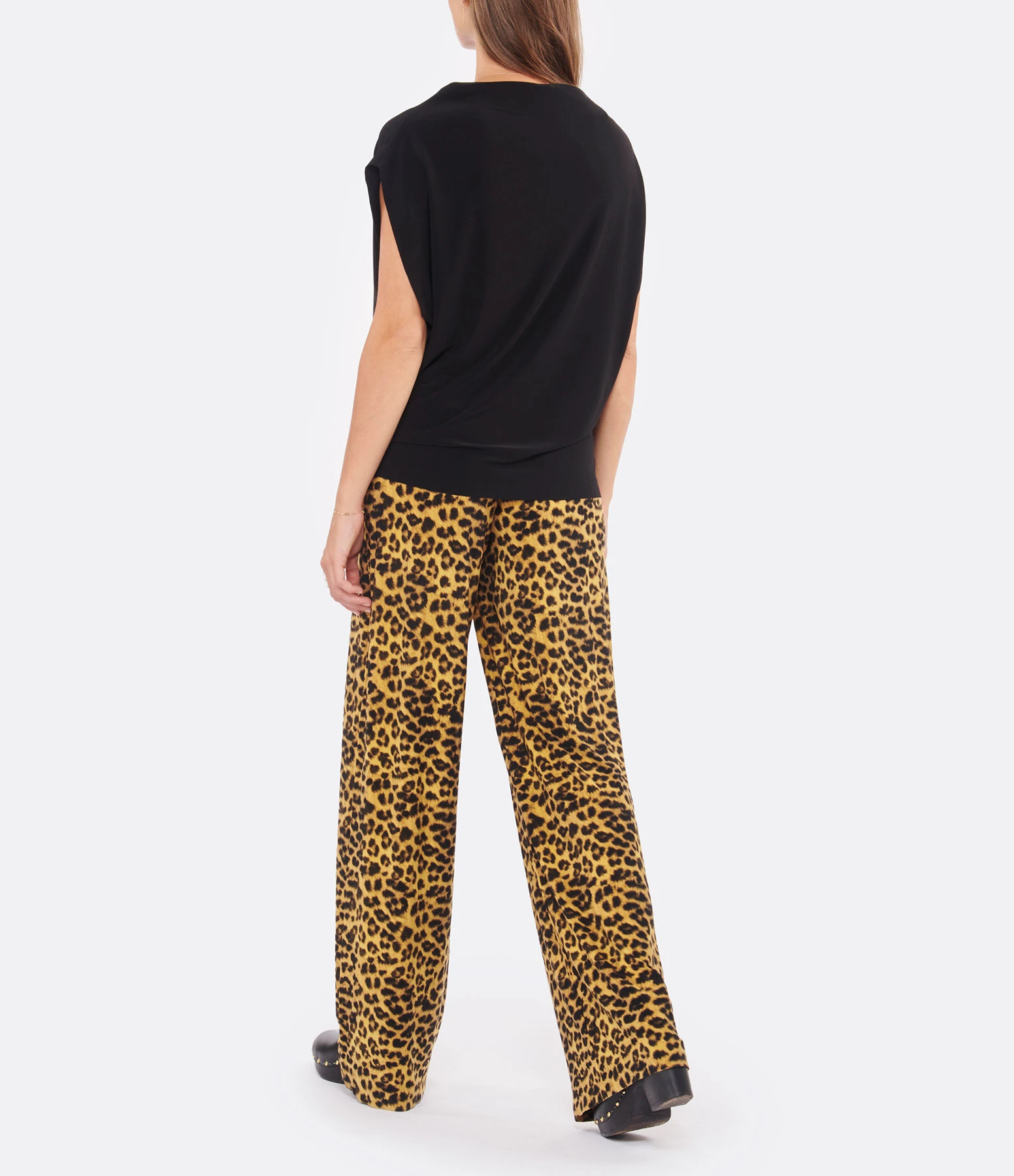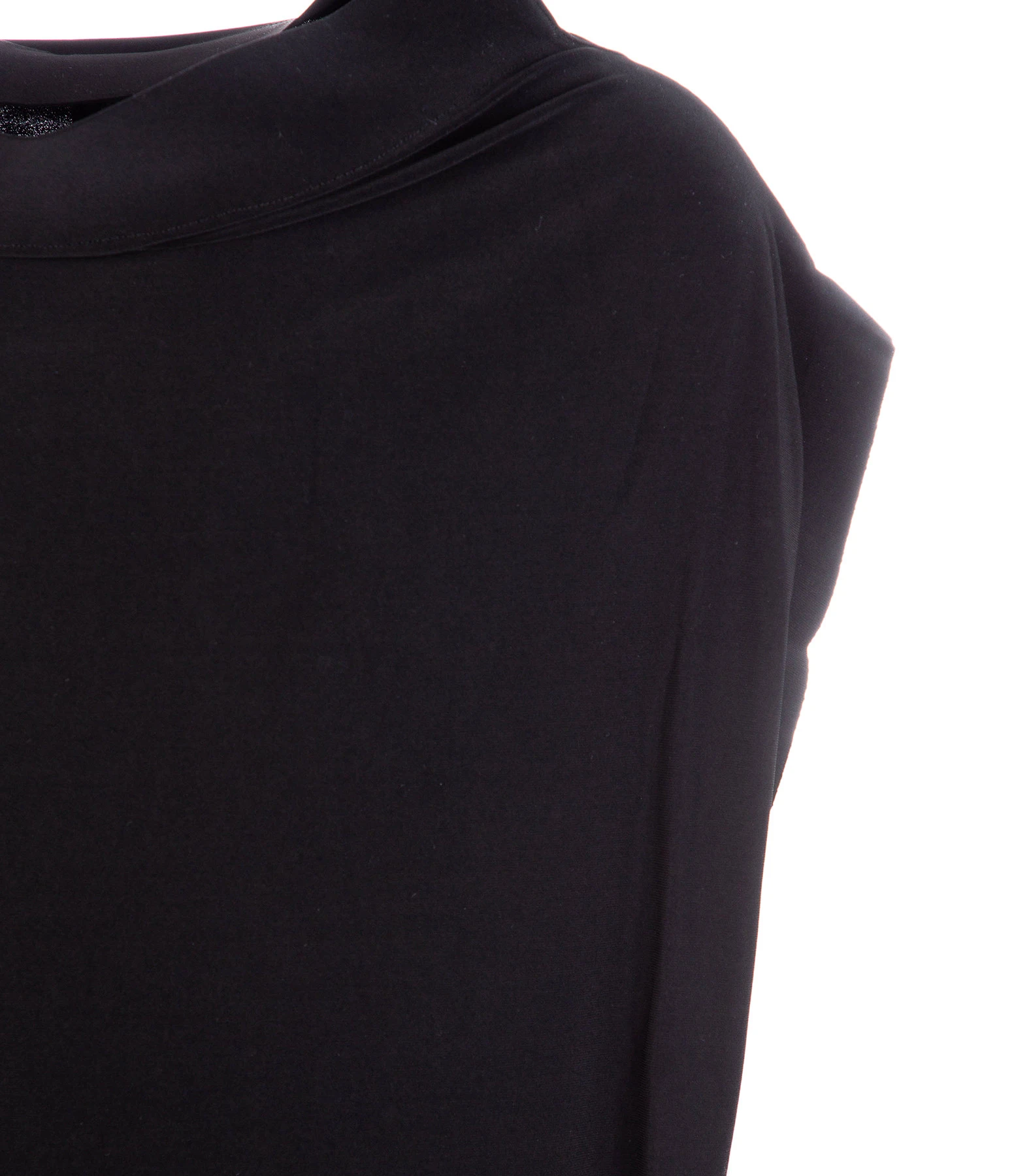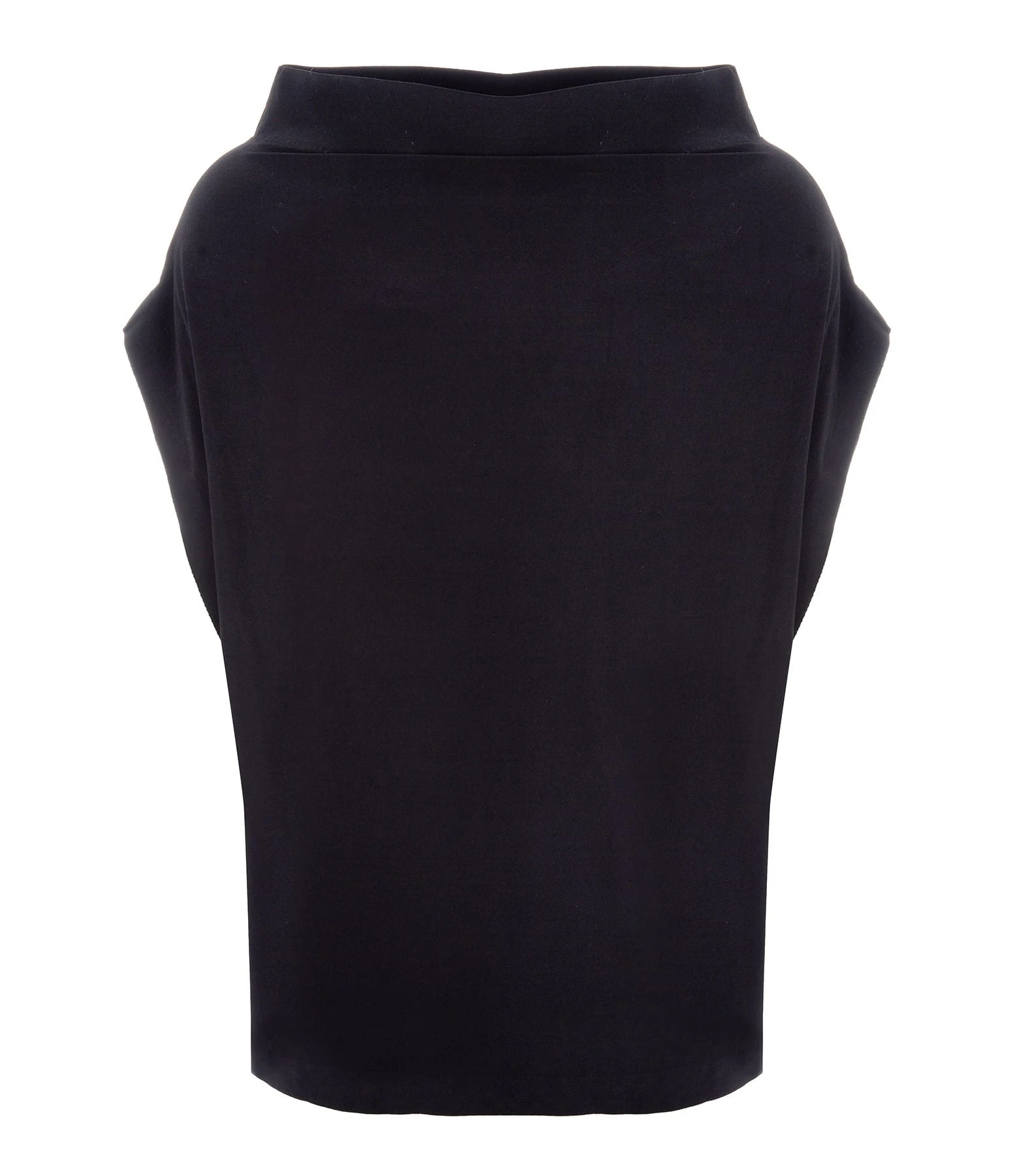 Top noir à manches élastiquées courtes chauve-souris. Col montant arrondi. Coupe ample. Base cintrée élastiquée.