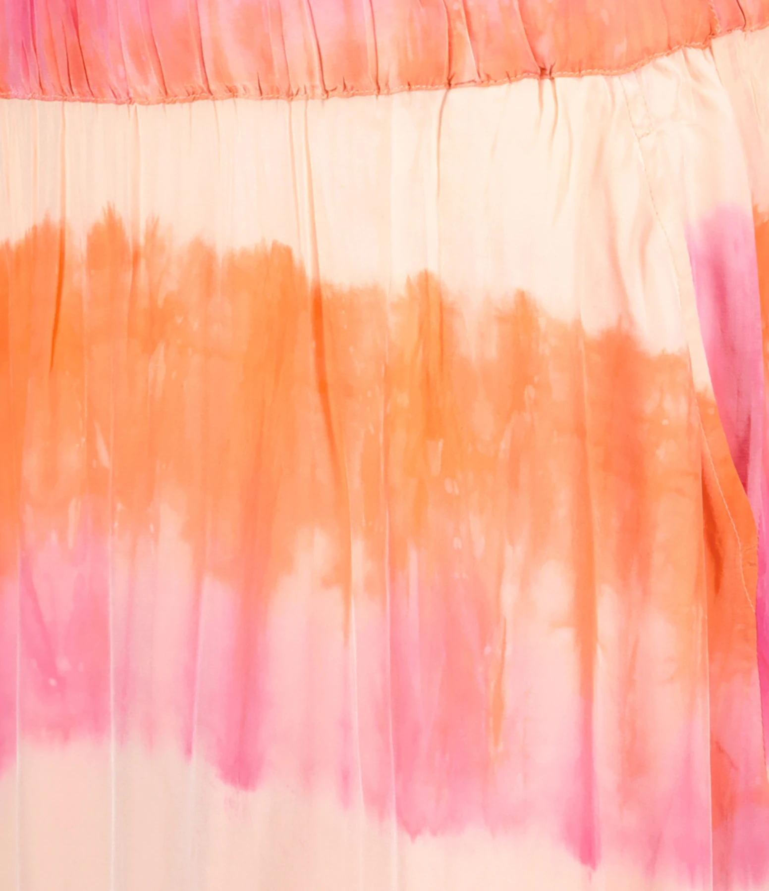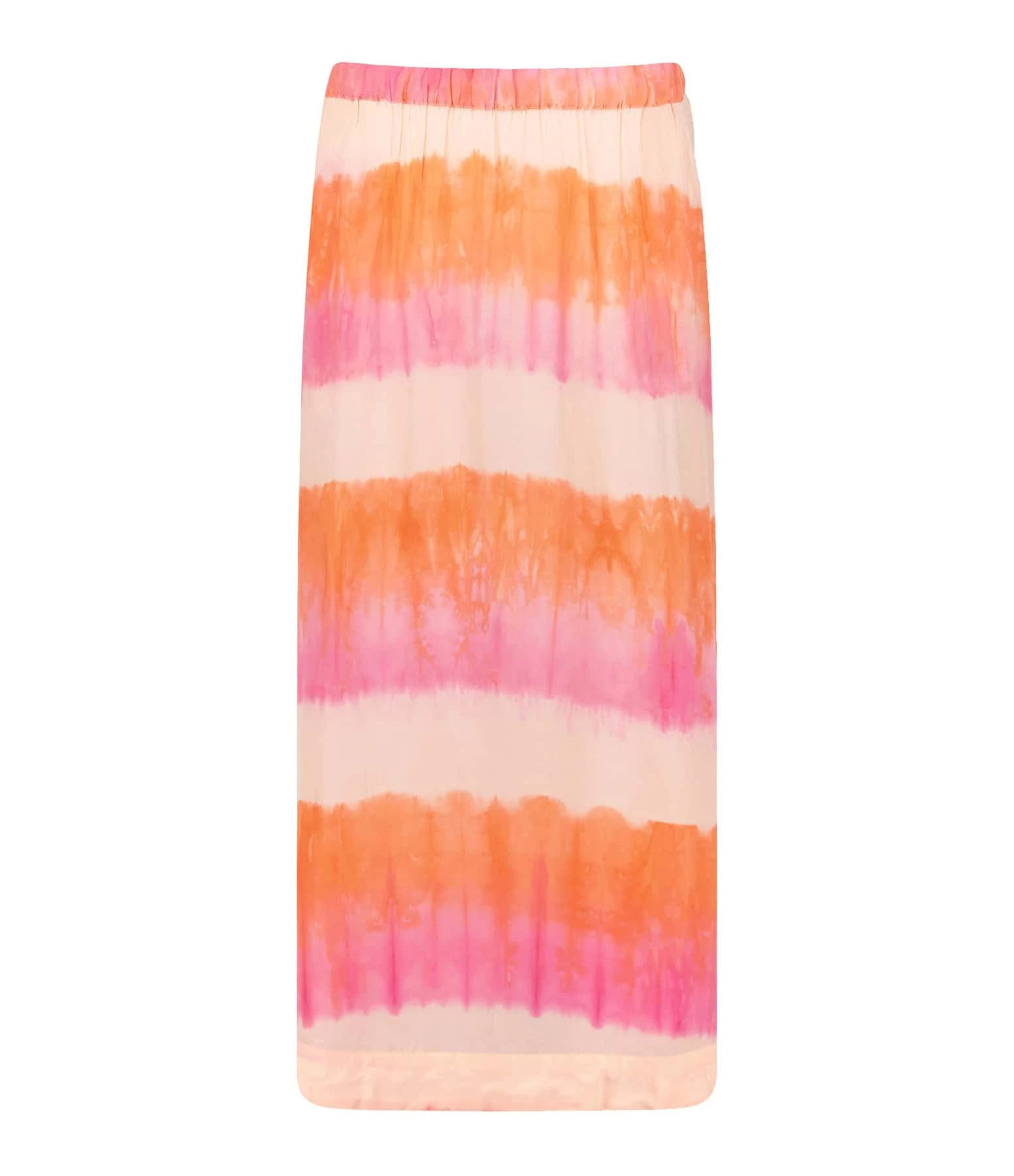 Jupe à imprimé orange et rose effet rayures tie & dye. Taille élastiquée. Deux poches italiennes. Coupe ample. Base droite.