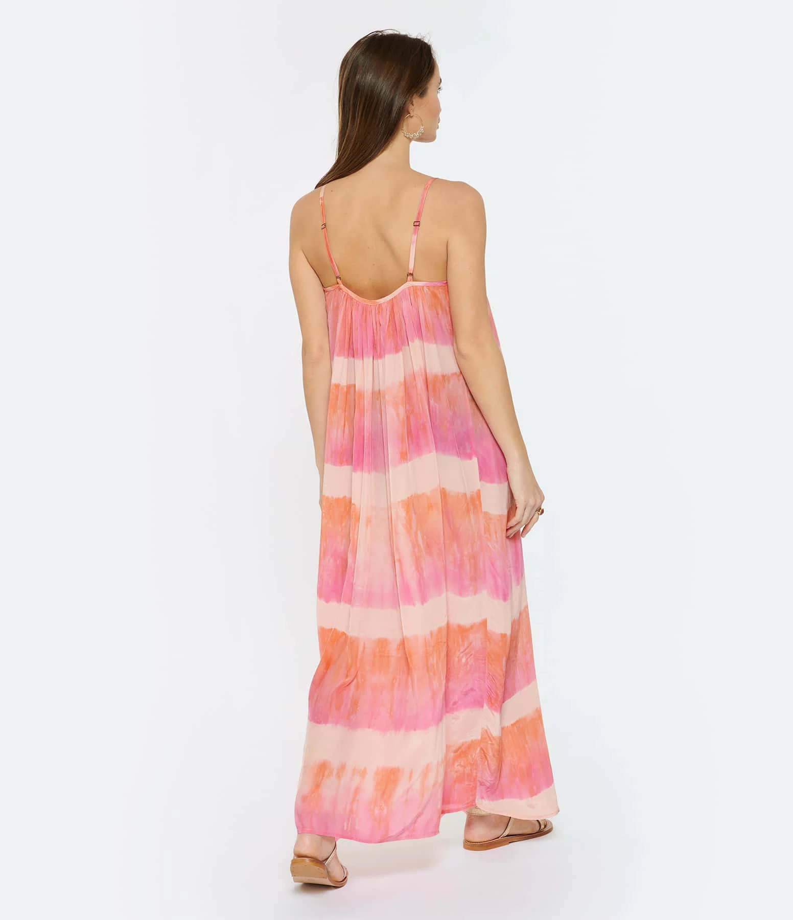 Robe longue à imprimé rose et corail. Bretelles réglables. Coupe ample. Base arrondie. Non doublée.
