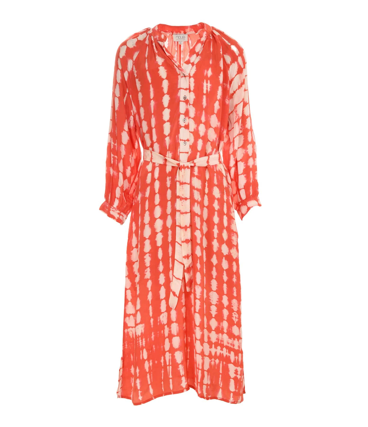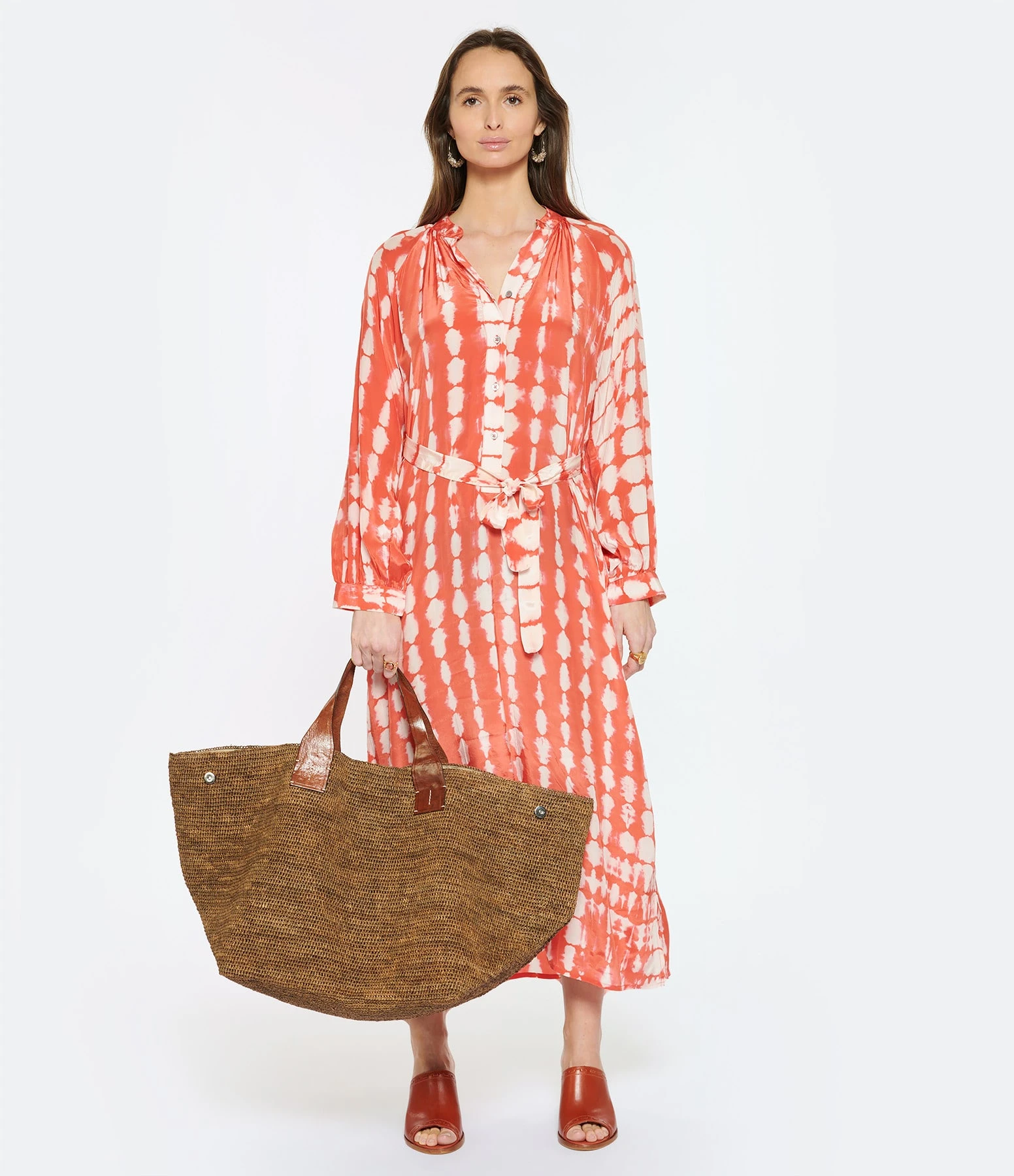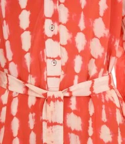 Robe longue en soie à imprimé rouge et beige. Col V. Manches longues. Fermeture boutonnée. Deux poches fendues. Ceinture à nouer à la taille. Coupe ample. Base droite. Non doublée.