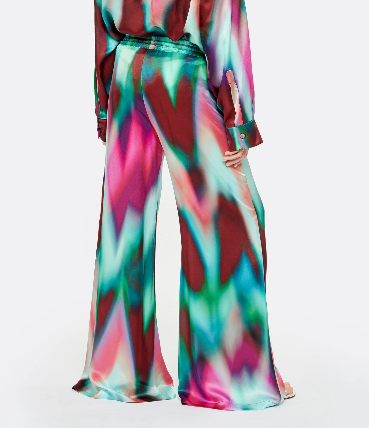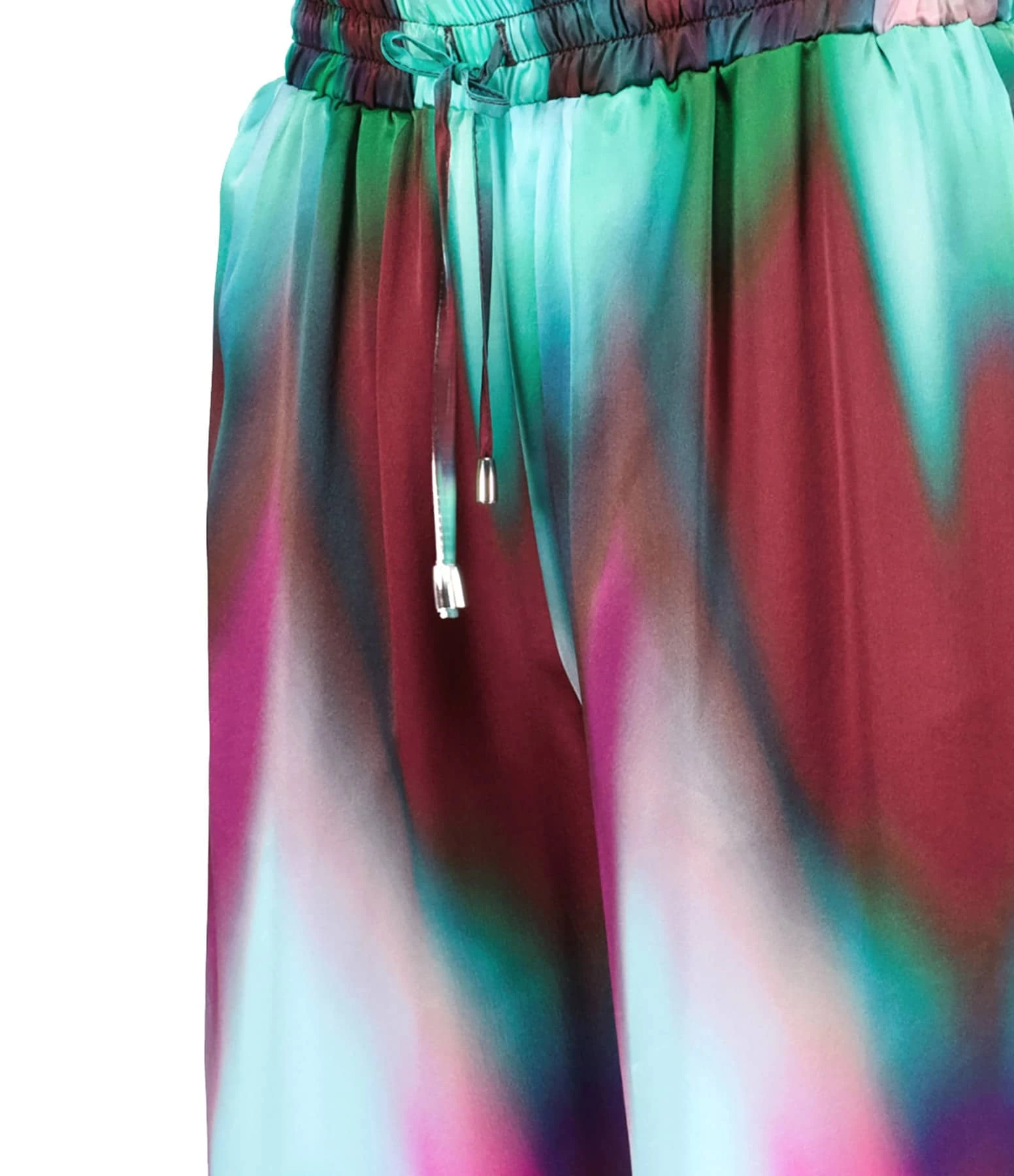 Pantalon fluide en soie à imprimé tie and dye multicolore. Taille haute élastiquée avec liens de serrage. Deux poches italiennes sur le devant. Coupe large. Base droite.