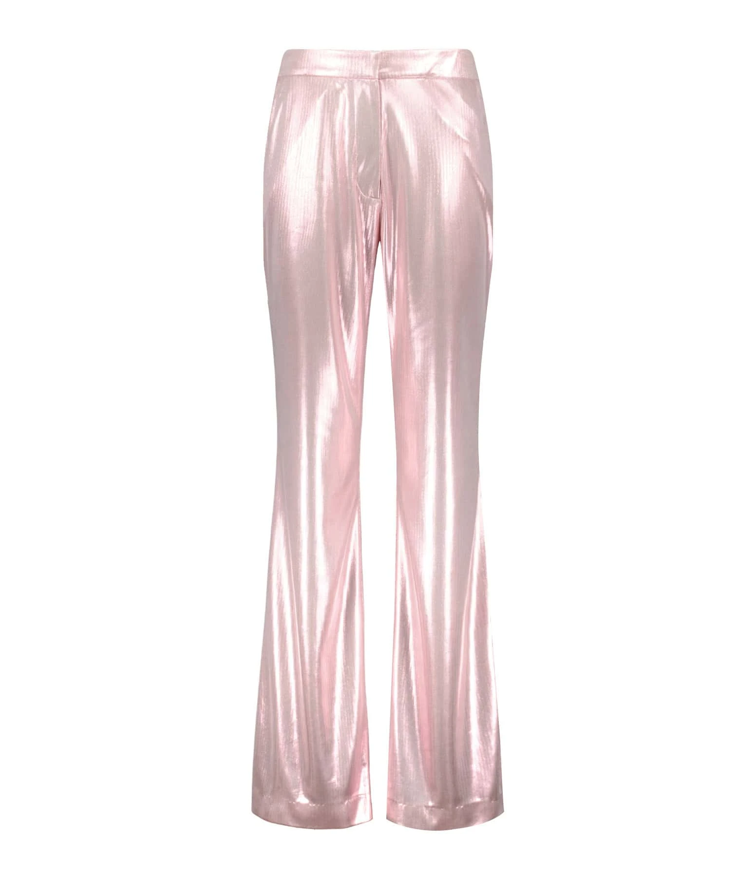 Pantalon fluide rose métallique. Fermeture zippée et par crochet invisible sir le devant. Deux poches passepoilées à l’arrière. Deux poches raglans sur le devant. Coupe droite. Base droite.