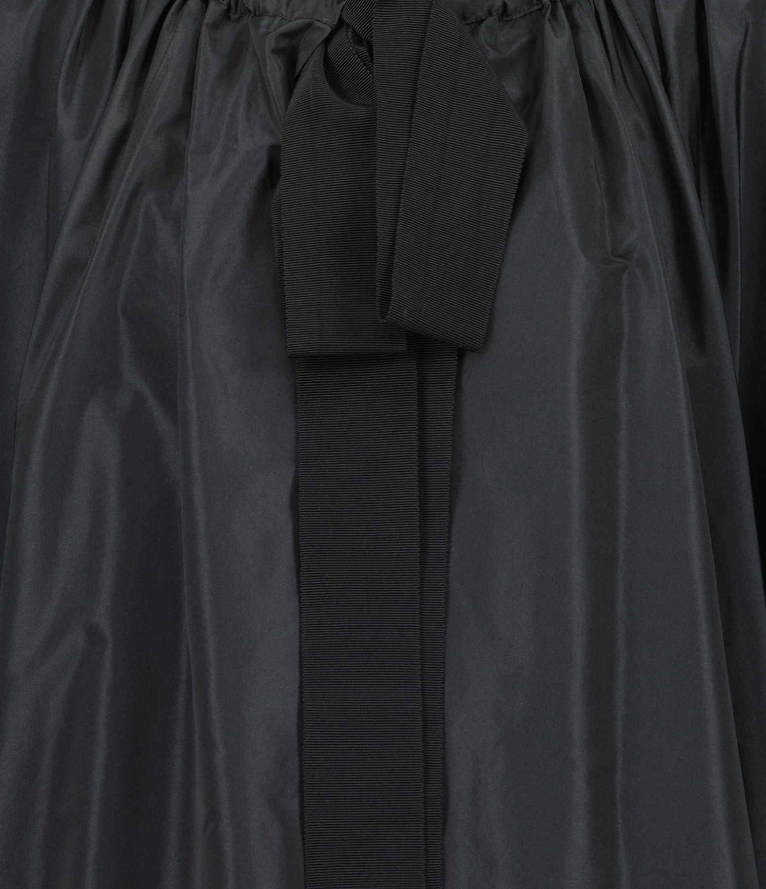 Robe ample en coton noir à volants. Manches trois-quarts bouffantes. Col rond froncé ajustable avec cordons de serrage sur le devant. Volants sur le bas.