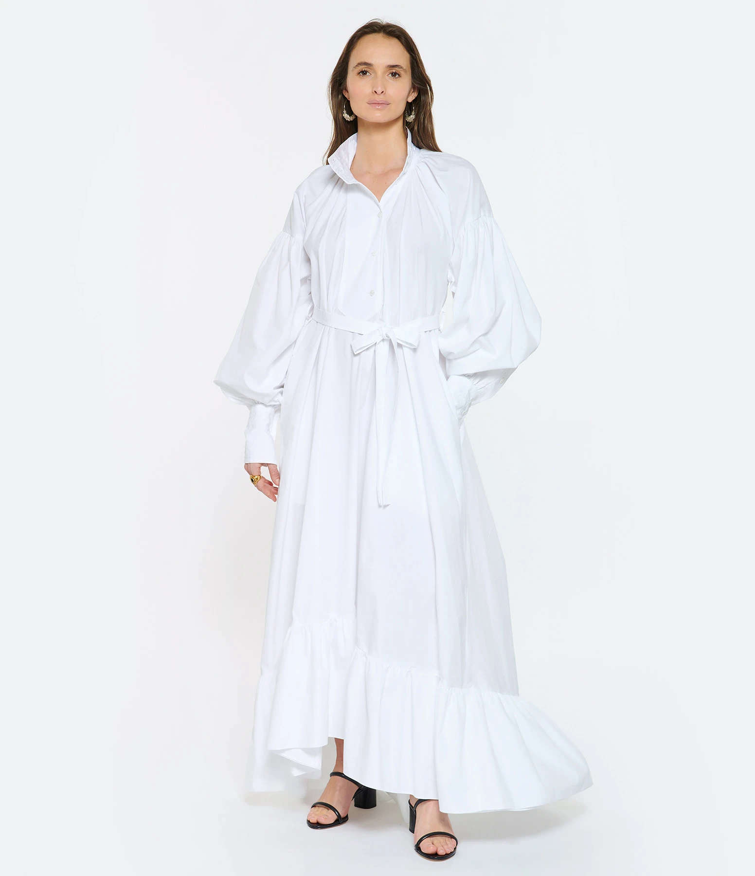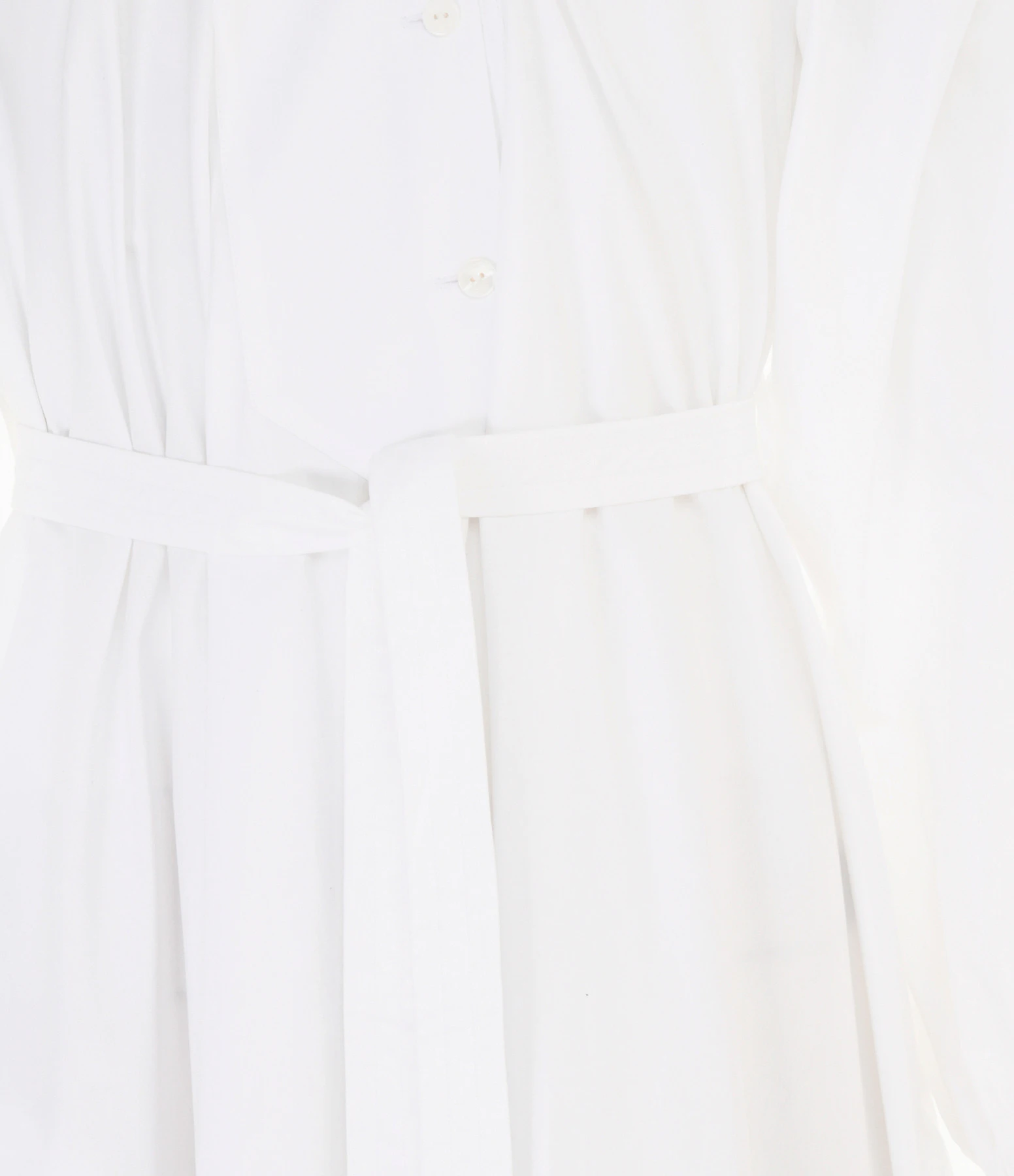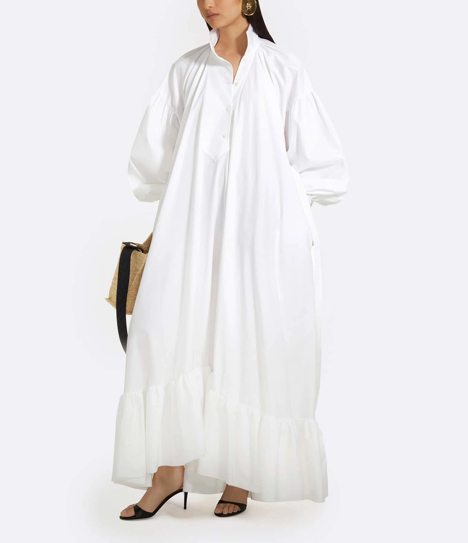 Robe longue en popeline de coton blanc. Col montant avec boutonnage décentré. Fronces à l’encolure. Manches volumineuses avec poignets boutonnés. Poches latérales. Volants sur le bas de la robe. Coupe ample. Base droite, plus longue à l’arrière.