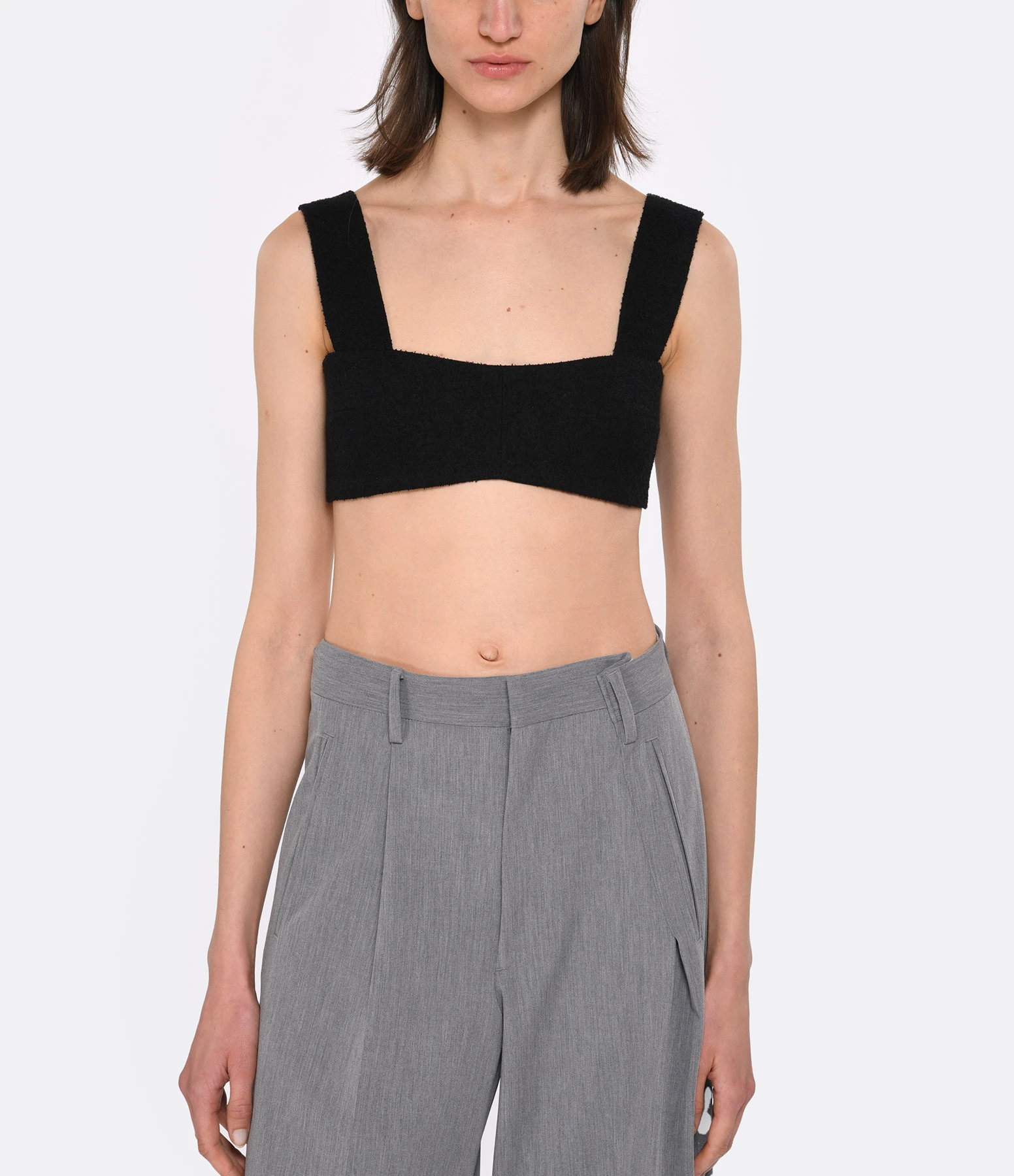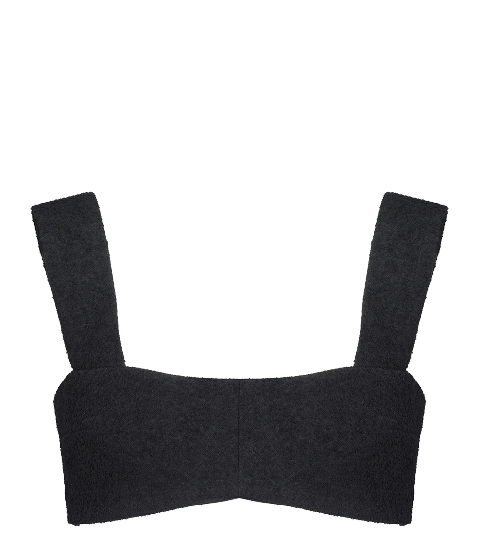 Top en tweed de coton mélangé noir. Bretelles larges. Encolure cœur. Zip doré avec tirette JP signature au dos.